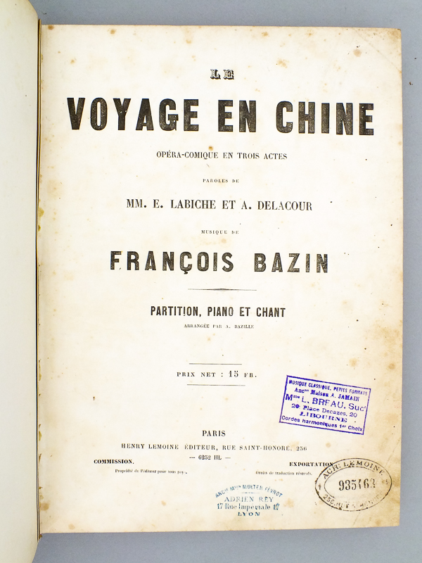 Le Voyage en Chine. Opéra-comique en trois actes. Paroles de MM. E. Labiche et A Delacour, musique de François Bazin. - Auteur: BAZIN, François ; LABICHE [ Eugène ] ; DELACOUR [ Alfred ] - Année d'édition: 1874