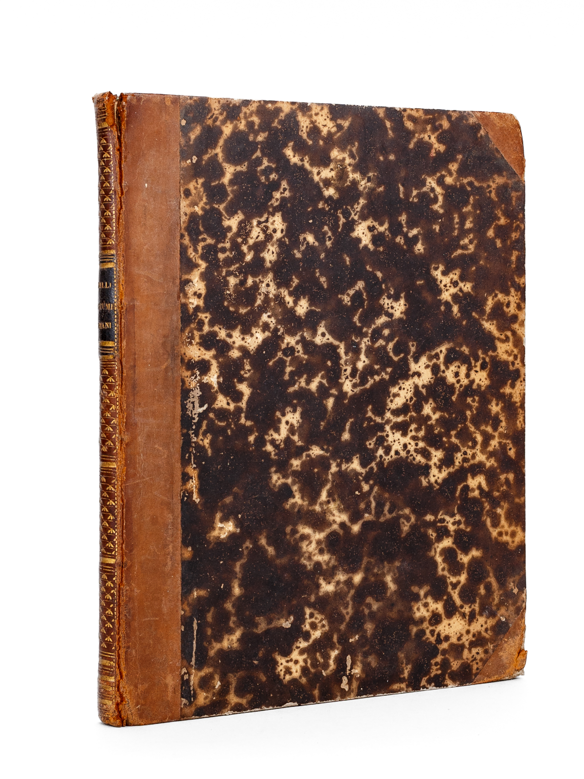 1 vol. in-8 reliure de l'époque demi-veau à petits coins, dos lisse orné, Presso Lorenzo Lazzari, Roma, 1810, avec 50 eaux-fortes (y compris le feuillet de titre) Commentaire : Bon état (des rouss., fentes partielles en mors, ex-libris ms. 'Henry de Cessoles') pour cet exemplaire bien complet des 50 eaux-fortes (y compris la page de titre) du célèbre artiste italien Bartolemeo Pinelli (1781-1835). Les sujets sont très divers : 'Miserabile in Carretta', 'Zi Pasquale cieco, improvisando ritornelli amorosi', 'Trasteverino', 'Penitenti detti i Sacconi', 'Il Callararo', 'Eremita e Donna di Frascati', Costumi di Rocca di Papa', 'Donna di la Provincia di Salerno', etc. etc.