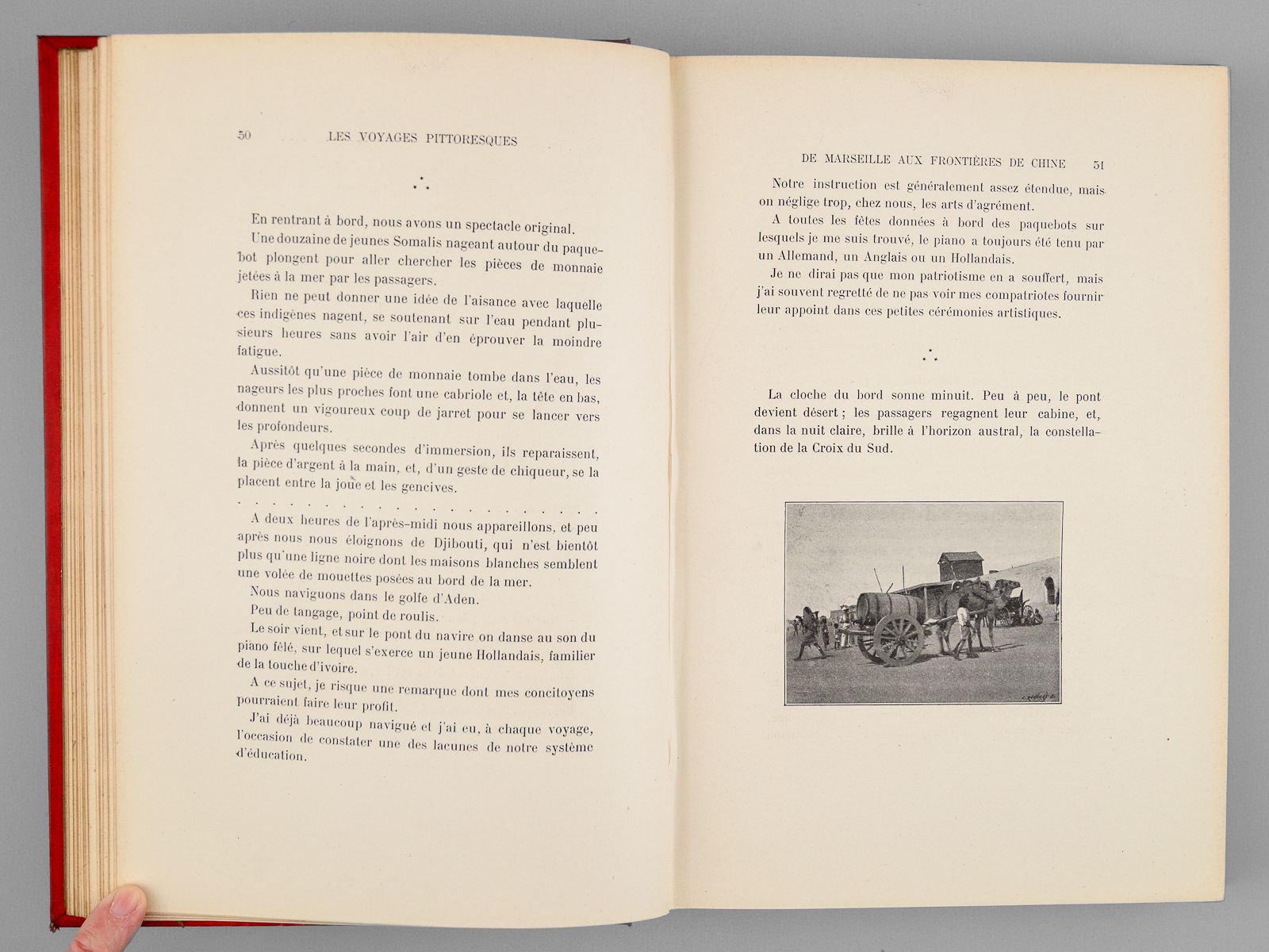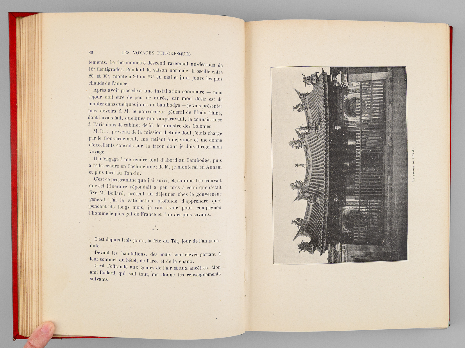 Commentaire : Bon exemplaire en très bon état, dans son superbe cartonnage polychrome (infimes frott. au cartonnage, ex-dono ancien au crayon en garde, très bel état par ailleurs). L'ouvrage décrit le voyage au départ de Marseille à bord du navire 'Calédonien'. Le voyage commence par une traversée de la Méditerranée (passage par Bonifacio et Messine), avant de franchir le canal de Suez pour rejoindre la mer Rouge. Après une escale à Djibouti et Colombo, l'auteur arrive à Singapour, puis à Saïgon, début de son exploration de l'Indochine française. Le voyage se concentre alors sur le Cambodge, avec des descriptions détaillées de Pnom-Penh et des ruines d'Angkor-la-Grande. Le texte évoque les rencontres avec la royauté locale, notamment le roi Norodom, mais détaille également les moeurs et remèdes traditionnels des populations cambodgiennes. On continue le voyage vers l'Annam (Tourane et Hué, où il est reçu en audience par l'empereur Thanh-Thay), puis vers le Tonkin et à la remontée du fleuve Rouge jusqu'au Yunnan, en Chine. On y croise les lieux emblématiques comme la baie d'Along, mais également les aspects plus sombres ou insolites du voyage : la piraterie, les supplices, les fumeries d'opium et la vie dans les auberges du Tonkin. Après des étapes à Hong-Kong et Canton, l'auteur évoque le pays des Moïs puis le récit se termine par le retour de l'expédition.