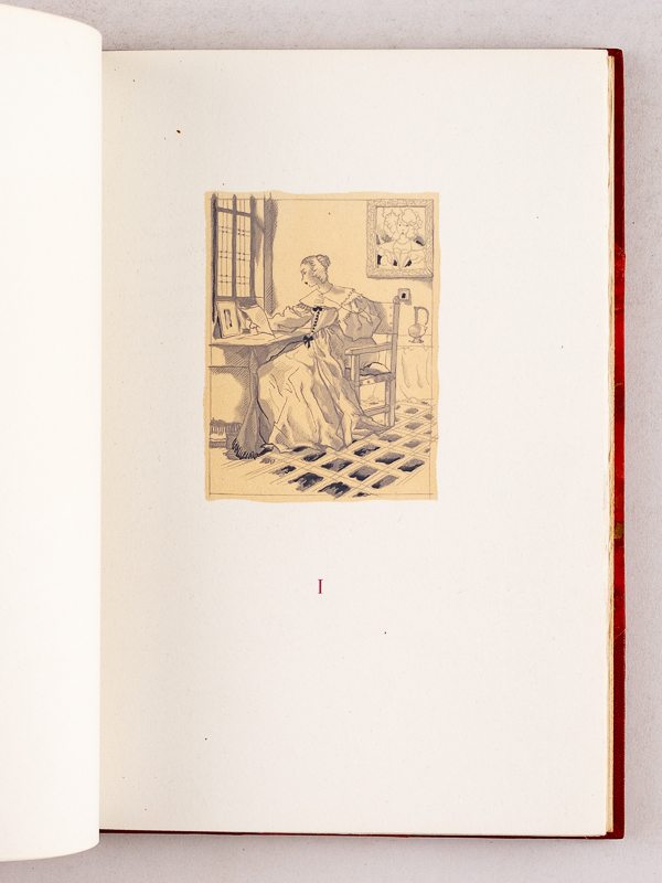 Illustrations de Paul Jarach, gravées sur bois par G. Poilliot, un des 425 exemplaires sur vélin de Rives numérotés (n° 227), 1 vol. in-8 reliure demi-maroquin à coins rouge, dos à 4 nerfs, tête dorée, couv. conservées, Editions A. & P. Jarach, Paris, 1944, 76 pp. Commentaire : Bel exemplaire très bien relié (petit frott à une coupe, très bel état par ailleurs) de cet ouvrage que Tristan Klingsor n'hésita pas à qualifier de 'petit chef-d'oeuvre'. Rédigée dans le style du XVIIe siècle, cette historiette est une comédie tendre et mélancolique qui n'épargne pas les médecins.