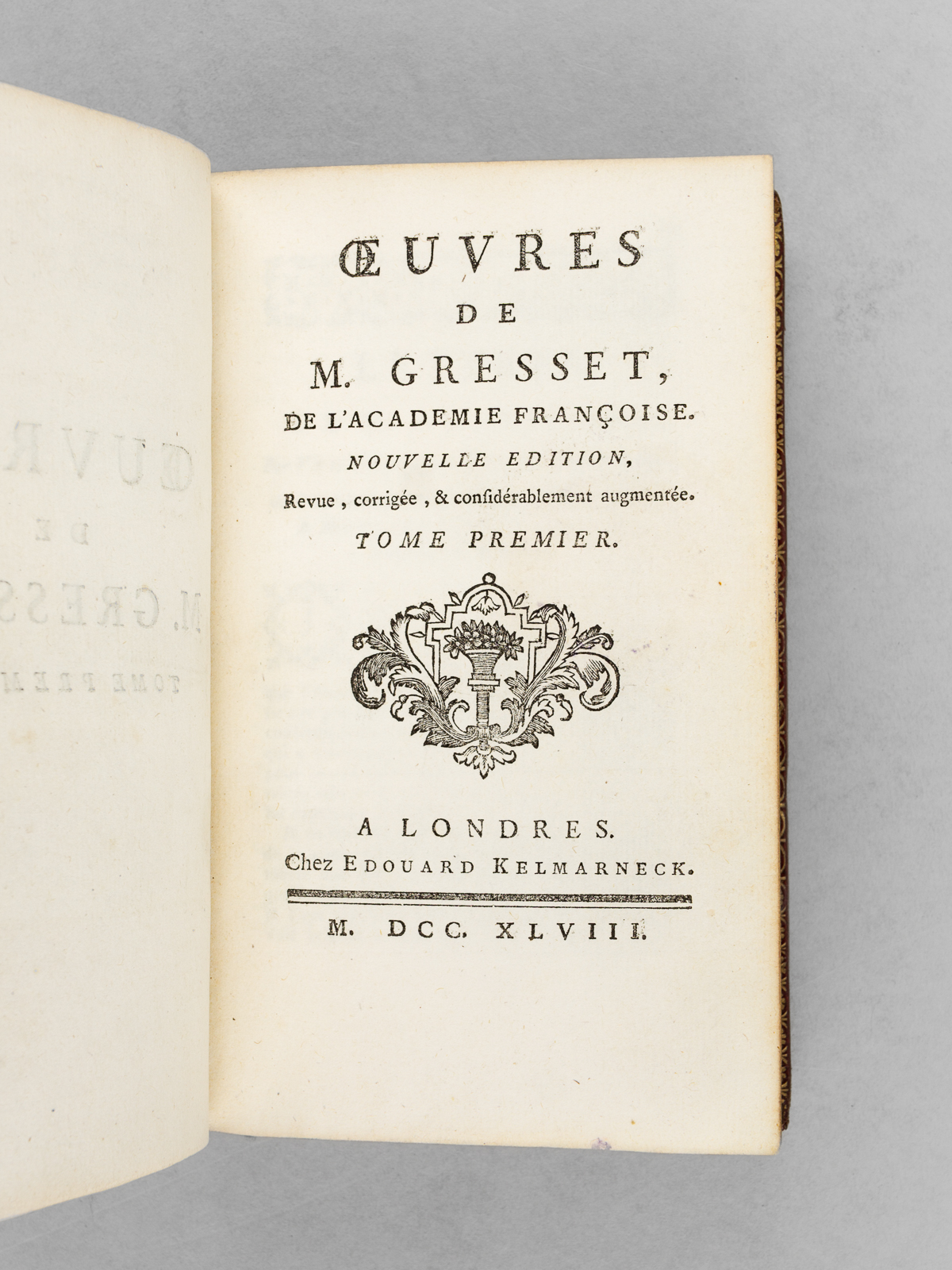 Nouvelle édition, Revue, corrigée & considérablement augmentée, 1 vol. in-12 reliure de l'époque plein maroquin rouge, dos à 5 nerfs dorés orné, triple filet d'encadrement aux plats, toutes tranches dorées, gardes de tabis bleu, Chez Edouard Kelmarneck, A Londres, 1748, 1 f., x-310-360 pp. et 1 f. blanc Commentaire : Rare et bel exemplaire des oeuvres de Gresset en plein maroquin du temps (petit mq. de tabis à une garde, très bel état par ailleurs).