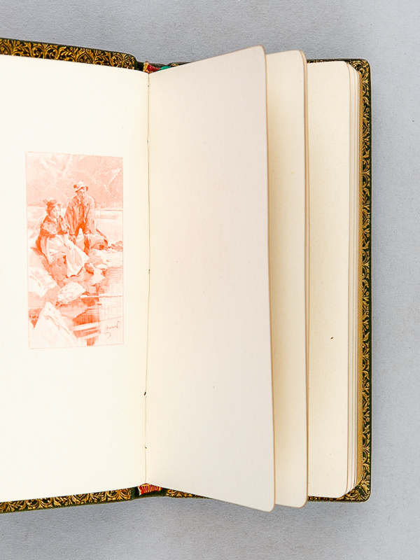 Illustrations de L. Marold, avec double suite des hors texte en sanguine, 1 vol. in-18 reliure plein maroquin vert, dos à 5 nerfs, lotus bleu mosaïqué au plat sup., chasses ornées, toutes tranches dorées, gardes moirées, première garde ornée d'un lotus doré (monogrammé XSX), couv. cons., date en queue, Nouvelles Collections Guillaume 'Lotus Bleu', Librairie Borel, E. Guillaume, Paris, 1897, 10 ff., 72 pp., 4 ff. n. ch. Commentaire : Bon exemplaire superbement relié en plein maroquin orné de la belle fleur de lotus emblème de la collection (dos un peu foncé, 2 infimes petits mq. au plat sup)