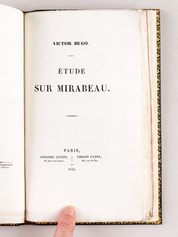 Commentaire : Rare et très bel exemplaire très frais de l'édition originale, bien complet de la première couverture et surtout des feuillets d'annonces, qui manquent le plus souvent. Parue le 15 janvier 1834, cette rare plaquette révèle Victor Hugo tout autant que Mirabeau ! Carteret, I, 406 ; Vicaire, IV, 281