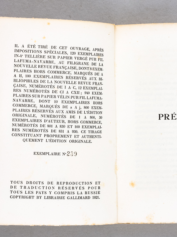 E.O., exemplaire sur vélin pur fil Lafuma-Navarre, Préface de Marcel Proust, 1 vol. in-8 br., Editions de la Nouvelle Revue Française, Paris, 1921, 153 pp. Commentaire : Edition originale. Etat très satisfaisant (petit frott. en coiffe sup.n bon exemplaire par ailleurs).