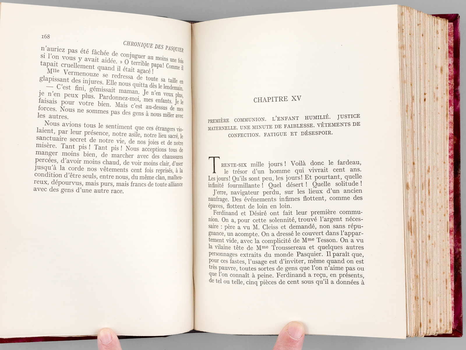 Un des 8000 exemplaires sur vélin hélio supérieur, 5 vol. in-8 carré reliure demi-chagrin maroquiné bordeaux, dos à 4 nerfs, couvertures et dos conservés, Mercure de France, Paris, 1947 Commentaire : Bel exemplaire du célèbre cycle romanesque en 10 tomes, dédicacé par Georges Duhamel 'au docteur Robert Thibaut, ami des livres & des lettres'. Bel exemplaire (lég. rouss. sur tranches, très bon état par ailleurs, ex-libris Robert et Roland Thibaut).