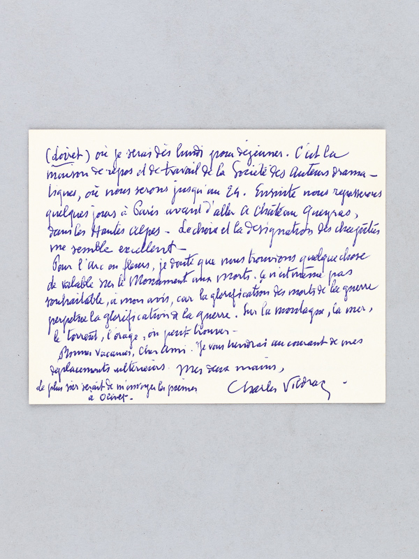 1 L.A.S. de 2 pp. sur carte de visite : 'Cher ami, J'ai reçu votre lettre il y a trois jours, au moment même où j'étais happé par les Concours du Conservatoire qui ont pris fin hier - Je quitte Paris lundi 12. Si vous m'expédiez ici le dossier, et qu'il faille vous le retourner avant le 13, cette dernière opération me paraît impossible : ne pourriez-vous me donner une adresse et m'accorder quelques jours ? Vous m'expédierez les poèmes soit à Paris pour lundi matin (je partirai après le courrier), ou au Château du Grondon, à Olivet (Loiret), où je serai dès lundi pour déjeuner. C'est la maison de repos et de travail de la Société des Auteurs dramatiques, où nous serons jusqu'au 24. Ensuite nous repasserons quelques jours à Paris avant d'aller à Château Queyras, dans les Hautes Alpes. Le choix et la désignation des chapitres me semble excellent. Pour l'Arc en Fleurs, je doute que nous trouvions quelque chose de valable sur le Monument aux Morts. Ce n'est même pas souhaitable, à mon avis, car la glorification des morts de la guerre perpétue la glorification de la guerre. Sur la montagne, la mer, le torrent, l'orage, on peut trouver. ... ' Commentaire : L.A.S. du poète et écrivain Charles Vildrac (1882 - 1971), dans laquelle se manifeste son pacifisme. Cette lettre s'intègre dans une correspondance avec l'écrivain et érudit Armand Got, responsable éditorial de 'La Poèmeraie - Cahiers anthologiques modernes', recueil de poésies à destination des enfants.