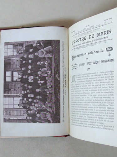 3 vol. relié demi-toile (Messager) et 31 vol. reliés demi-toile à coins rouge ou marron (Apôtre de Marie), couvertures conservées, Institut Sainte Marie, Nivelles, 1904-1946 ; Le Messager de la Société de Marie [1897-1902 : 3 Tomes - Complet Suivi de :] L'Apôtre de Marie. Echo des Oeuvres et des Missions de la Société de Marie (Série suivie complète du n° 1 de Mai-Juin 1904 au n° 338 de Septembre-Octobre 1946 en 31 volumes reliés ) [ Exceptionnel ensemble, souvent illustré, relatant les progrès des missions marianistes en Europe, Amérique, Afrique, et surtout au Japon - Important and scarce review referring to Marianist missions in the entire world, with focus on american or japanese missions in Urakami, Tokyo, etc. ]