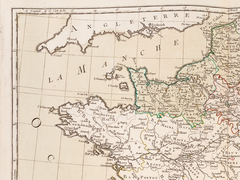1 carte au format 36 x 45 cm (50 x 64 cm en marges), partiellement rehaussée en coloris d'époque, carte n° 28 de l'atlas, Chez le Sr Desnos, Libraire et Ingénieur Géographe pour les Globes et Sphères, gravée par Chambon, s.d. [1767]