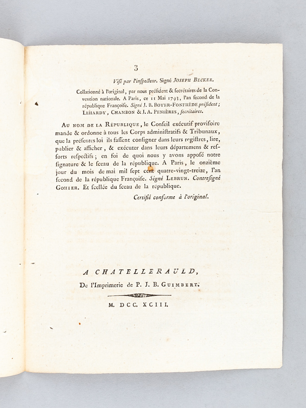 1 brochure in-4, De l'Imprimerie de P. J. Guimbert, Chatelleraud, 1793, 3 pp. Commentaire : Etat très satisfaisant (à toutes marges)