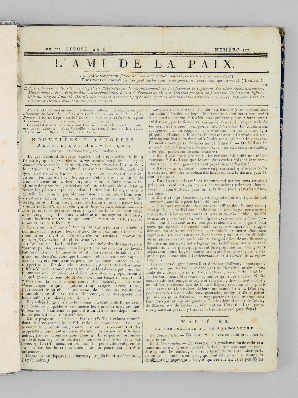 L'Ami de la Paix. (29 Numéros : Du numéro 119 du 30 Frimaire an 8 au numéro 146 du 27 Nivôse an 8, et numéro 149 du 28 Nivôse an 8 ) [ Du 21 décembre 1799 au 18 Janvier 1800 ]