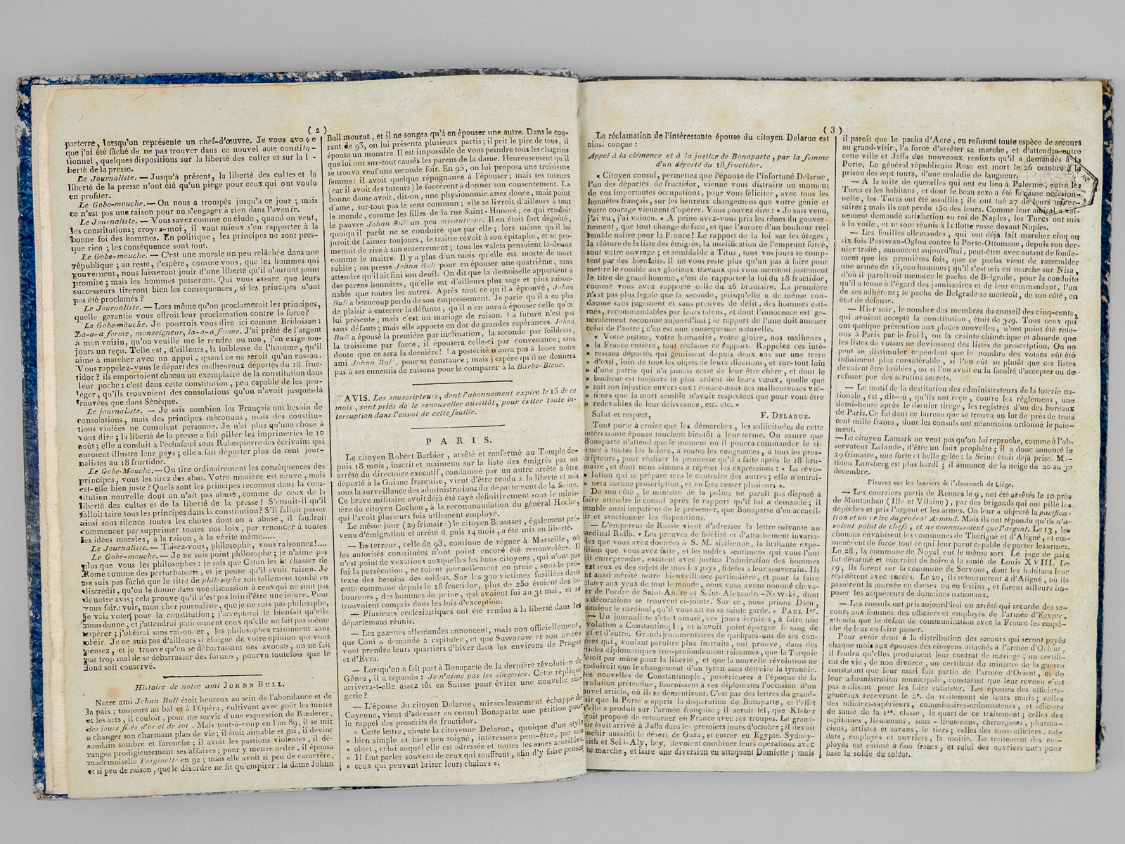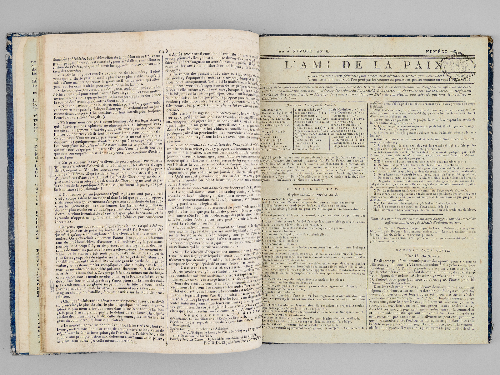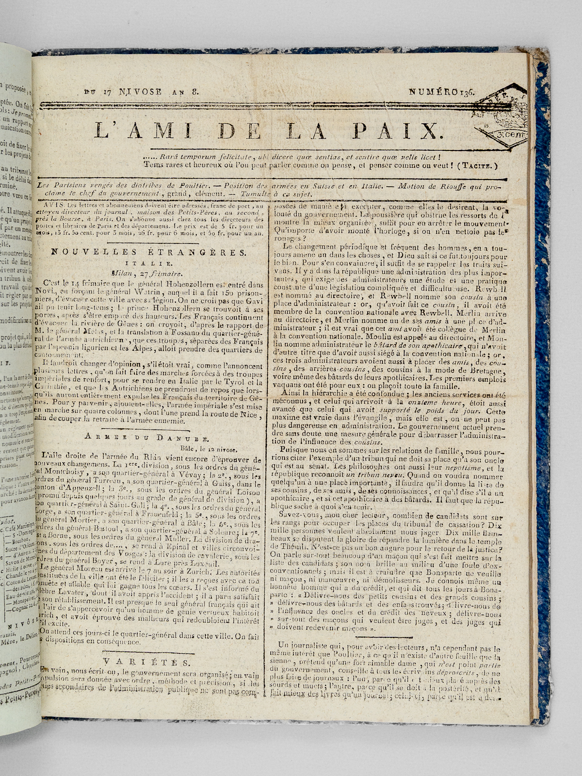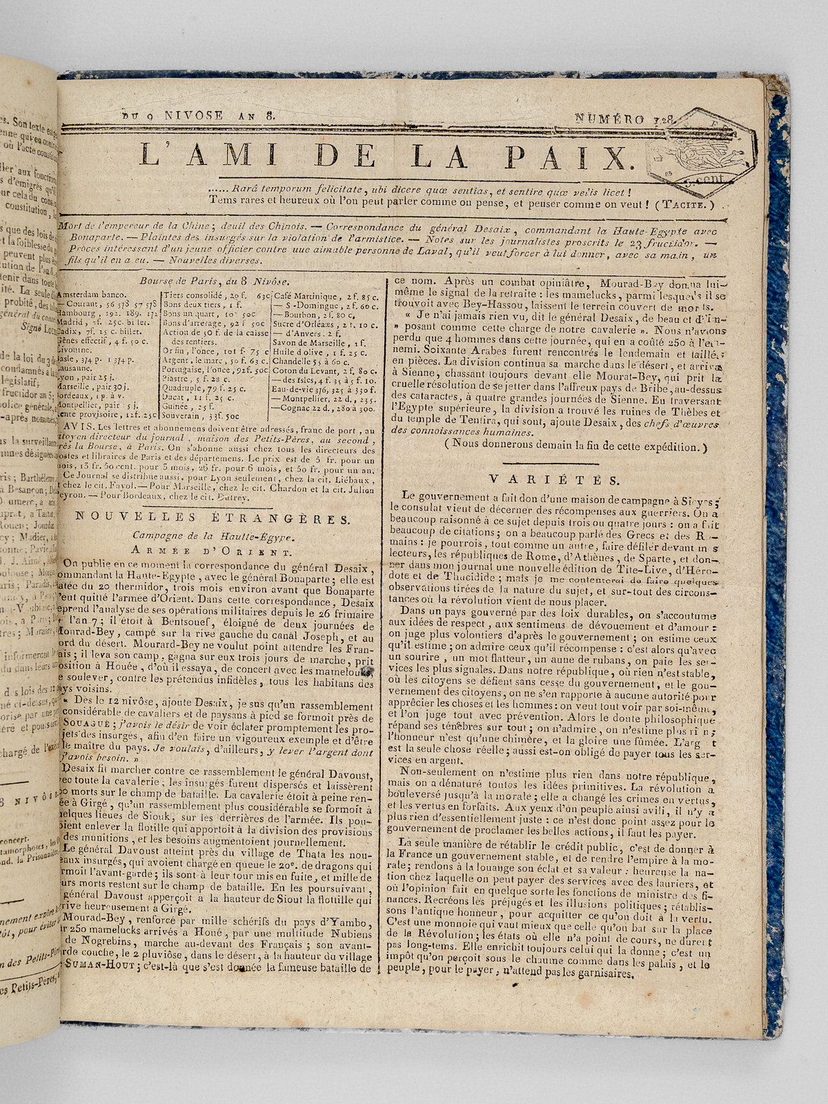 1 vol. in-4 cartonnage bleu de l'époque, Paris, 1799-1800, 116 pp. (4 pp. par numéros) ; le numéro 119 est relié in fine : L'Ami de la Paix. (29 Numéros : Du numéro 119 du 30 Frimaire an 8 au numéro 146 du 27 Nivôse an 8, et numéro 149 du 28 Nivôse an 8 ) [ Du 21 décembre 1799 au 18 Janvier 1800 ] Commentaire : En se fondant sur la série conservée par la Bibliothèque Nationale, Hatin indique par erreur seulement 121 numéro (Hatin, 284). Le présent exemplaire complète la série de la BNF. Au lendemain du 18 Brumaire, la France est en pleine transition. Le 30 Frimaire la Constitution de l'An VIII est soumise au vote et consacre le Consulat. Le 27 Nivôse, la censure s'affirme avec la réduction à seulement 13 des journaux politiques parisiens. On évoque également dans ces pages les négociations avec les Chouans et l'on y trouvera la proclamation de Bonaparte 'aux rebelles de l'Ouest'. Bon état pour cette série de toute rareté (qq. annotations, minuscule travail de vers en marge intérieure dans les derniers ff.)