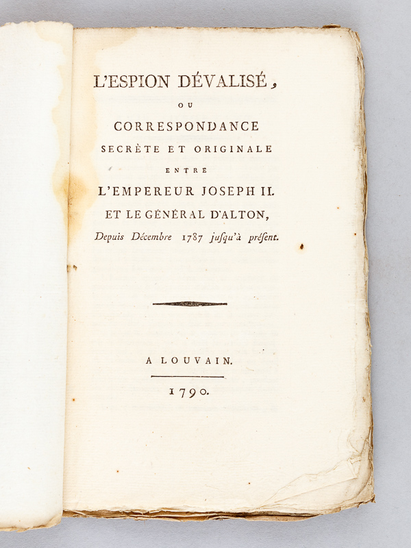 L'Espion Dévalisé ou Correspondance Secrète et Originale entre l'Empereur Joseph II et le Général d'Alton, depuis décembre 1787 jusqu'à présent. Correspondance Secrète et Originale de l'Empereur Joseph II avec le Général d'Alton ; 1 vol. in-8 br. sous couv. d'attente, sans nom, A Louvain, 1790, 71 pp.