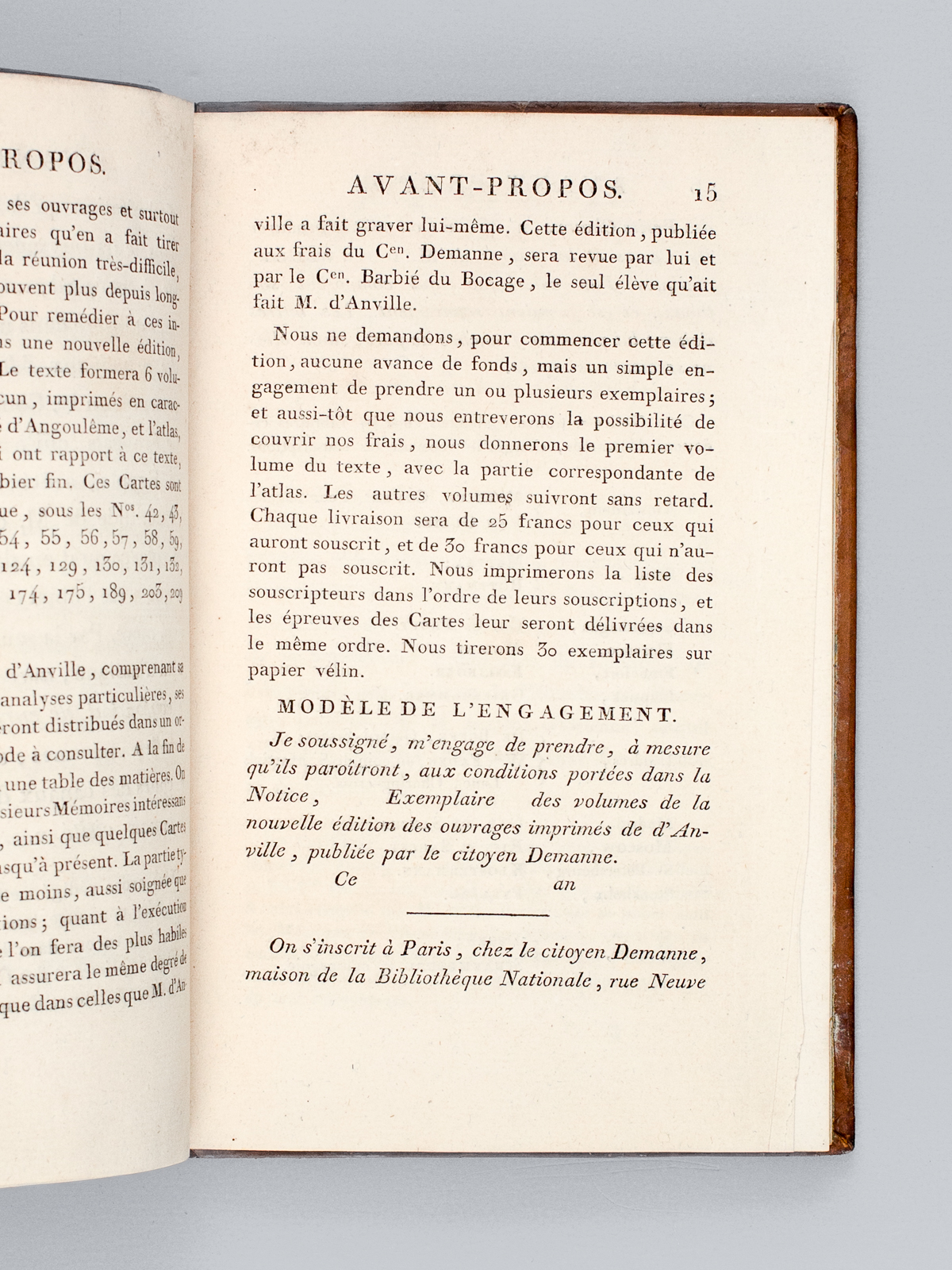 Commentaire : Rare exemplaire de l'édition originale du catalogue des oeuvres du grand géographe et cartographe Jean-Baptiste Bourguignon d'Anville (1697-1782). Oeuvre de Louis de Manne, conservateur de la Bibliothèque du Roi et héritier du fonds de d'Anville, l'ouvrage s'ouvre sur un intéressant avant-propos (où l'on évoque notamment le 'citoyen Barbié du Bocage, le seul élève qu'ait fait M. d'Anville'), se continue sur un 'Eloge' de d'Anville par Dacier, puis propose un long 'Catalogue des Cartes gravées d'après les dessins de M. d'Anville, dans lequel on a distingué par un astérisque celles qui composent son fonds', et in fine, un 'Catalogue des Ouvrages imprimés de M. d'Anville, par ordre de date, Suivi de l'indication de ses Mémoires qui sont insérés dans les Recueils des Académies des Inscriptions et Belles-Lettres et des Sciences de Paris, et dans lequel on a distingué par un astérisque, les ouvrages de son fonds'. Bon état (petits frott. à la reliure, bon exemplaire par ailleurs, ex-libris en garde).