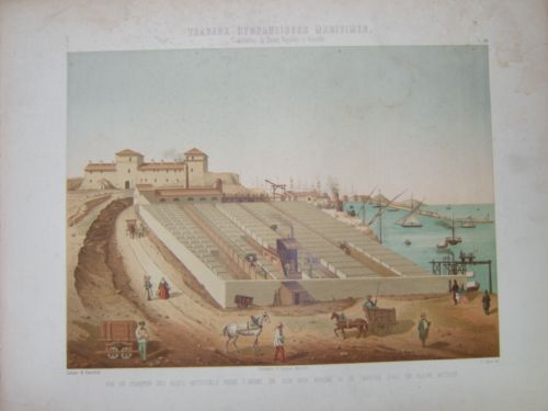 1 vol. in-folio oblong en feuilles sous chemise cartonnée, F. Canquoin, Marseille, 1861, avec 33 chromolithographies au format 53 x 42 cm. Rappel du titre complet : Travaux Hydrauliques Maritimes [Marseille ]. Ouvrage descriptif de l'Installation des chantiers pour l'exploitation des Blocs Naturels, la Confection des Blocs Artificiels et l'immersion de ces deux espèces de Blocs. Installation ayant servi à la construction de la Grande Jetée du large du Bassin Napoléon (Port de Marseille) Planches [ Planches I à VI, X à XIV, XVII, XIX à XXI, XXIII, XXIX à XXXI, XXXVIII, XL, XLII, XLIII, XLV à LV ]
