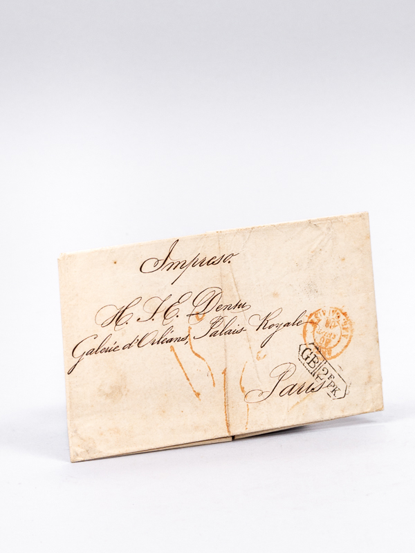 1 document imprimé grand in-8 de 2 pp., 1868, titre et adresse remplis à la plume. Rappel du titre complet : [ Courrier de Bruno Carranza au librairie français Edouard Dentu, datée de San José de Costa-Rica, Agosto 25 de 1868 ] Courrier imprimé avec adresse ('Impreso H. J. E. Dentu, Galerie d'Orléans, Palais Royale') et intitulé manuscrit à la plume, marque postale et surcharge GB 2FPK : 'San José de Costa-Rica, Agosto 25 de 1868. Senor M. J. E. Dentu, Paris, Mui Senor mio, Habiendo fundado en esta ciudad, desde ha muchos anos, un establiciemento de ciencias i artes &c. i deseandi estar continuamente al corriente de las nuevas producciones en cada uno de estos ramos, invito a U. para que con la direccion de 'Libreria del Album' San Jose de Costa Rica me remita todos los catalogis que sucesivamente vaya publicando. Estae establicimiento bien conocido en el pais i colocado en un punto central mui ventajoso, es el unico i mas a propositio para asegurar buen exito a los periodicos, tantos politicos como literarios, que se le recomendaran i para dar a conocer en esta Republica las obras nuevas en todo jenero. Me suscribo de U. atento i Servidor. Bruno Carranza'.