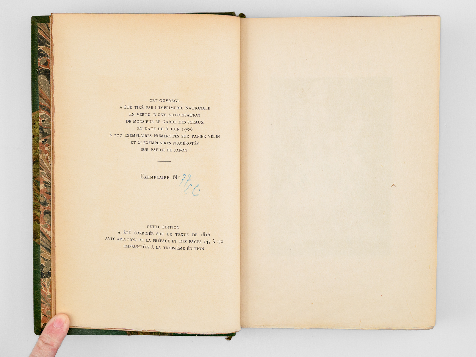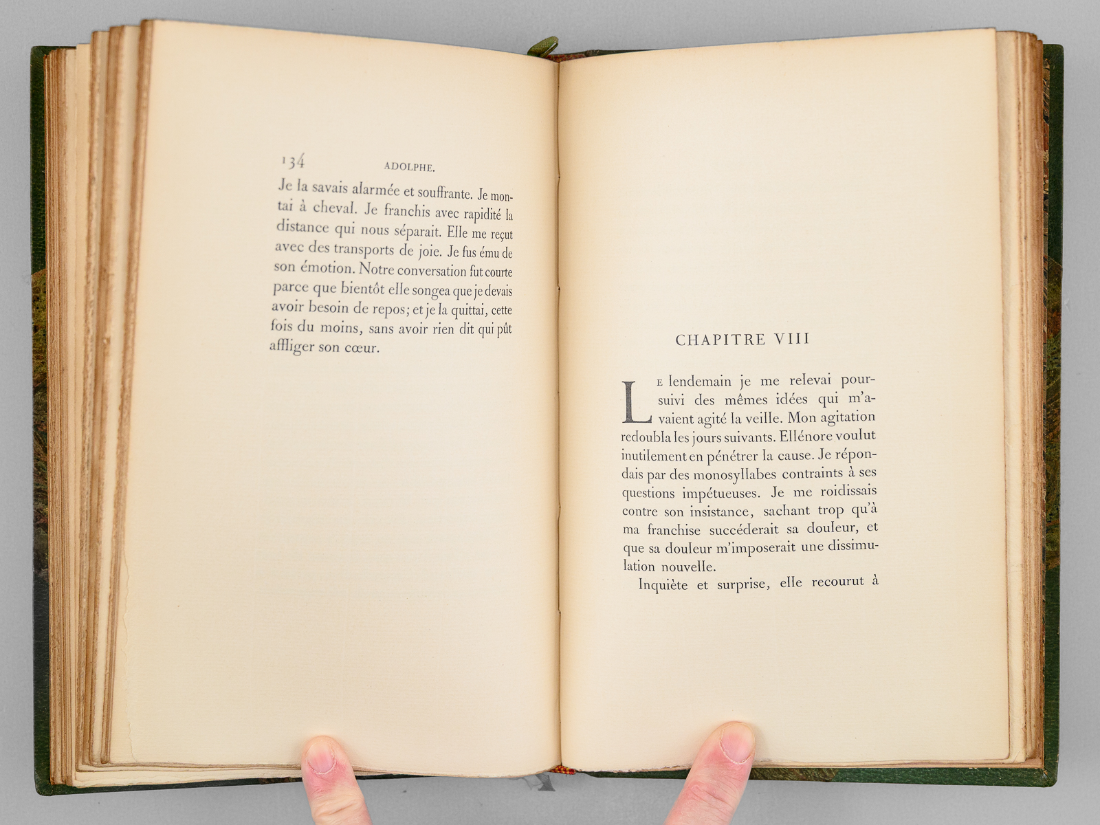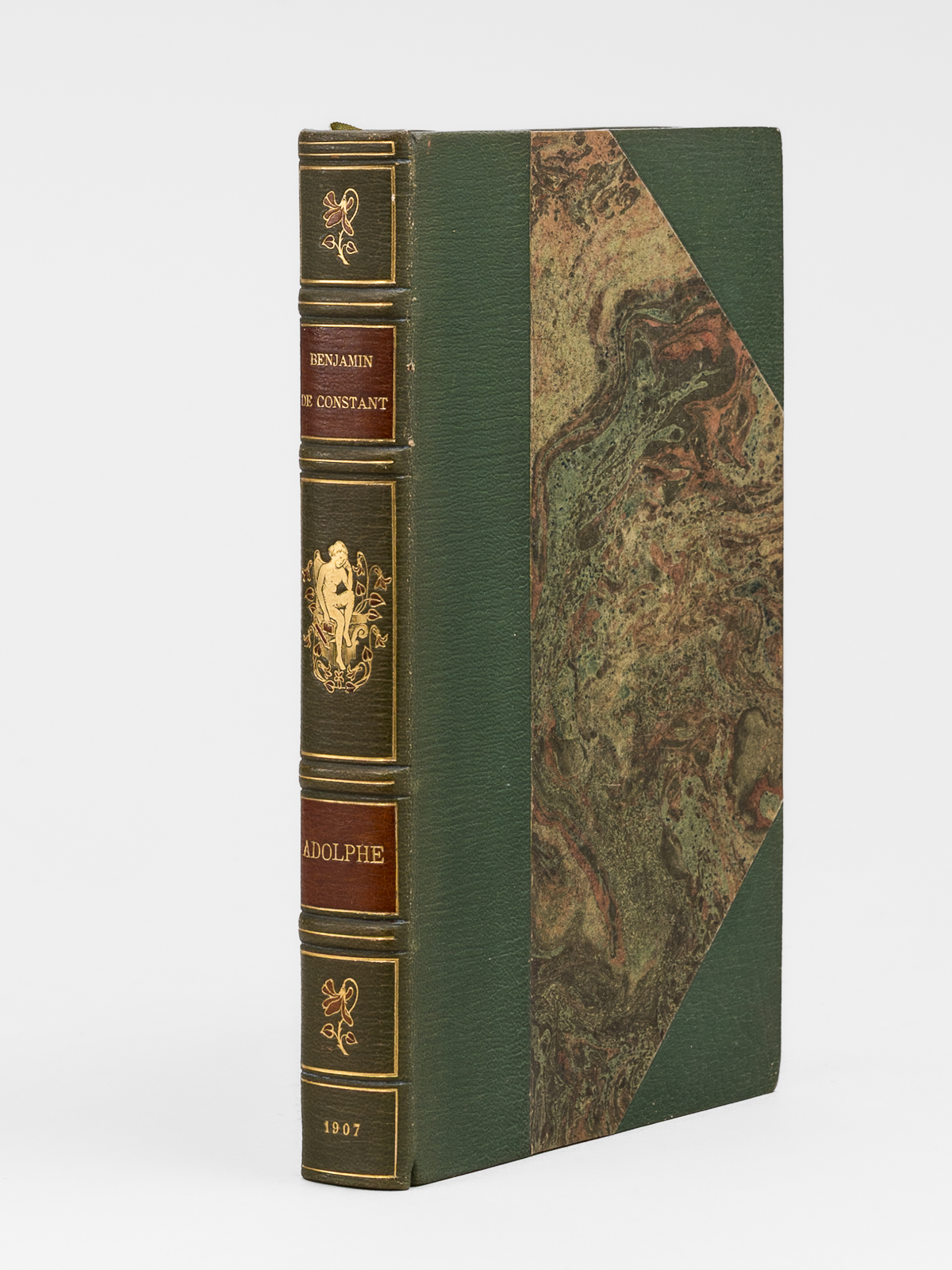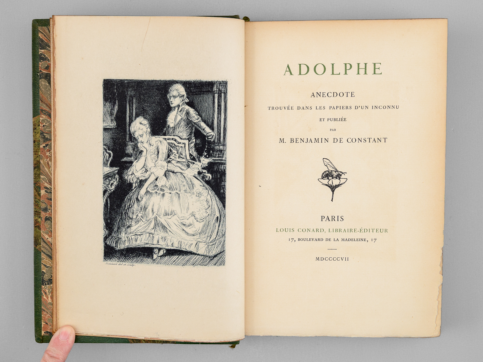 Tirage à 200 exemplaires numérotés sur papier vélin (n° 77 paraphé par l'éditeur), 1 vol. in-8 reliure de l'époque demi-maroquin à coins à grain long vert, dos mosaïqué à 5 nerfs dorés, tête dorée, couvertures et dos conservés, Louis Conard, Libraire-Éditeur, Paris, 1907, XI-194 pp. avec frontispice par Jeanniot Commentaire : Bel exemplaire très bien relié de ce petit tirage de bibliophile (petit choc sur un coin, très bel état par ailleurs).