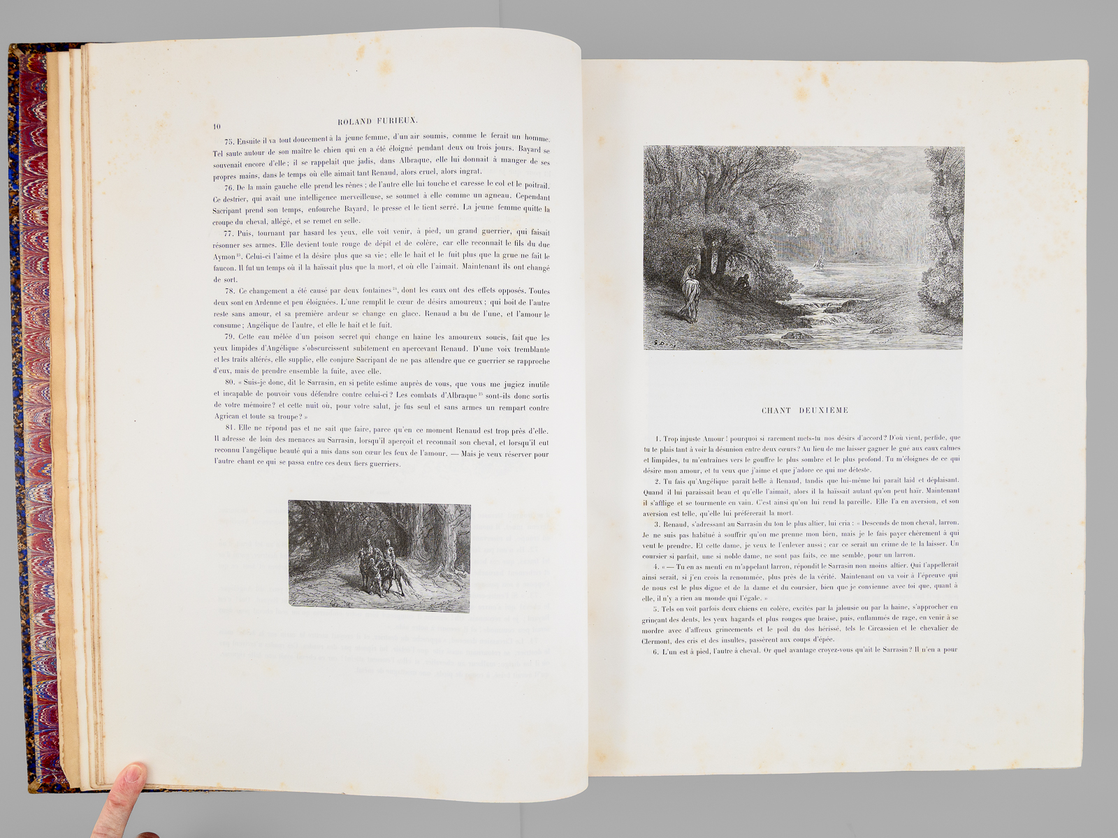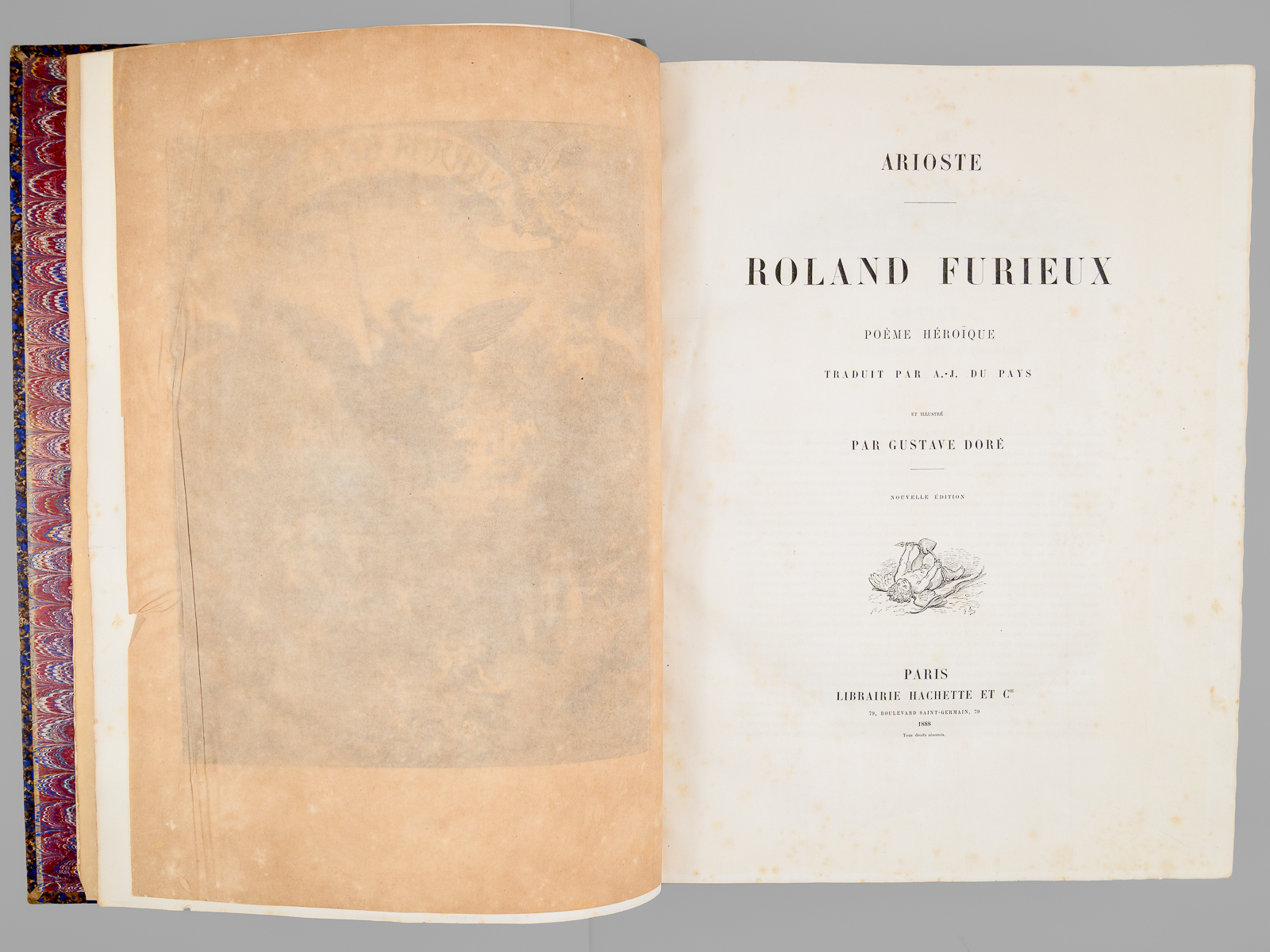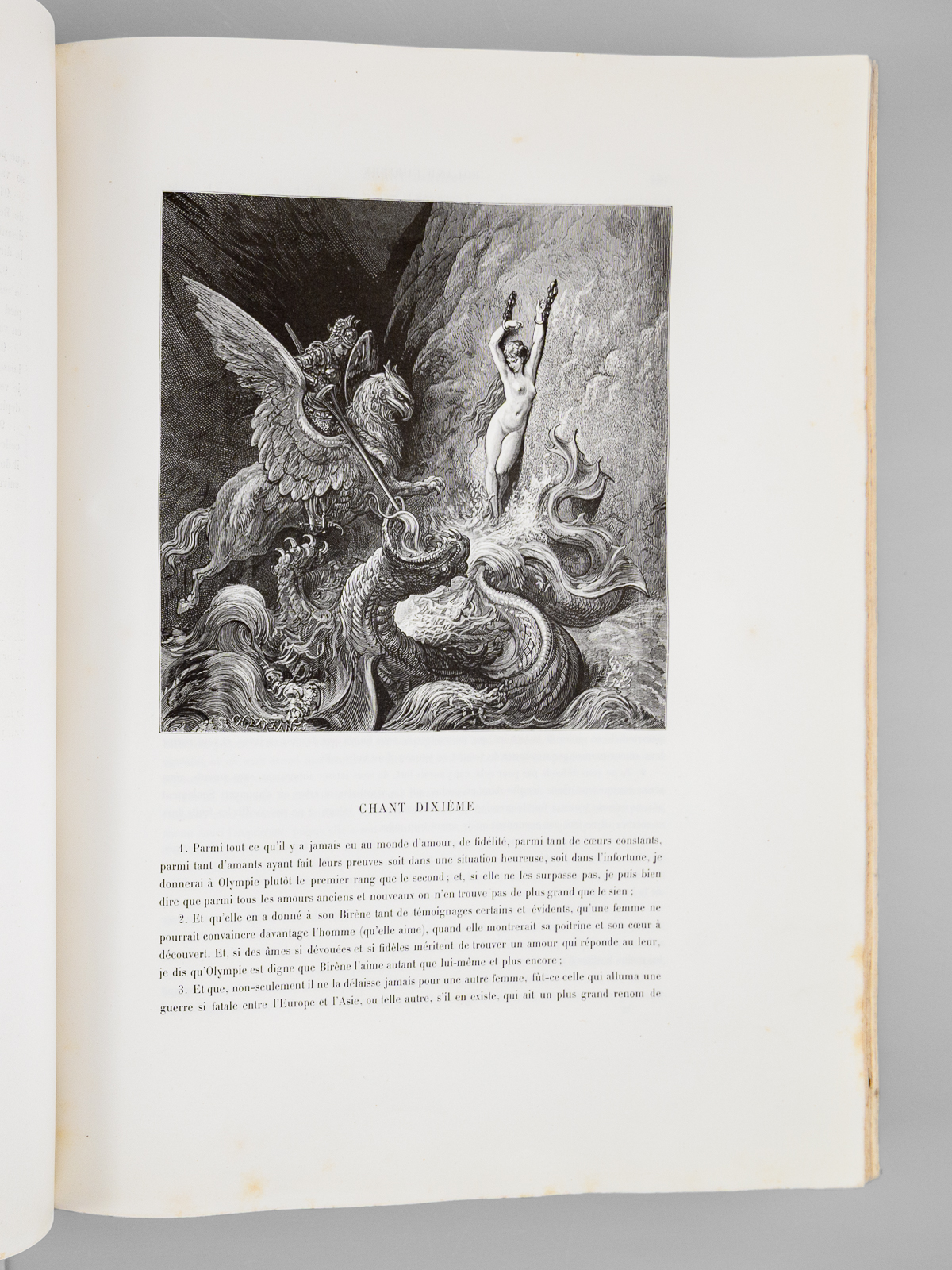 Traduit par A.-J. du Pays et illustré par Gustave Doré, nouvelle édition, 1 vol. fort in-folio reliure d'époque demi-chagrin maroquiné bleu, dos à 5 nerfs orné (fleurons), Librairie Hachette et Cie, Paris, 1888, VIII-658 pp. Commentaire : Bon état (qq. petits frott. et qq. rouss., bon exemplaire par ailleurs). Leblanc,