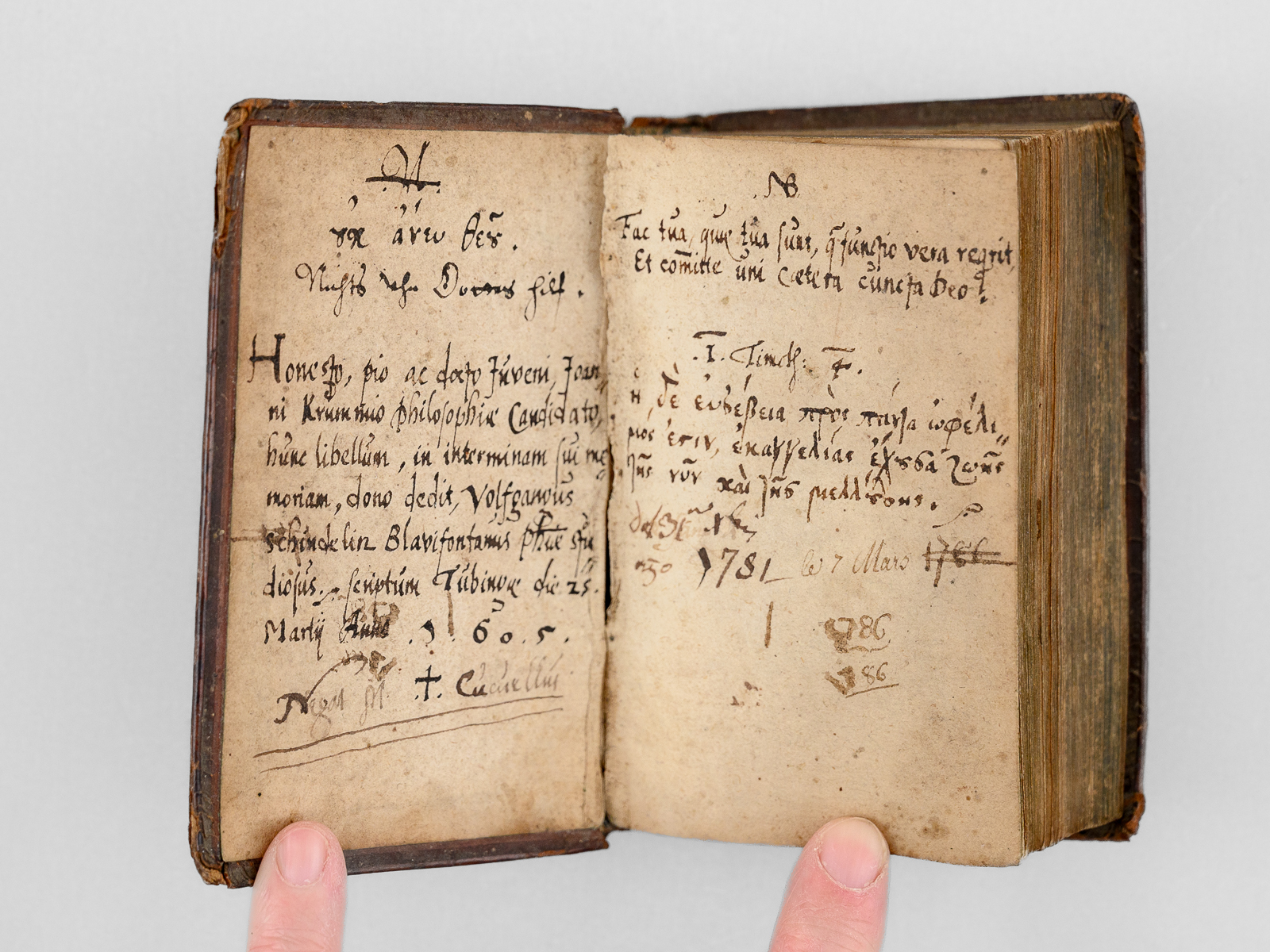 Commentaire : Ce charmant exemplaire des lettres de Cicéron est enrichi en garde d'un superbe ex-dono manuscrit daté du 25 mars 1605, rédigé par un étudiant à l'Université de Tübingen, Wolfgang Schindelin de Blaubeuren, à un autre étudiant Johann Krumm. On peut lire en garde fixe ce texte latin : 'Honesto, pio ac docto juveni Joanni Krummio philosophiae Candidato hunc libellum, in interminam sui memoriam, dono dedit, Wolfgangus Schindelin Blavifontanus phiae studiosus. Scriptum Tubingae die 25 Martij Anno 1605' [ 'À l'honnête, pieux et savant jeune homme Johann Krumm, candidat en philosophie, Wolfgang Schindelin de Blaubeuren, étudiant en philosophie, a offert ce petit livre en cadeau, en souvenir éternel de lui-même. A Tübingen, le 25 mars 1605' ]. Ce texte latin est précédé d'une annotation en grec ancien : 'Ouden aneu theou' et sa traduction en cursive allemande 'Nichts ohne Gottes hilf' ['Rien sans Dieur']. Sur la garde volante, à droite, on peut lire ce texte latin : 'Fac tua, quae tua sunt, q [quia] functio vera requirit Et committe uni caetera cuncta Deo' ['Fais ton devoir, ce qui t'incombe, comme la vraie charge l'exige / Et remets tout le reste à Dieu seul'] et un extrait en grec de la Première Epître à Timothée (1 Timothée 4, fin du verset 8) dont voici la traduction 'la piété est utile à tout, ayant la promesse de la vie présente et de celle qui est à venir.'. On sait que Wolfgang Schindelin (1586-1635) est immatriculé à Tübingen en 1603 ; il sera victime de la peste à Nürtingen en 1635. Johannes Krumm est immatriculé un peu plus tôt, le 28 avril 1602. Qualifié de 'Philosophiae Candidatus', il était sur le point de passer sa maîtrise avant d'entrer dans le grade supérieur. Cette édition des Lettres à Atticus de Cicéron s'insère très certainement dans l'édition imprimée par Symphorien Barbier et qui fut partagée en J. Frellon et Antoine Vincent des Oeuvres de Cicéron. Baudrier indique : 'Ces libraires ont donné, en 1560, deux éditions de Cicéron, l'une in-8 en 12 volumes et l'autre in-16, qu'ils rafraîchirent en 1562. Je n'ai pu, malgré de longues recherches, en retrouver un exemplaire complet' (Baudrier, V, 251). Bon état (petits mq. en dos et coiffes, premier feuillet de garde volante un peu faible, premier lettrine coloriée) pour ce remarquable témoignage typique des relations étudiantes à l'Université de Tübingen au tout début du XVIIe siècle. Voici une traduction soignée de votre notice bibliographique, respectant scrupuleusement votre consigne de ne pas traduire les passages originaux en latin et en grec. This charming copy of Cicero's letters is enriched on the endpaper by a very fine manuscript ex-dono dated March 25, 1605, written by a student at the University of Tübingen, Wolfgang Schindelin of Blaubeuren, to another student, Johann Krumm. On the pastedown, one can read this Latin text: 'Honesto, pio ac docto juveni Joanni Krummio philosophiae Candidato hunc libellum, in interminam sui memoriam, dono dedit, Wolfgangus Schindelin Blavifontanus phiae studiosus. Scriptum Tubingae die 25 Martij Anno 1605'. This Latin text is preceded by an annotation in Ancient Greek: 'Ouden aneu theou' and its translation in German cursive 'Nichts ohne Gottes hilf'. On the flyleaf, to the right, one can read this Latin text: 'Fac tua, quae tua sunt, q [quia] functio vera requirit Et committe uni caetera cuncta Deo' and an extract in Greek from the First Epistle to Timothy (1 Timothy 4, end of verse 8). It is known that Wolfgang Schindelin (1586-1635) matriculated at Tübingen in 1603; he would later fall victim to the plague in Nürtingen in 1635. Johannes Krumm matriculated slightly earlier, on April 28, 1602. Described as a 'Philosophiae Candidatus', he was on the verge of completing his Master's degree before entering a higher rank. This edition of Cicero's Letters to Atticus most certainly belongs to the edition printed by Symphorien Barbier, which was shared between J. Frellon and Antoine Vincent for the Works of Cicero. Baudrier states: 'In 1560, these booksellers produced two editions of Cicero, one in-8 in 12 volumes and the other in-16, which they refreshed in 1562. Despite extensive research, I have been unable to find a complete copy.' (Baudrier, V, 251). Dieses charmante Exemplar der Briefe Ciceros ist auf dem Vorsatzblatt durch ein sehr schönes handschriftliches Ex-dono bereichert, das auf den 25. März 1605 datiert ist. Es wurde von einem Studenten der Universität Tübingen, Wolfgang Schindelin aus Blaubeuren, für einen anderen Studenten, Johann Krumm, verfasst. Auf dem Spiegelblatt ist dieser lateinische Text zu lesen: Honesto, pio ac docto juveni Joanni Krummio philosophiae Candidato hunc libellum, in interminam sui memoriam, dono dedit, Wolfgangus Schindelin Blavifontanus phiae studiosus. Scriptum Tubingae die 25 Martij Anno 1605'. Diesem lateinischen Text geht eine Anmerkung in Altgriechisch voraus: Ouden aneu theou' sowie deren Übersetzung in deutscher Kurrentschrift Nichts ohne Gottes hilf'. Auf dem fliegenden Vorsatzblatt rechts liest man diesen lateinischen Text: Fac tua, quae tua sunt, q [quia] functio vera requirit Et committe uni caetera cuncta Deo' und einen Auszug auf Griechisch aus dem ersten Brief an Timotheus (1. Timotheus 4, Ende von Vers 8). Es ist bekannt, dass Wolfgang Schindelin (1586-1635) im Jahr 1603 in Tübingen immatrikuliert wurde; er erlag 1635 in Nürtingen der Pest. Johannes Krumm wurde etwas früher immatrikuliert, am 28. April 1602. Als Philosophiae Candidatus' bezeichnet, stand er kurz vor der Erlangung seines Magistergrades, bevor er in den höheren Stand aufstieg. Diese Ausgabe der Briefe an Atticus von Cicero gehört mit Sicherheit zu der von Symphorien Barbier gedruckten Ausgabe der Werke Ciceros, die zwischen J. Frellon und Antoine Vincent aufgeteilt wurde. Baudrier gibt an: Diese Buchhändler brachten im Jahr 1560 zwei Ausgaben von Cicero heraus, eine in 8° in 12 