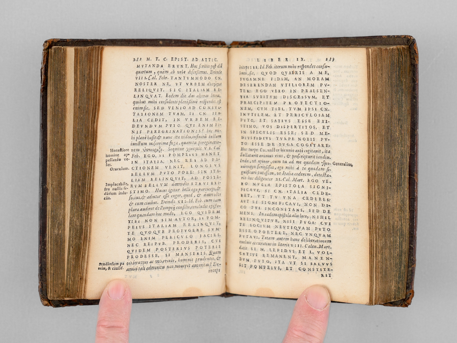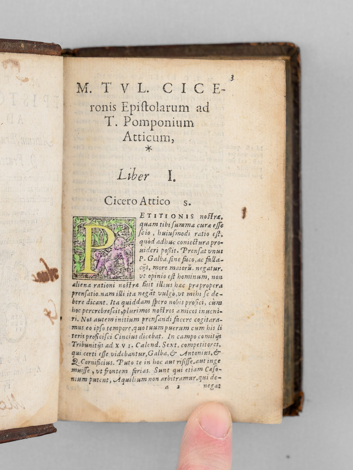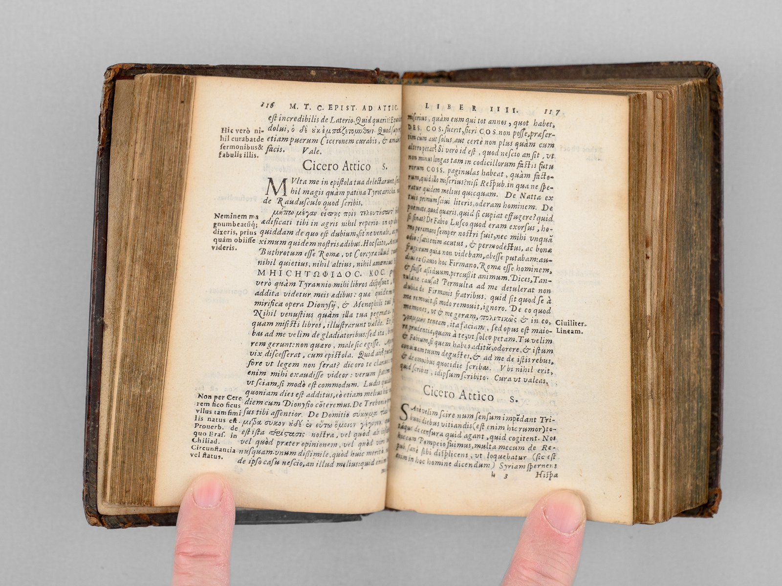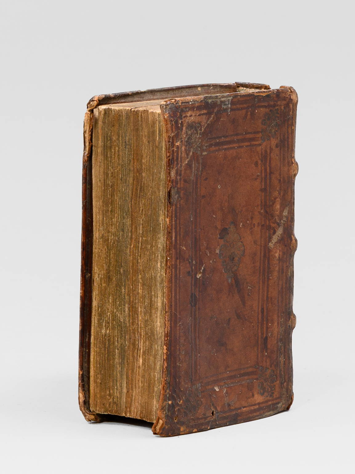 Ex diversorum exemplarium, praecipuè Victorij ac Manutij, collatione diligentissima castigatae. T. Pomponij Attici vita. Interpretatio eorum quae Graecè in Epistolis scriptasunt. Ex castigatione Ioannis Boulierij, 1 vol. in-12 reliure de l'époque plein veau brun, dos à 3 nerfs, filets et écoinçons estampés à froid en plats, Apud Antonium Vincentium [ Chez Antoine Vincent ], Excudebat Symphorianus Barbier [ Imprimé par Symphorien Barbier ], Lugduni [ A Lyon ], 1562, 656 pp. et 1 f. n. ch.