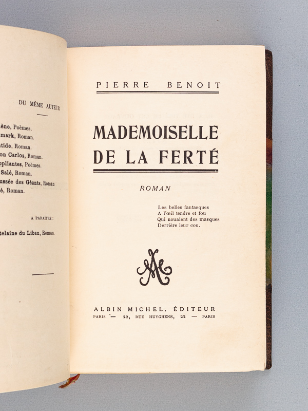 Un des 115 exemplaires sur papier du Japon numérotés à la presse de 1 à 115 (n° 115), 1 vol. in-12 reliure de l'époque demi-maroquin à coins vert, dos mosaïqué à 3 nerfs dorés, couvertures et dos conservés, reliure signée de A. Laucournet, Albin Michel, Paris, s.d. [ 1923 ], 319 pp. Commentaire : Magnifique exemplaire du tirage de tête sur papier du Japon, parfaitement relié. Pour ce récit de l'amitié curieuse d'Anne de La Ferté et de Galswinthe de Saint-Selve, Pierre Benoît s'est inspiré de ses cousins Lartigue, de Saint-Geours-de-Maremne (la maison de famille de l'auteur étant située à Saint-Paul-les-Dax).