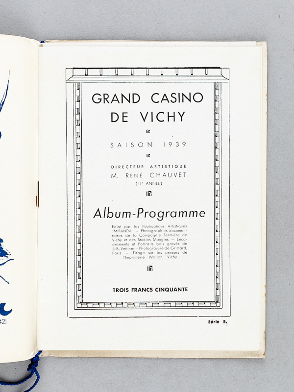 24 brochures in-12, 1932-1939, on joint 2 brochures touristiques de l'époque sur Vichy. Rappel du titre complet : [ Lot de 22 programmes des Casinos de Vichy ] 8 Programmes Officiels du Casino de Vichy 1932 - 14 Album-Programmes du Grand Casino de Vichy de 1933 à 1939 - Elysée-Palace Casino-Music-Hall Vichy Saison 1932 - Casino de l'Elysée-Palace Vichy Saison 1937 Commentaire : Rare réunion de programmes des divers casinos de Vichy (souvent truffés de prospectus publicitaires de luxe) dont 14 beaux albums programmes du Grand Casino de Vichy (aux dates variables, entre 1933 et 1939). Bon ensemble (qq. traces d'usage sur certains programmes mais bon ensemble par ailleurs). Prix du lot, non séparable.