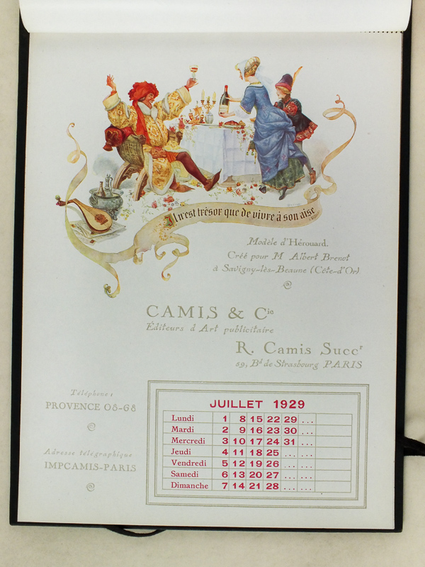 Calendrier en 12 feuillets format in-8 sur fond cartonné à support mobile (présentoir), Camis & Cie, Editeurs d'Art publicitaire, R. Camis Succr., 59 Boulevard de Strasbourg, Paris, 1929 [ Illustration de Maurice Leloir (Pour la Société Calvet & Cie à Beaune) ; et d'Hérouard (pour MM. Schröder et de Constans à Bordeaux ; pour Ch. Viénot à Prémeaux ; pour MM. Bouyer jeune & Cie à Bordeaux ; pour Barolet Fils à Beaune ; pour MM. Margnat frères à Marseille ; pour Albert Brénot à Savigny les Beaune ; pour Sommesous à Vouvray ; pour M. P. Fromont à Villefrace-de-Beaujolais ; pour M. G. Tessier & Cie à Saumur ; pour la Société Française des Etablissements Bernard à Vidauban ; pour la Société Anonyme Francesco Cinzano & Cie à Turin) ] Commentaire : Bon état pour ce joli calendrier illustré par Leloir et Hérouard .