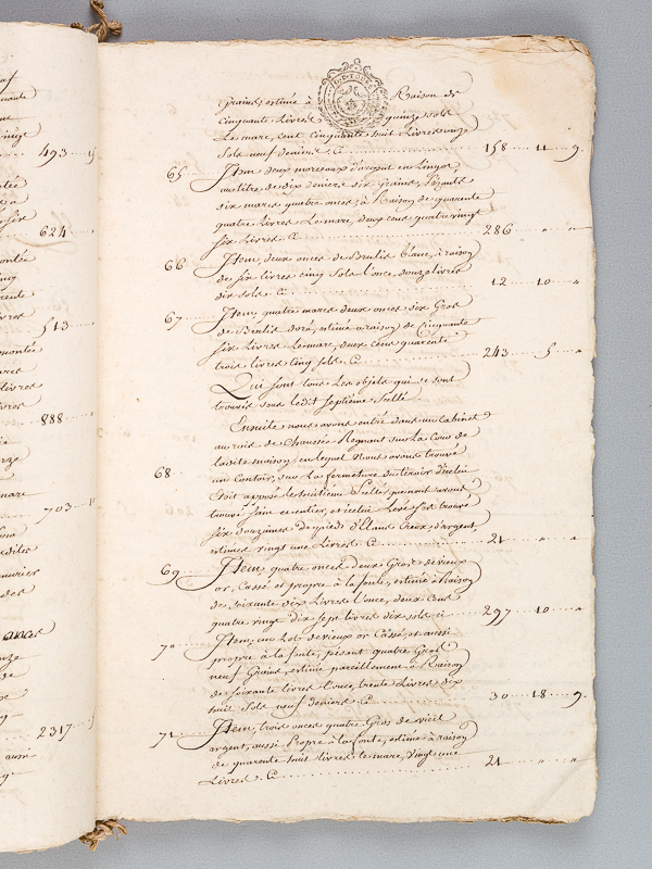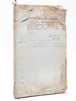 Commentaire : Remarquable inventaire réalisé à Angers en 1788, chez la veuve d'un orfèvre ! Ce très beau document historique détaille et valorise l'intégralité du stock d'orfèvrerie, mais également tous les biens meubles de ladite veuve (mouill. angulaire et un très petit grignotage marginal, bon état par ailleurs).