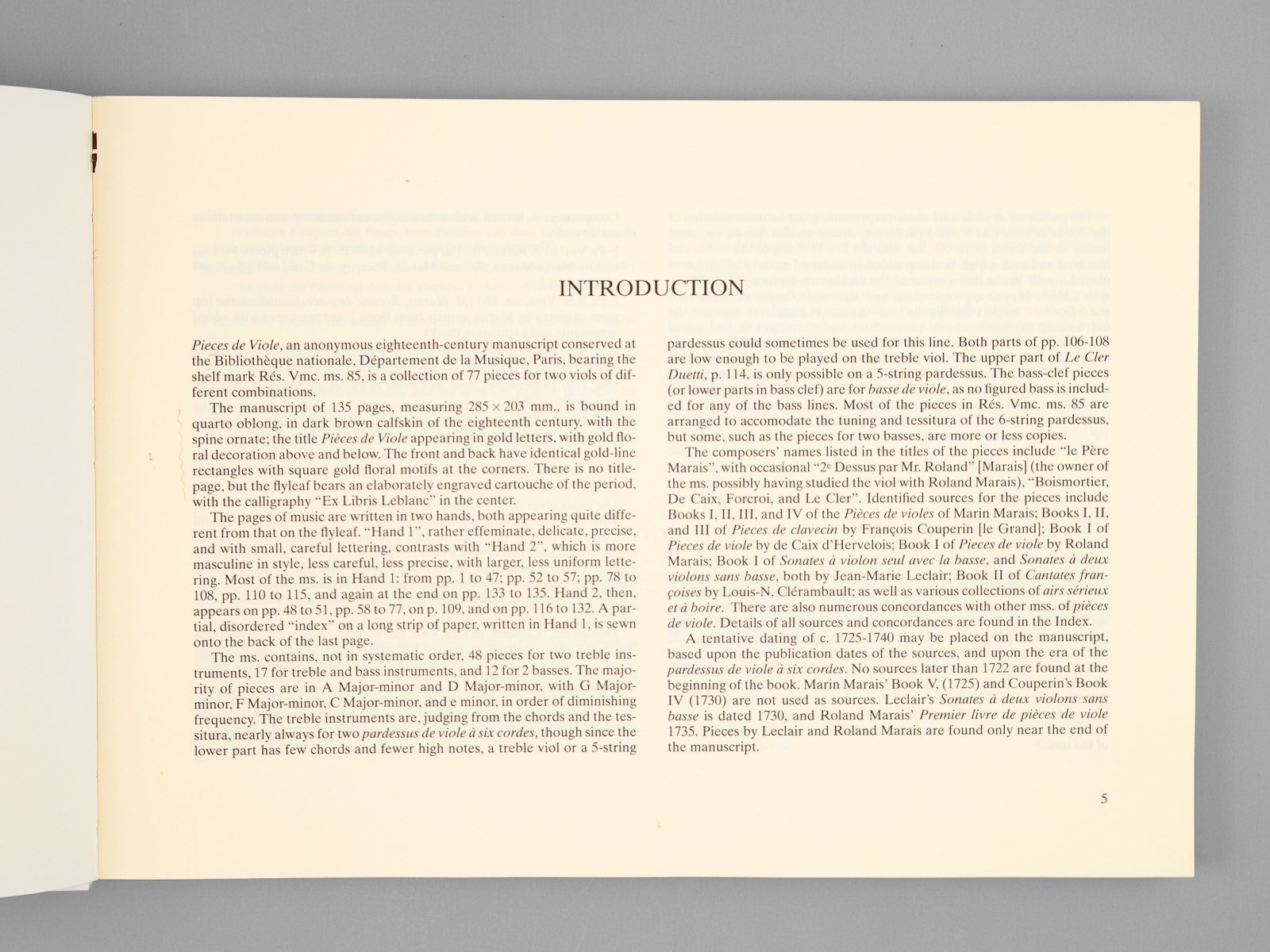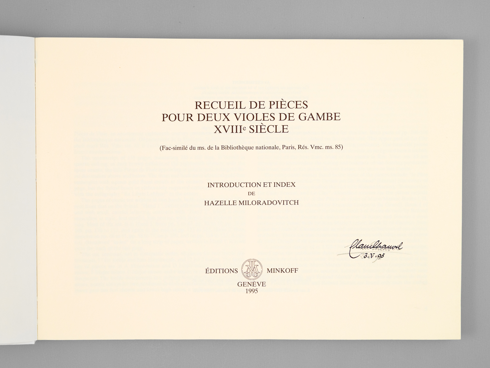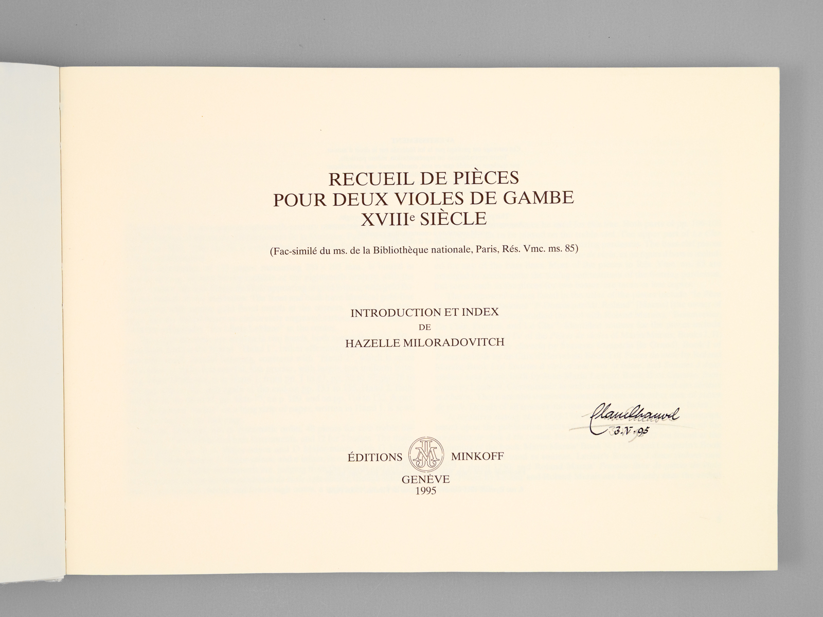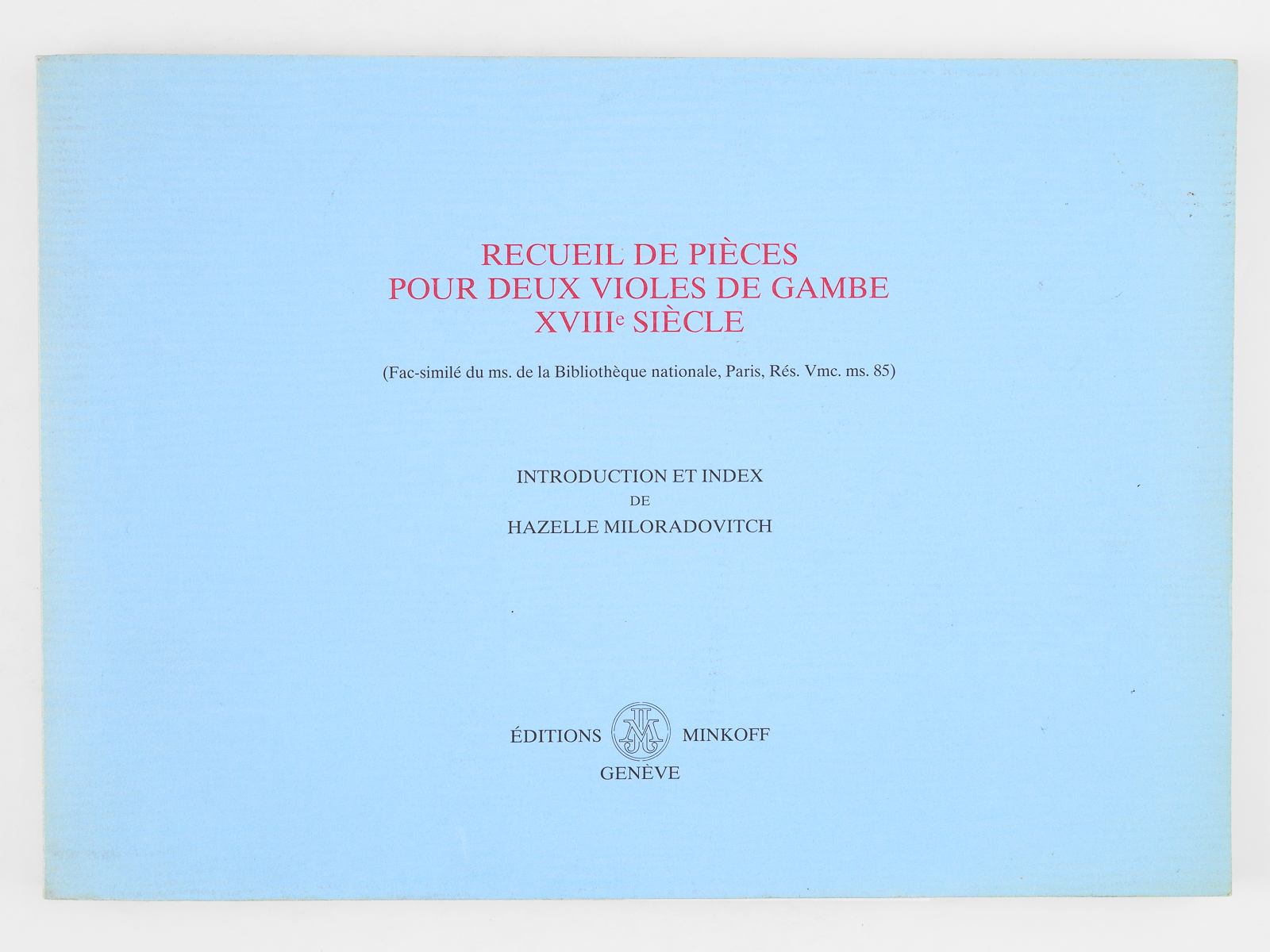 Recueil de pièces pour deux violes de gambe XVIIIe siècle (Fac-similé du ms. de la Bibliothèque nationale, Paris, Rés. Vmc. ms. 85). Introduction et index de Hazelle Miloradovitch.