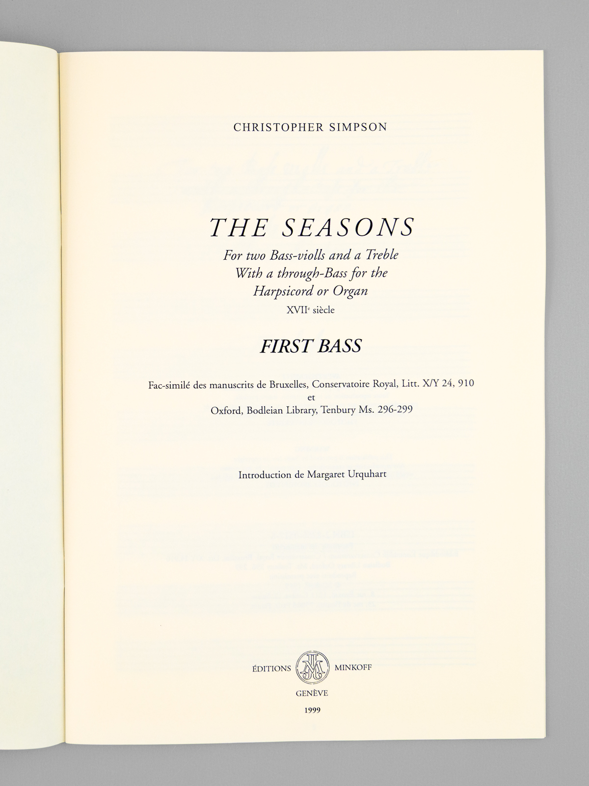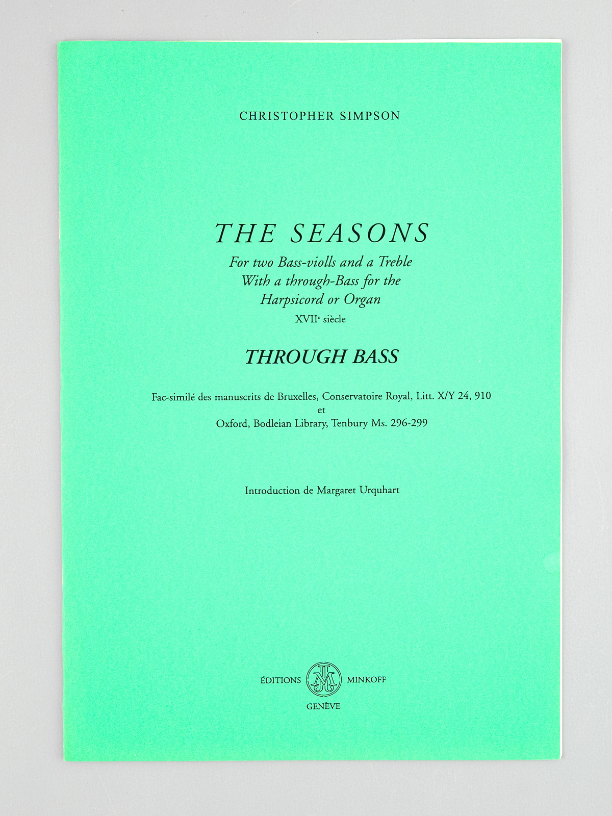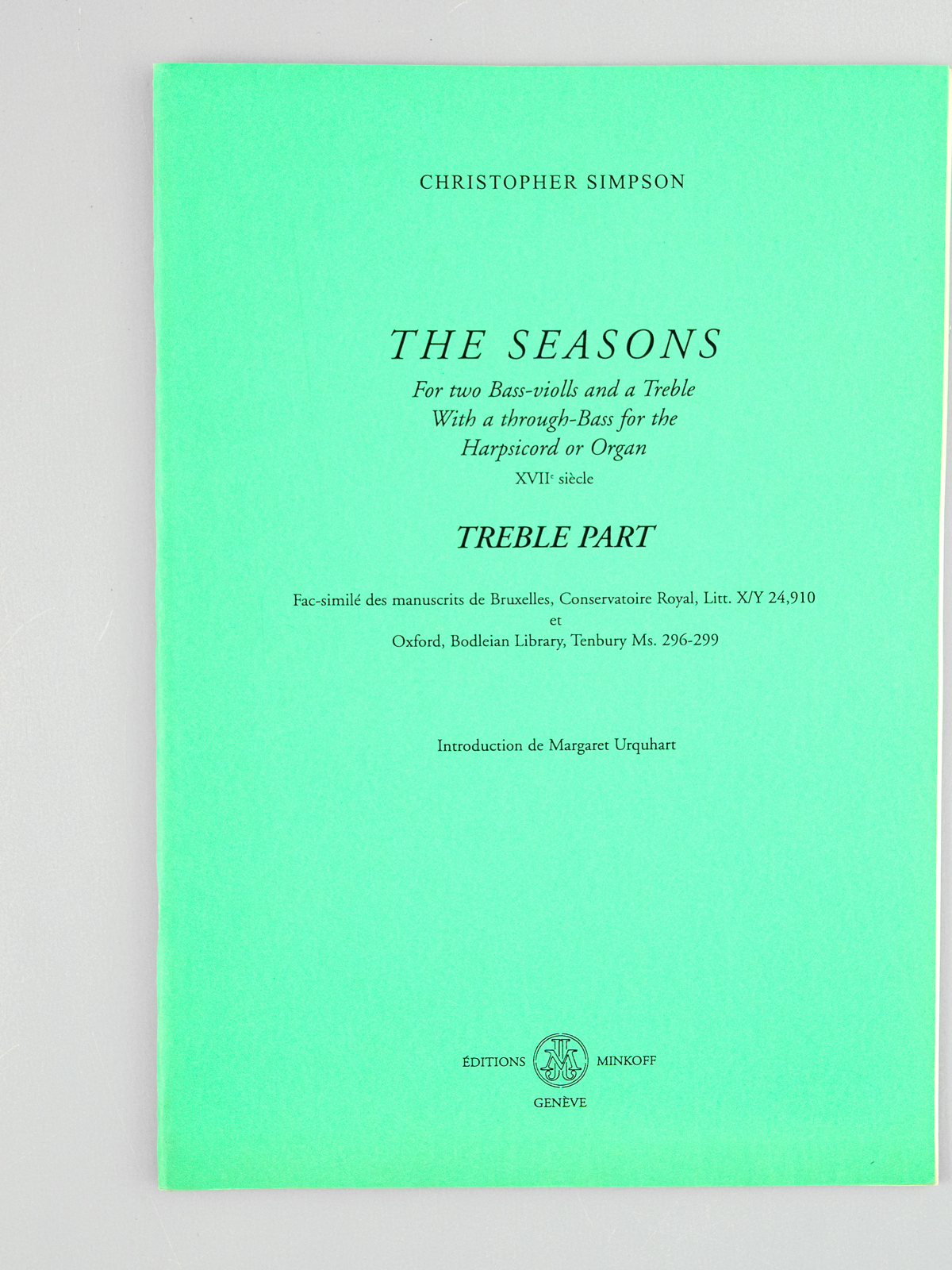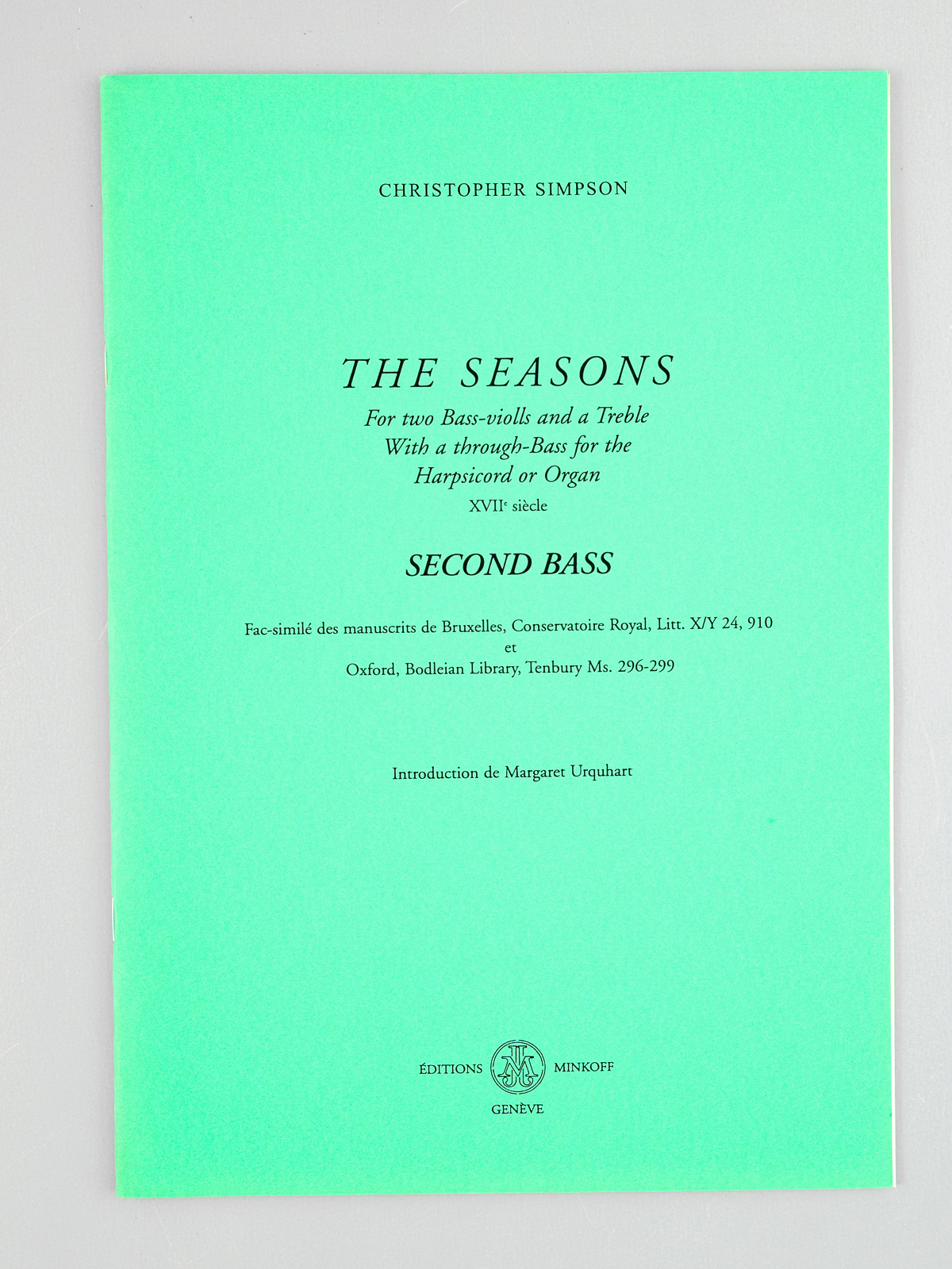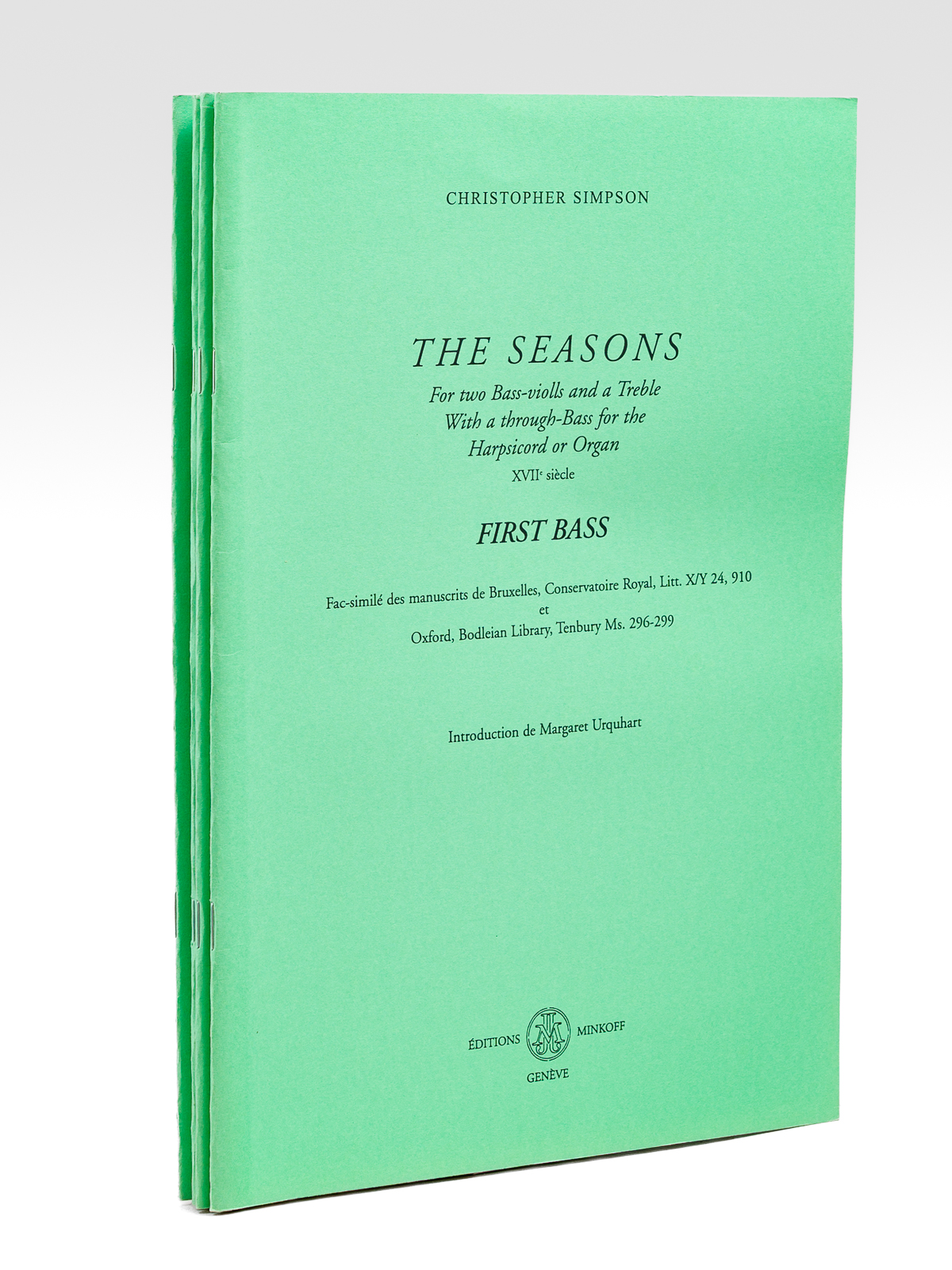 The Seasons for two Bass-violls and a Treble with a through-Bass for the Harpsicord or Organ XVIIe siècle [ 18th Century - Set of 4 books ] First Bass ; Second Bass ; Treble Part ; Through Bass - Fac-similé des manuscrits de Bruxelles, Cons - Auteur: SIMPSON, Christopher ; URQUHART, Margaret (introd.) - Année d'édition: 1999