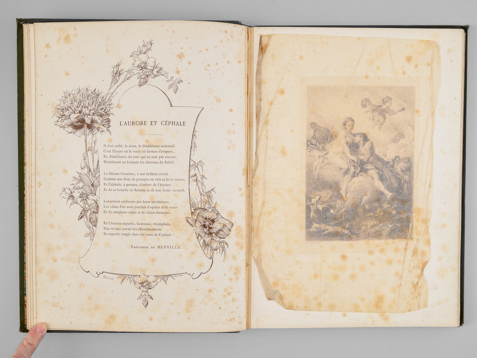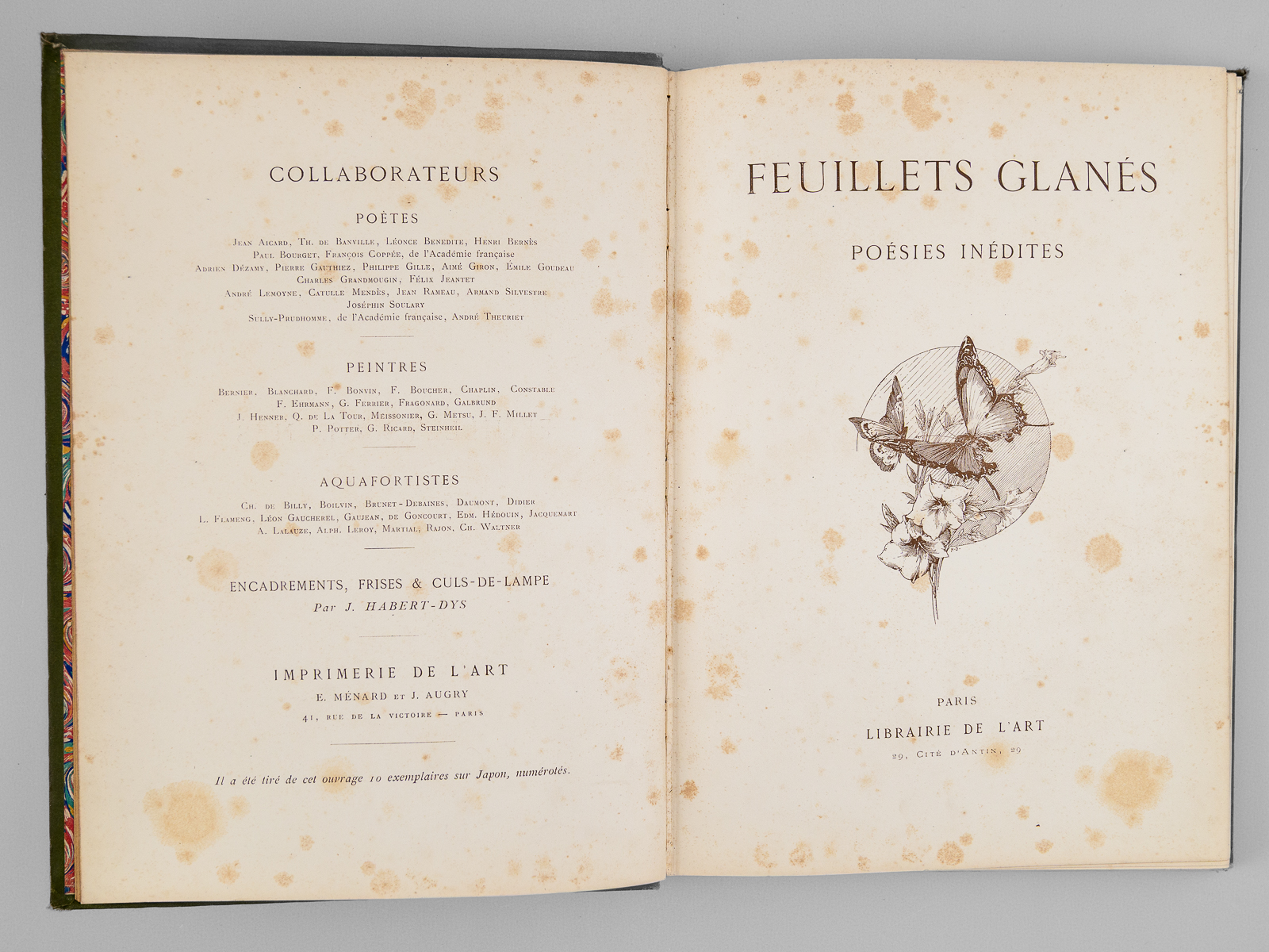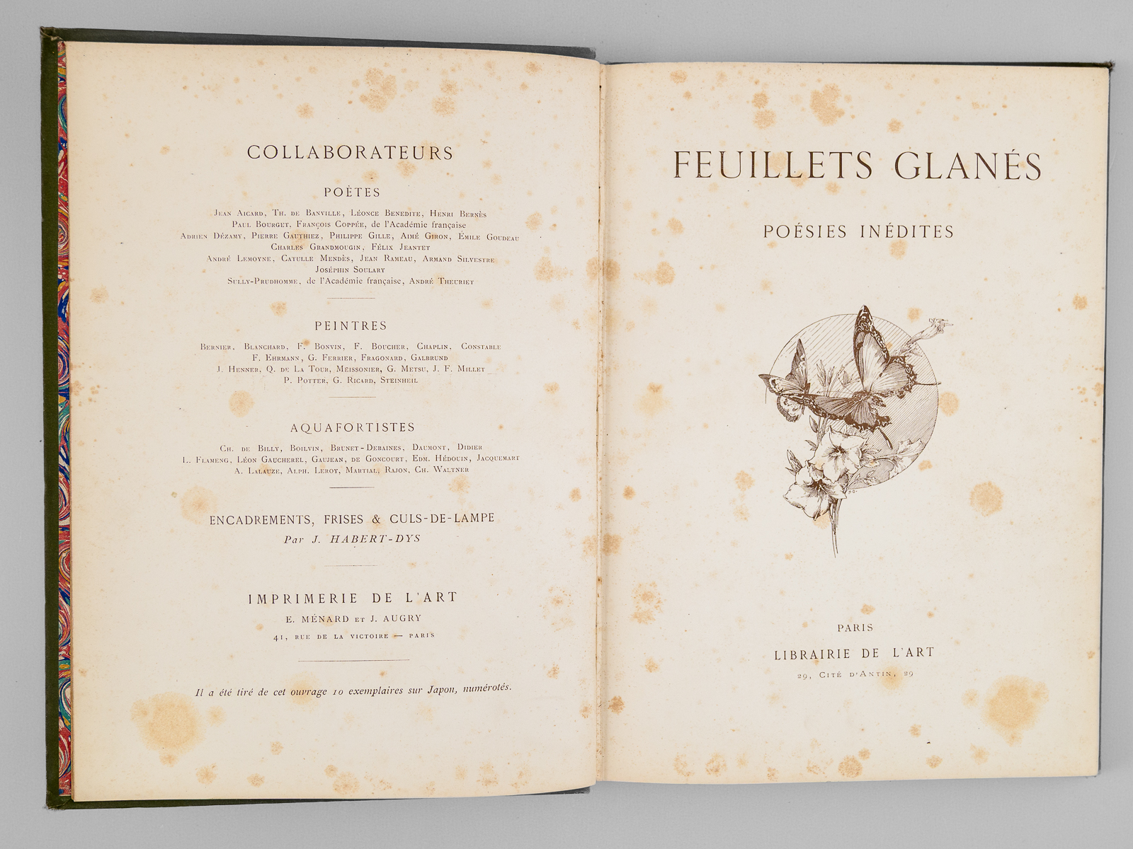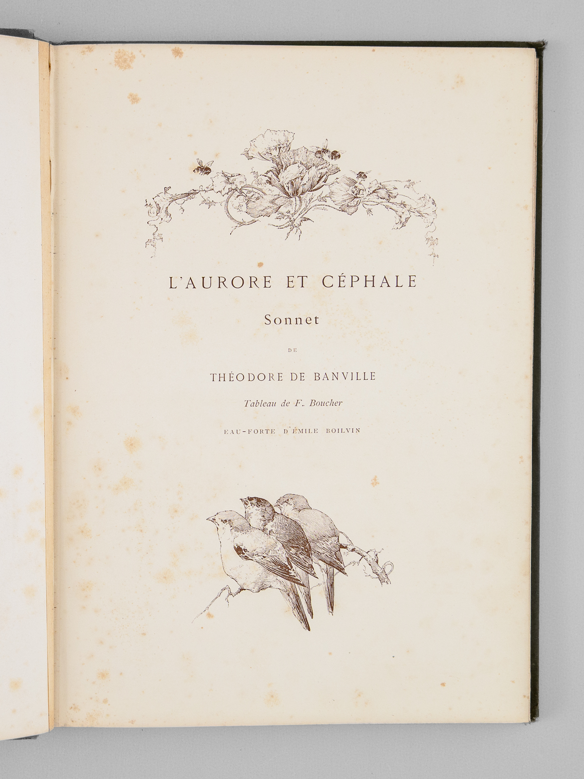 Collaborateurs : Jean Aicard, Th. de Banville, Léonce Bénédite, Henri Berrés, Paul Bourget, François Coppée, de l'Académie française, Adrien Dézamy, Pierre Gauthiez, Philippe Gille, Aimé Giron, Émile Goudeau, Charles Grandmougin, Félix Jeantet, André Lemoyne, Catulle Mendès, Jean Rameau, Armand Silvestre, Joséphin Soulary, Sully-Prudhomme, de l'Académie française, André Theuriet, Peintres : Bernier, Blanchard, F. Boucher, Chaplin, Constantin, F. Ehrmann, G. Ferrier, Fragonard, Galimard, J. Henner, Q. de la Tour, Meissonier, J. F. Millet, P. Potter, G. Ricard, Steinheil, Aquafortistes : Ch. de Bray, Boivin, Brunet-Debaines, Daumont, Didier L. Flameng, Léon Gaucherel, Gaujean, de Goncourt, Edm. Hédouin, Jacquemart A. Lalauze, Alph. Leroy, Martial Rajon, Ch. Waltner, encadrements, frises & culs-de-lampe par J. Habert-Dys, 1 vol. in-4 cartonnage éditeur illustré, coupes biseautées, toutes tranches dorées, Imprimerie de l'Art E. Ménard et J. Augry, Paris, s.d. [ 1887 ], 20 ff.