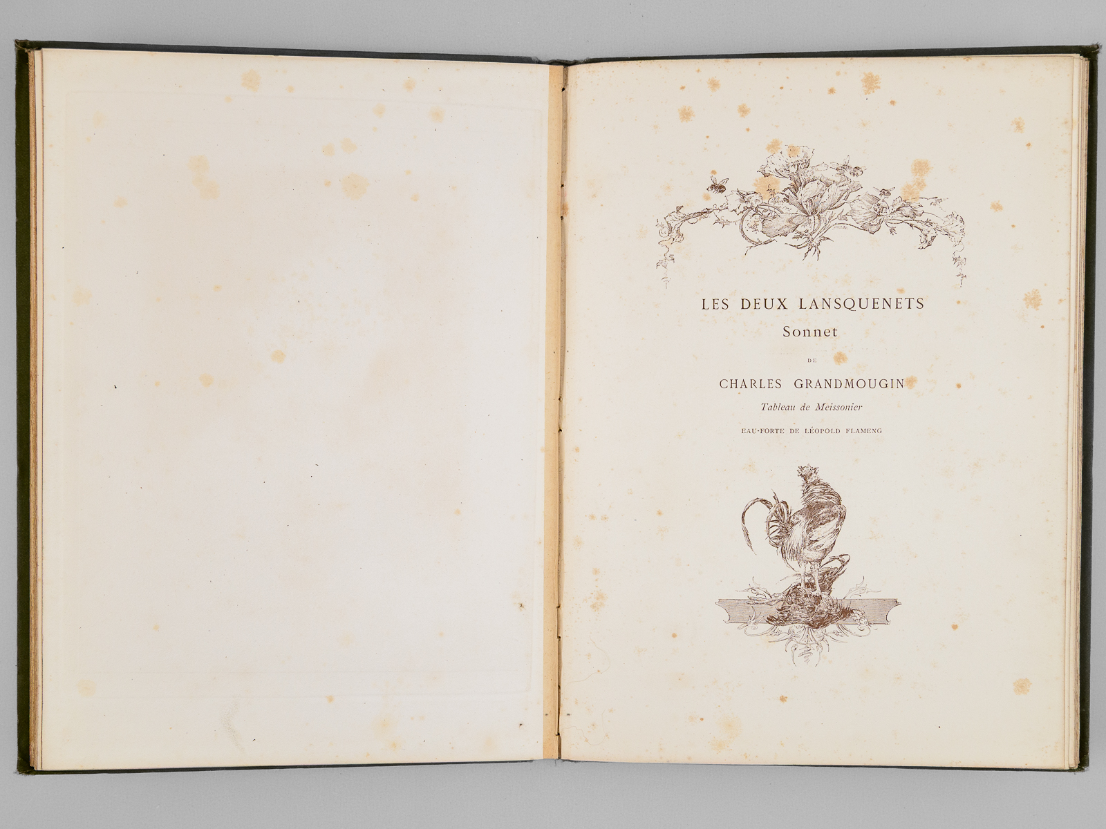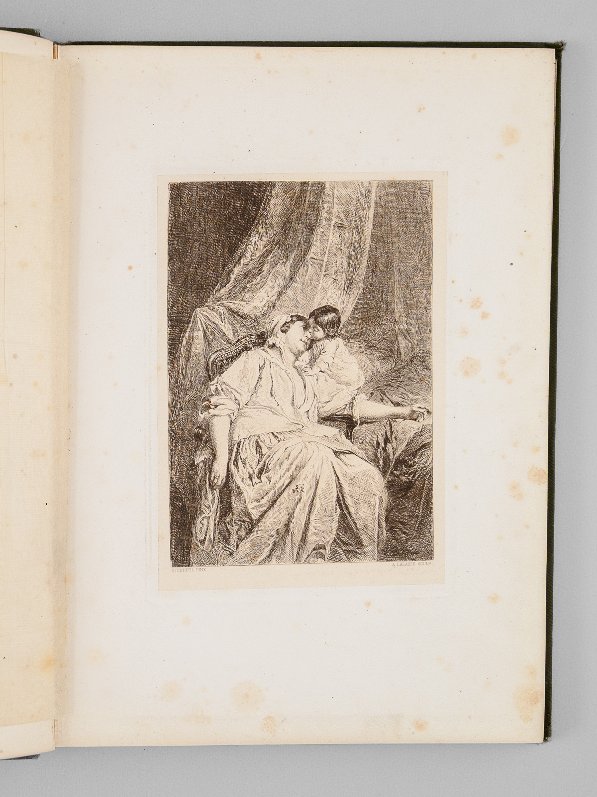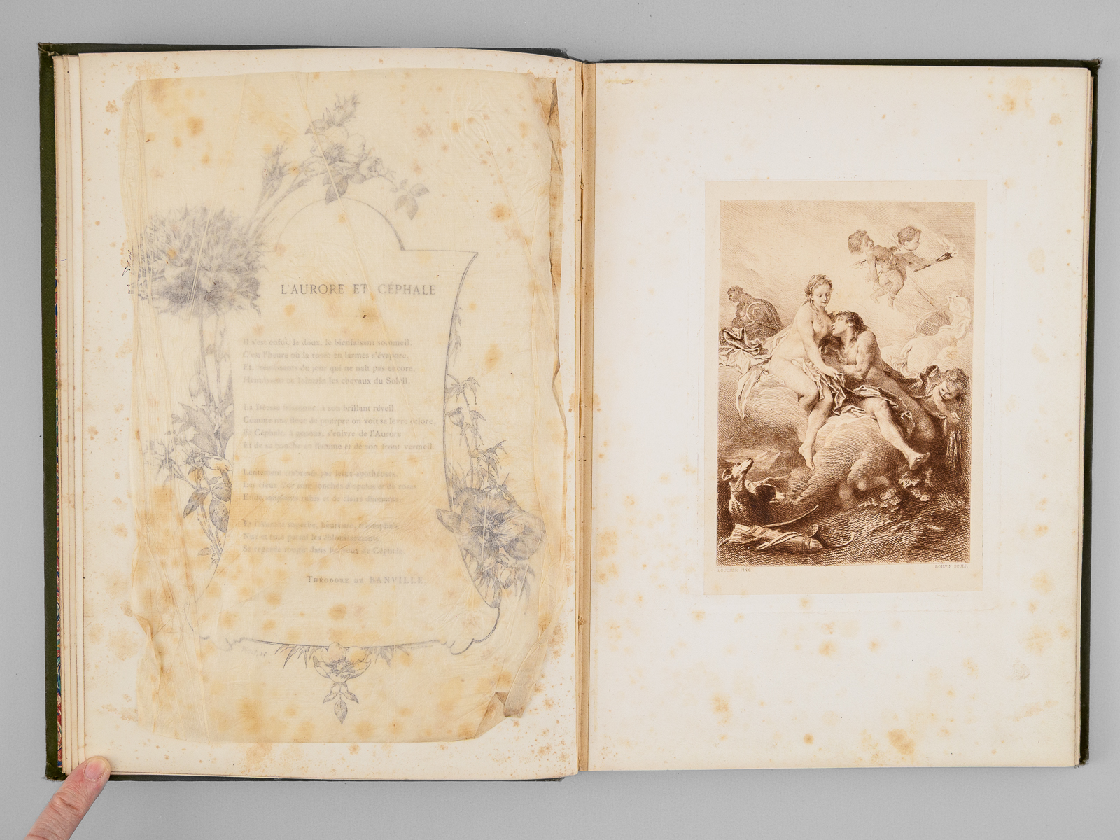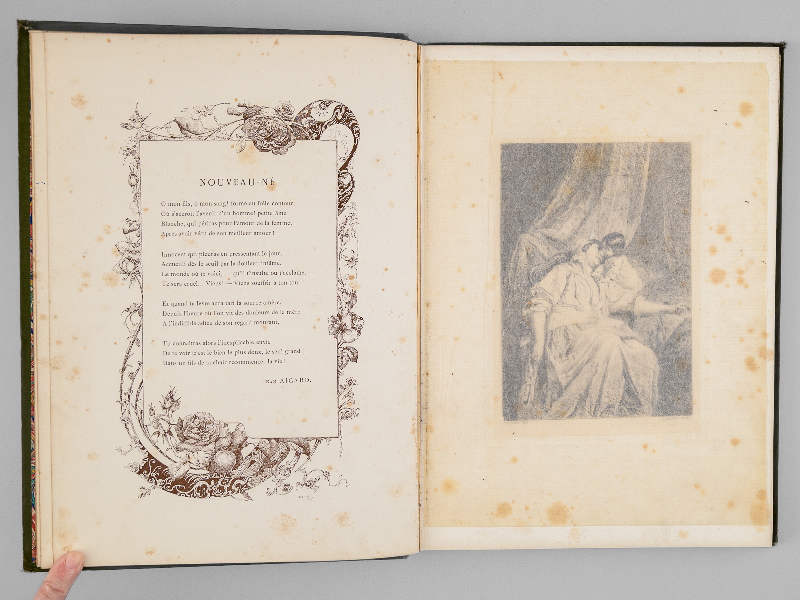 Collaborateurs : Jean Aicard, Th. de Banville, Léonce Bénédite, Henri Berrés, Paul Bourget, François Coppée, de l'Académie française, Adrien Dézamy, Pierre Gauthiez, Philippe Gille, Aimé Giron, Émile Goudeau, Charles Grandmougin, Félix Jeantet, André Lemoyne, Catulle Mendès, Jean Rameau, Armand Silvestre, Joséphin Soulary, Sully-Prudhomme, de l'Académie française, André Theuriet, Peintres : Bernier, Blanchard, F. Boucher, Chaplin, Constantin, F. Ehrmann, G. Ferrier, Fragonard, Galimard, J. Henner, Q. de la Tour, Meissonier, J. F. Millet, P. Potter, G. Ricard, Steinheil, Aquafortistes : Ch. de Bray, Boivin, Brunet-Debaines, Daumont, Didier L. Flameng, Léon Gaucherel, Gaujean, de Goncourt, Edm. Hédouin, Jacquemart A. Lalauze, Alph. Leroy, Martial Rajon, Ch. Waltner, encadrements, frises & culs-de-lampe par J. Habert-Dys, 1 vol. in-4 cartonnage éditeur illustré, coupes biseautées, toutes tranches dorées, Imprimerie de l'Art E. Ménard et J. Augry, Paris, s.d. [ 1887 ], 20 ff.