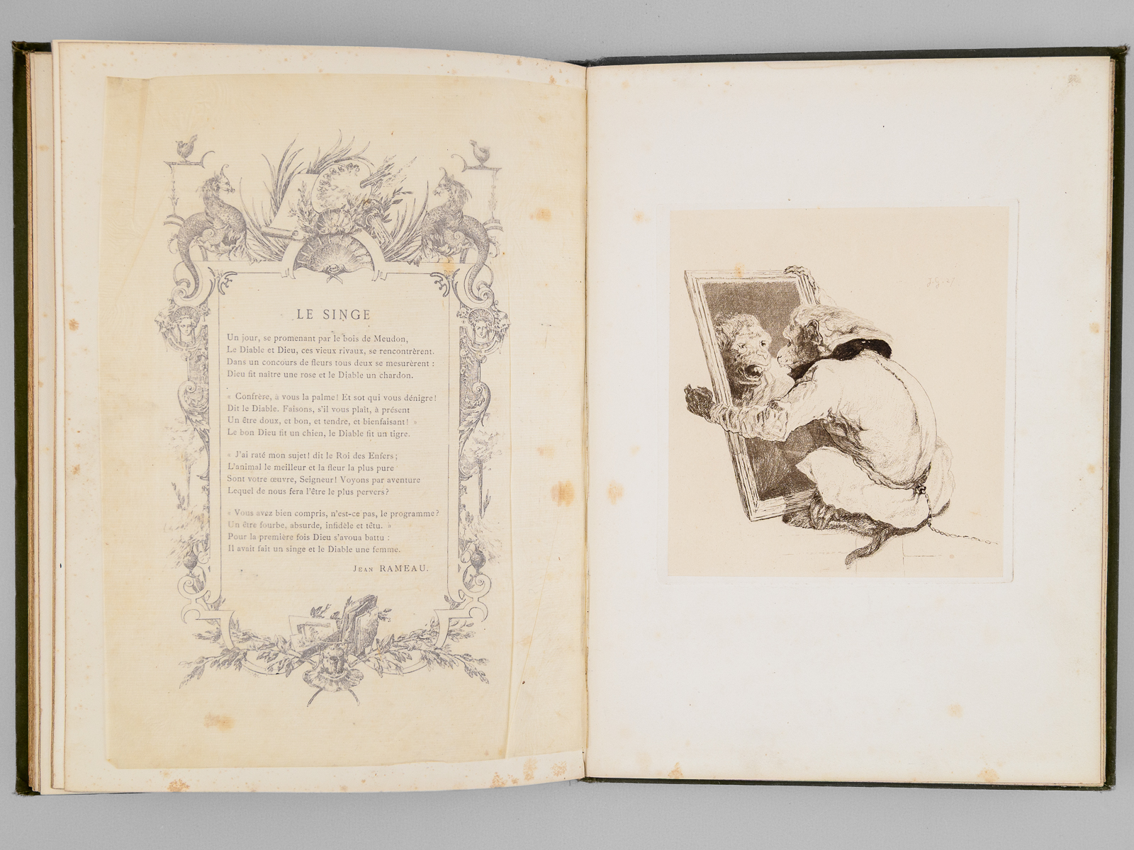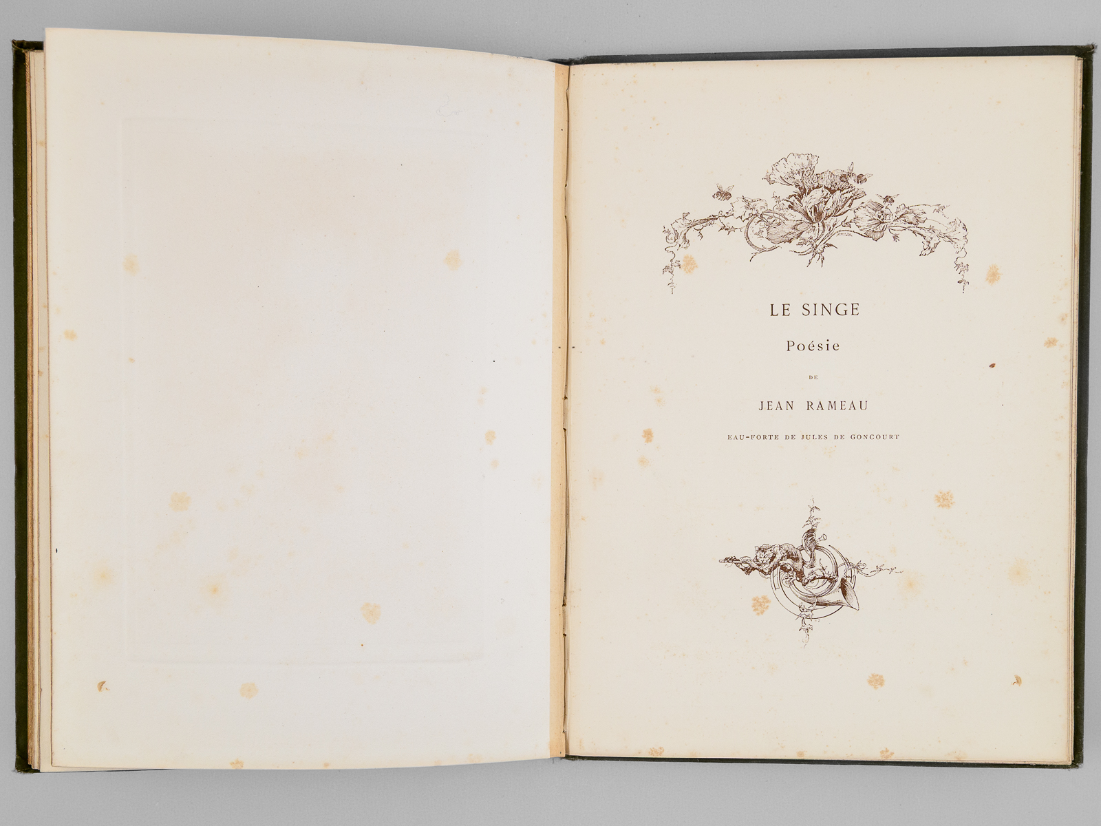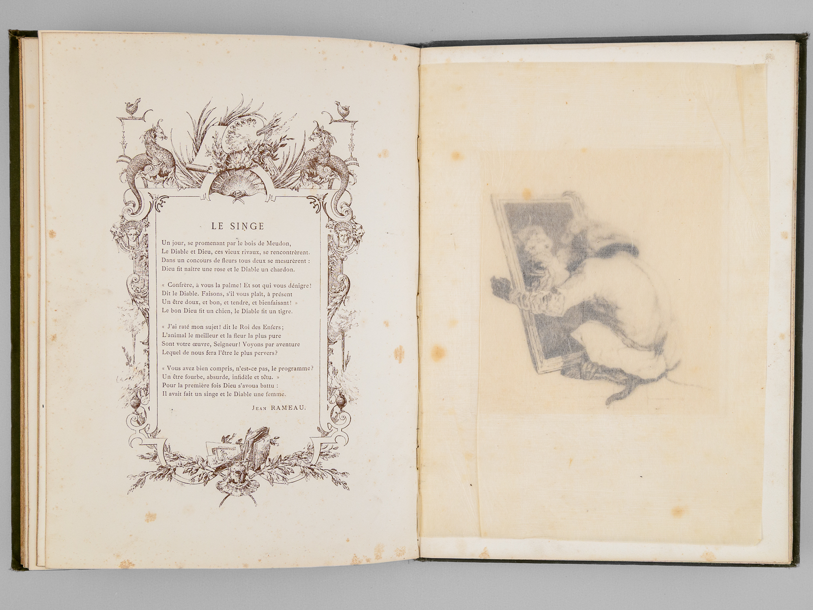 Commentaire : Les eaux-fortes sont d'un très beau tirage, on y trouvera notamment l'eau-forte du singe grimaçant au miroir par Jules de Goncourt, illustrant le poème de Jean Rameau. Bon état (coiffes et coupes un peu frottées, rares rouss.)