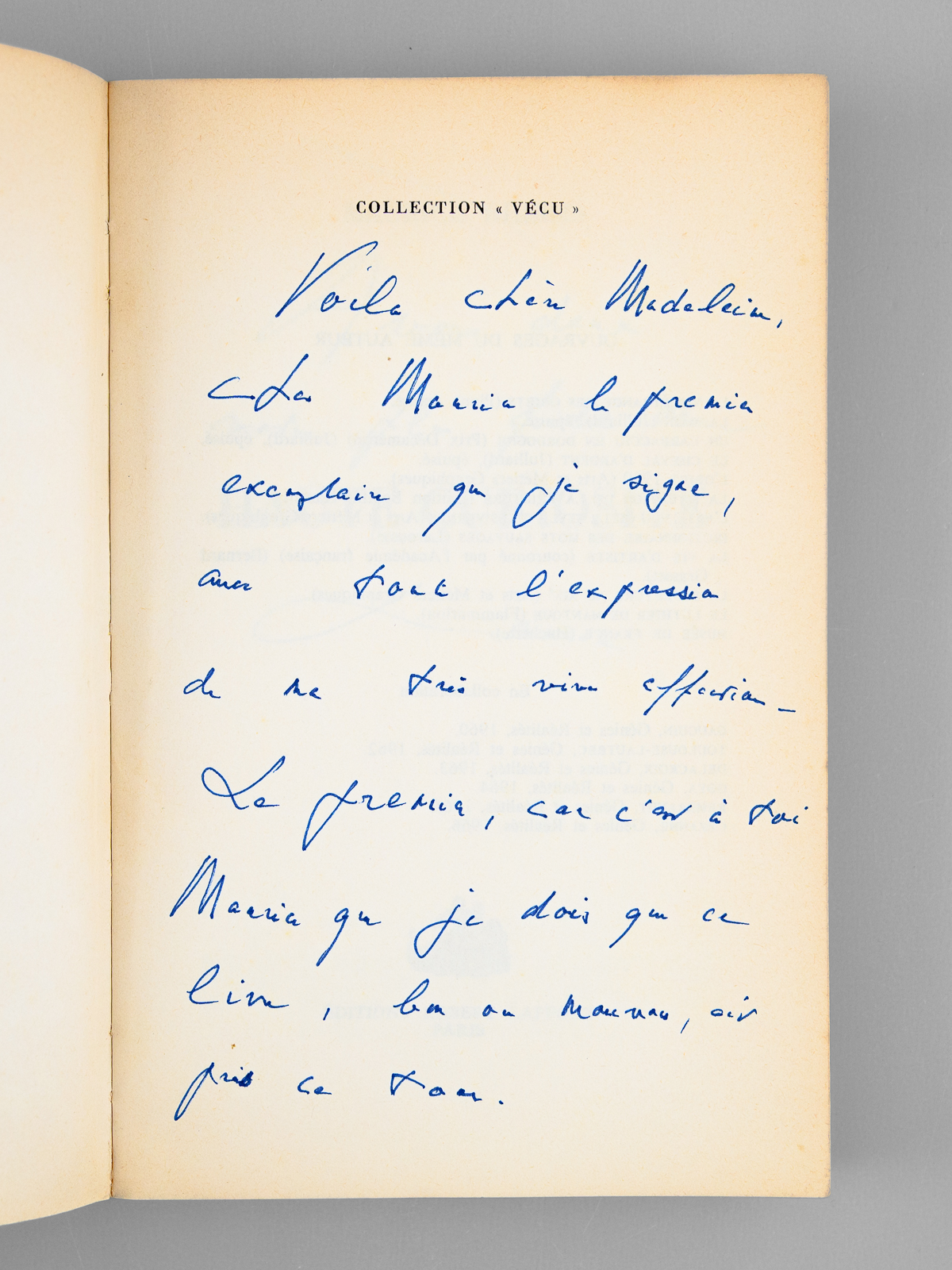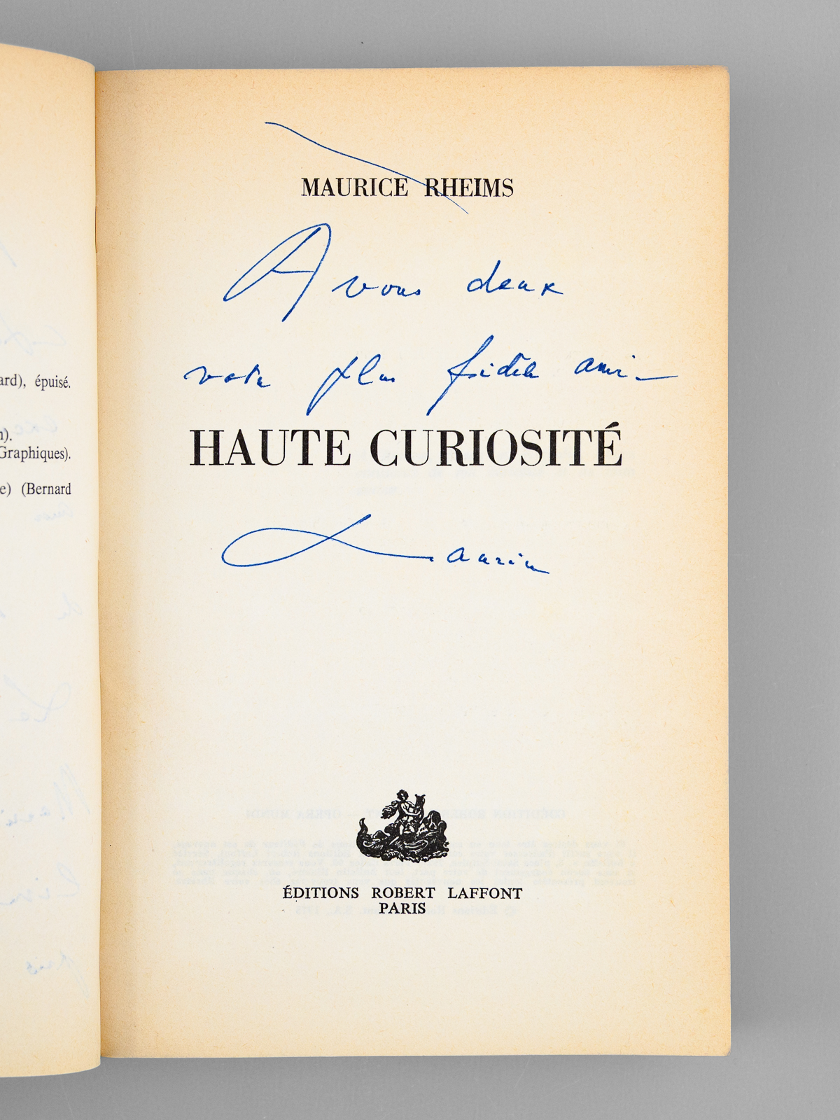 1 vol. in-8 br., Robert Laffont, Paris, 1975, 426 pp. Commentaire : Superbe envoi de Maurice Rheims : 'Voilà chère Madeleine, cher Maurice, le premier exemplaire que je signe, avec toute l'expression de ma très vive affection. Le premier, car c'est à toi Maurice que je dois que ce livre, bon ou mauvais ait pris ce ton. A vous deux, votre plus fidèle ami'. Etat très satisfaisant (pliure en couv. , qq. rouss. en tête, bon exemplaire par ailleurs) pour cet exemplaire de superbe provenance : de la bibliothèque du grand écrivain Maurice Druon, Secrétaire Perpétuel de l'Académie Française de 1985 à 1999, qui a, comme à son habitude, replié l'angle des feuillets dont les passages avaient plus particulièrement retenu son attention.,