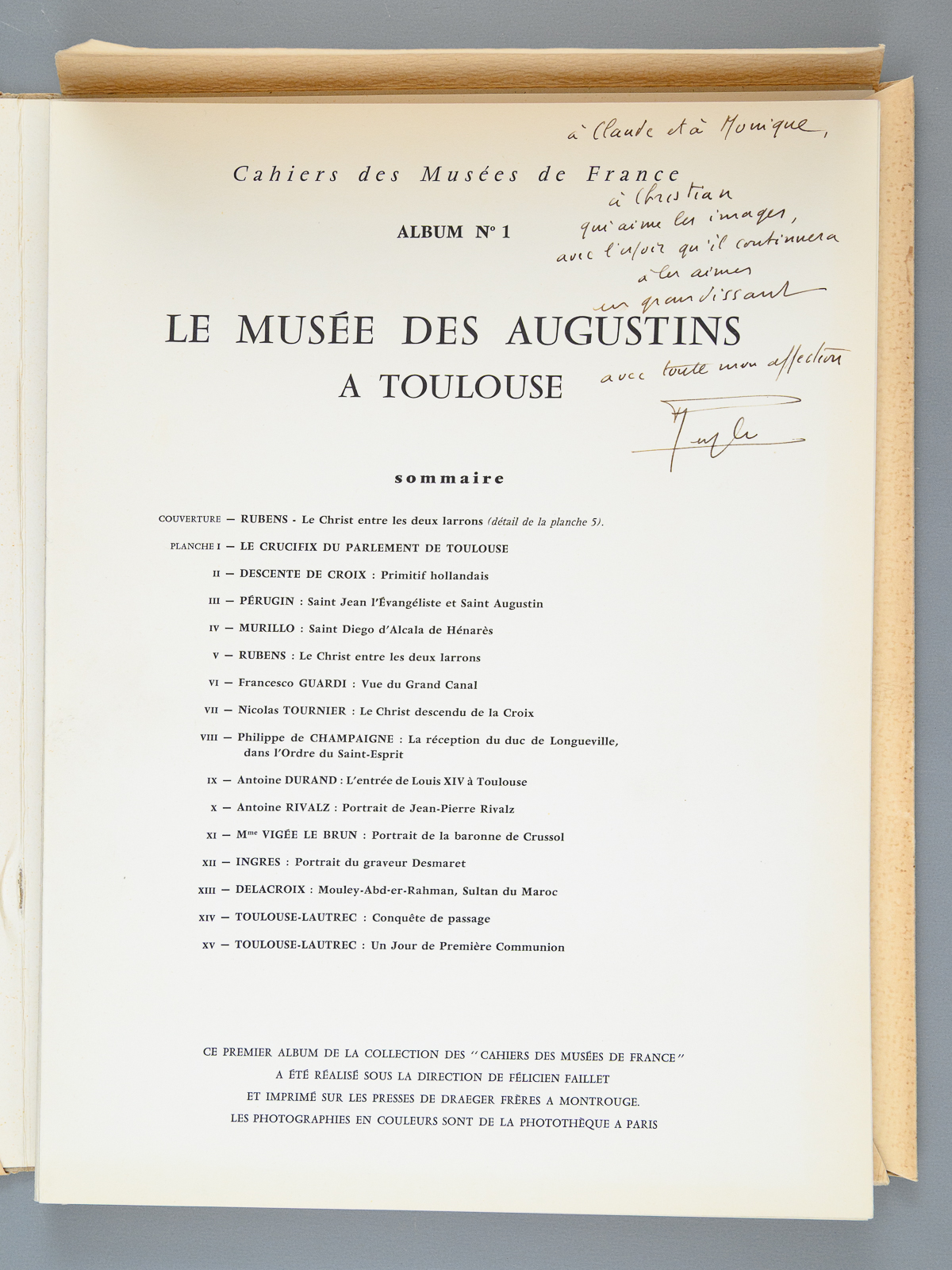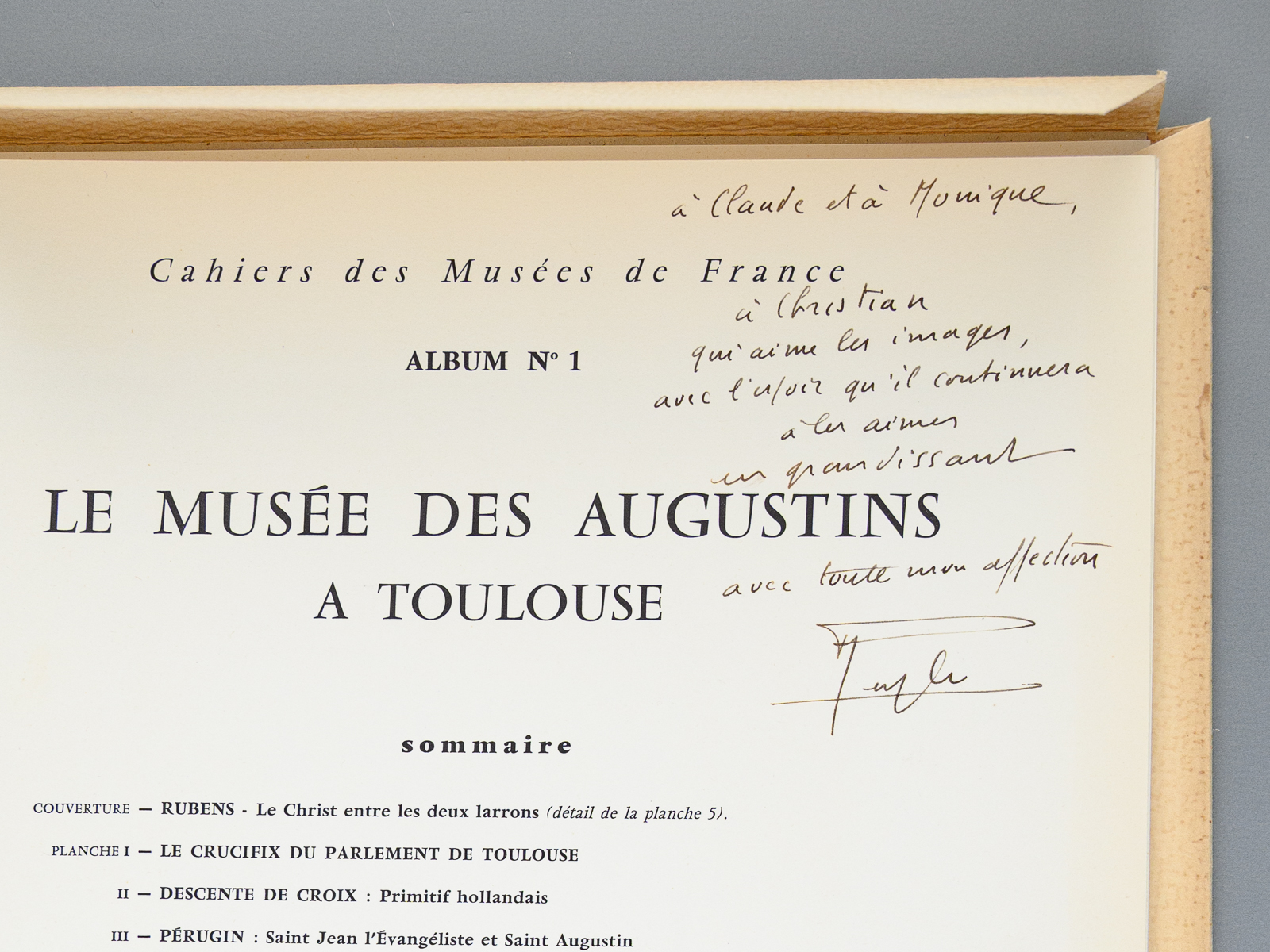 André Maurois, de l'Académie Française, Paul Mesplé, Conservateur du Musée, 1 vol. in-folio en feuillets sous chemise illustrée, Cahiers des Musées de France, Album n°1, Les Editions de la Photothèque, Imprimé sur les Presses de Draeger Frères, s.d. [ 1959 ], 15 planches en couleurs avec texte explicatif Commentaire : Bel exemplaire en parfait état, bien complet et dédicacé par le Conservateur Paul Mesplé. Peu commun
