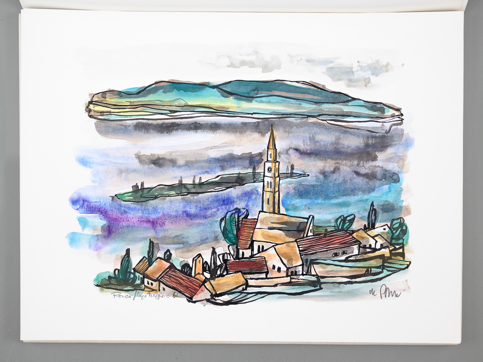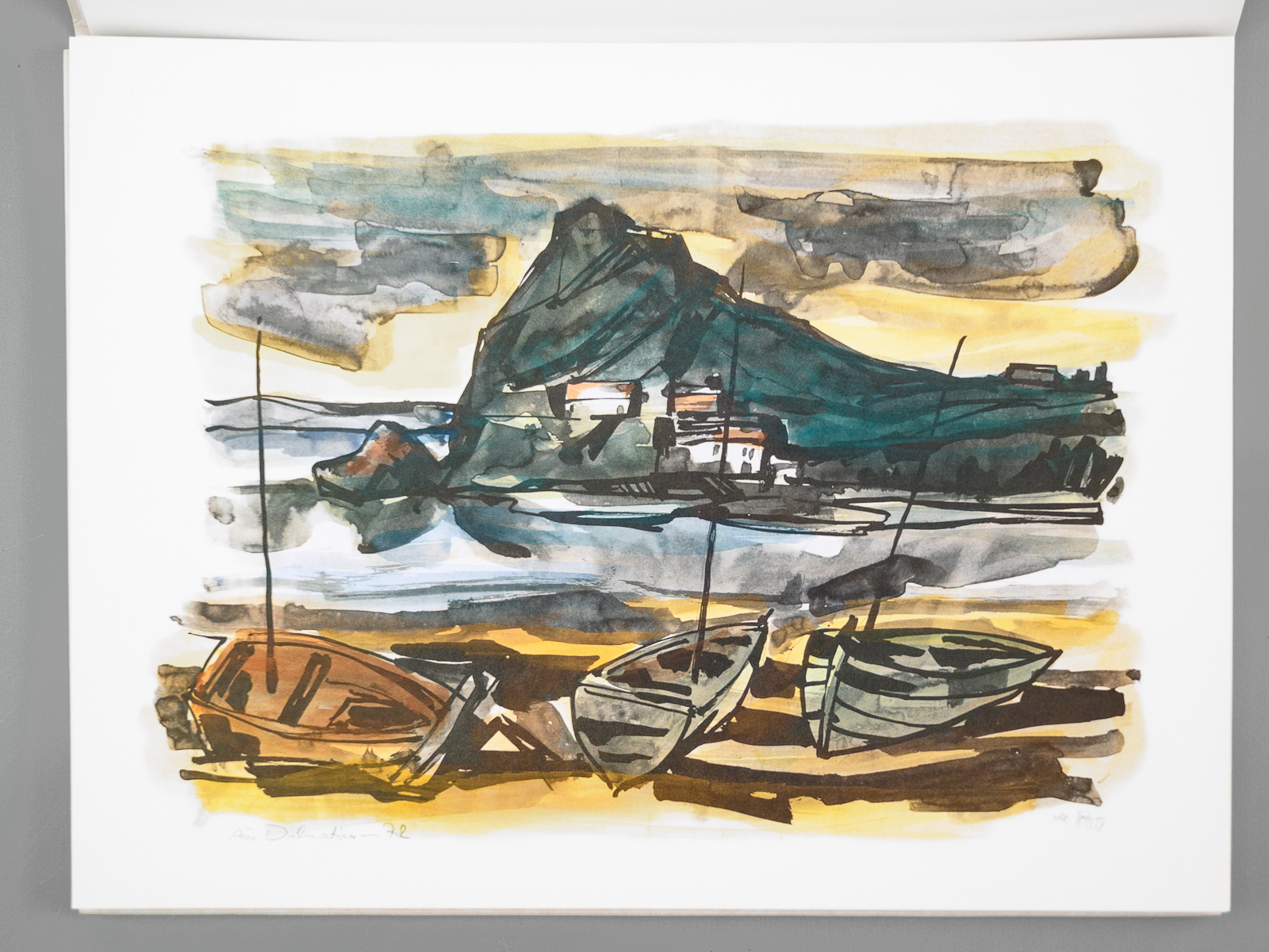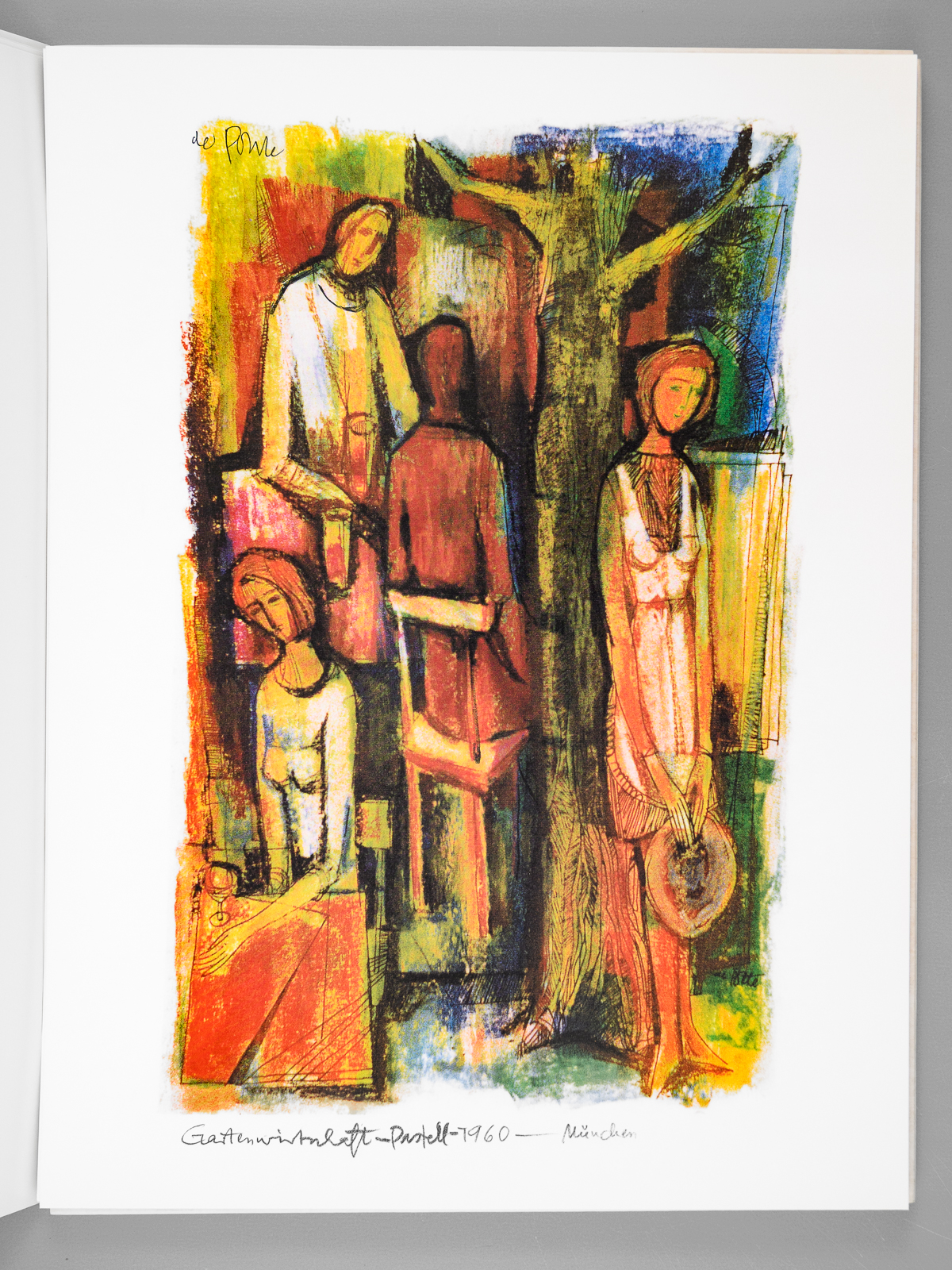 Commentaire : Aus dem Fundus von vielen hundert noch nicht veröffentlichten Arbeiten Josef de Pontes wählte eine Jury - Werner Clement, Dr. Susanne de Ponte und Johannes Weißbarth - 24 Exponate für die Veröffentlichung aus. So entstand die vorliegende Kunstmappe als eine Dokumentation der großen Vielfalt der von Josef de Pote verwendeten Themen und Techniken. Daneben zeigt die Sequenz der Arbeiten die künstlerische Entwicklung seines Schaffens, die auch aus seinen übrigen mehr als 12 Bildbänden und Mappen erhellt. Josef de Ponte (1922-2006) wurde am 5. Oktober 1922 in Budakeszi in Ungarn geboren; besuchte von 1939-1944 die Hochschule der Bildenden Künste in Budapest und Wien. Nach der Vertreibung aus seiner geliebten Heimat fand der Künstler zunächst in Heilbronn, dann in Schwaigern eine neue Heimat: Josef de Pontes künstlerisches Werk zeichnet sich aus durch eine enorme Vielfalt des Schaffens, die von der Lithographie und Kunstliteratur bis zur Kunst am Bau reicht. From the vast collection of hundreds of unpublished works by Josef de Ponte, a jury-Werner Clement, Dr. Susanne de Ponte, and Johannes Weißbarth-selected 24 pieces for publication. This portfolio thus became a documentation of the great diversity of themes and techniques employed by Josef de Ponte. Furthermore, the sequence of works illustrates the artistic development of his oeuvre, which is also evident in his more than 12 other illustrated books and portfolios. Josef de Ponte (1922-2006) was born on October 5, 1922, in Budakeszi, Hungary; from 1939 to 1944, he attended the Academy of Fine Arts in Budapest and Vienna. After being expelled from his beloved homeland, the artist initially found a new home in Heilbronn, and later in Schwaigern. Josef de Ponte's artistic work is characterized by an enormous diversity, ranging from lithography and art literature to public art.