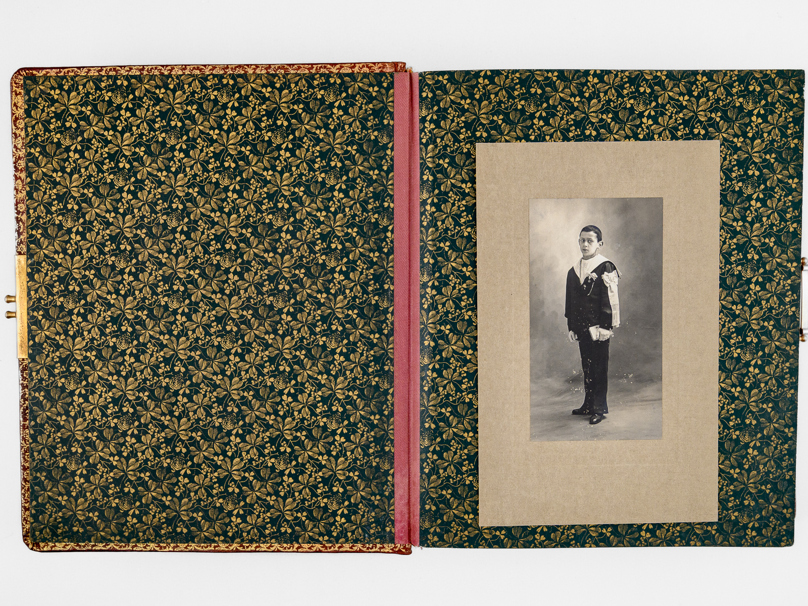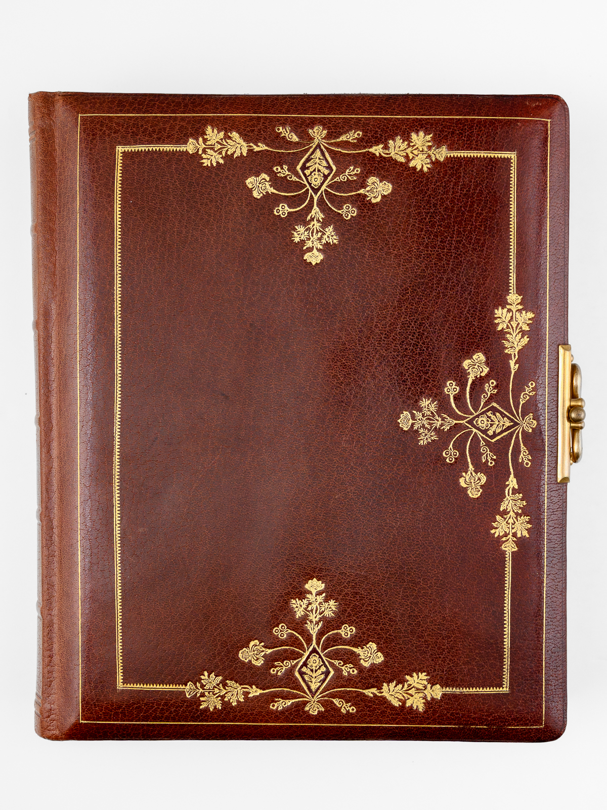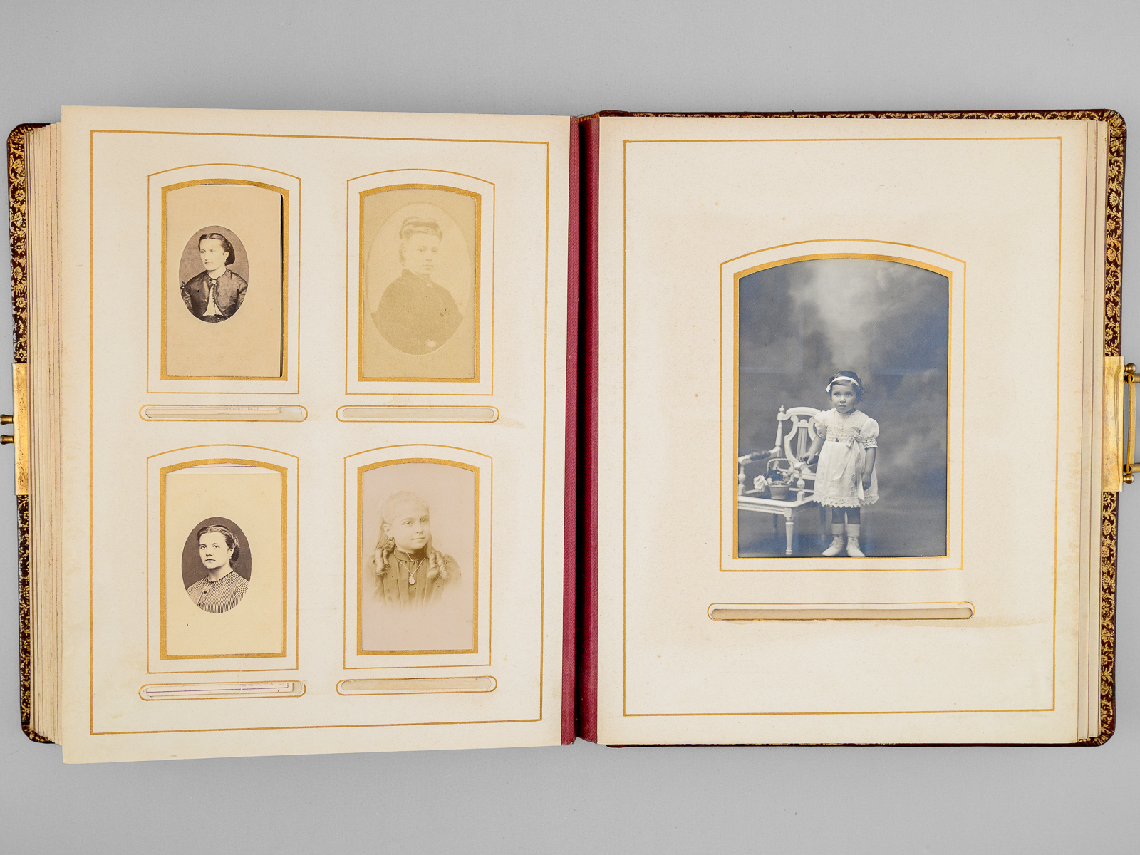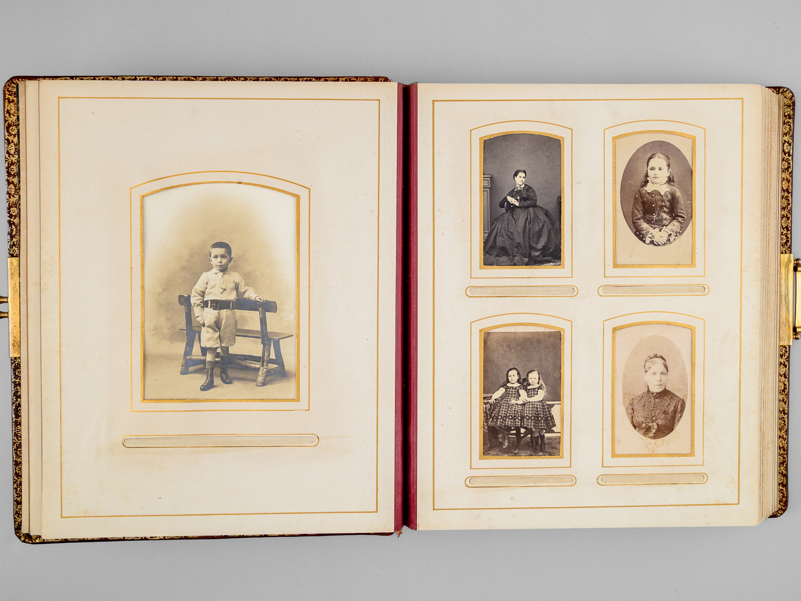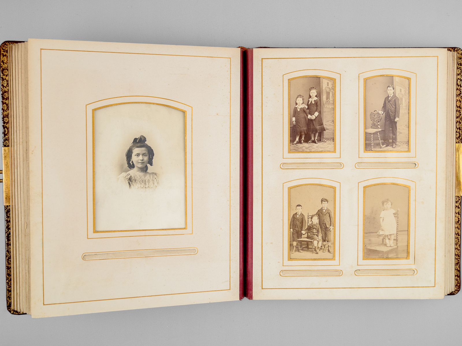 Album photos plein maroquin bordeaux, format 23,5 x 30 x 6,5 cm avec fermoir à ressort, premier plat orné, toutes tranches dorées, sans date (vers 1910), 13 planches pour insérer (5 x 2 grand format 15 x 10 cm et 8 x 8 petits formats 5 x 9 cm)
