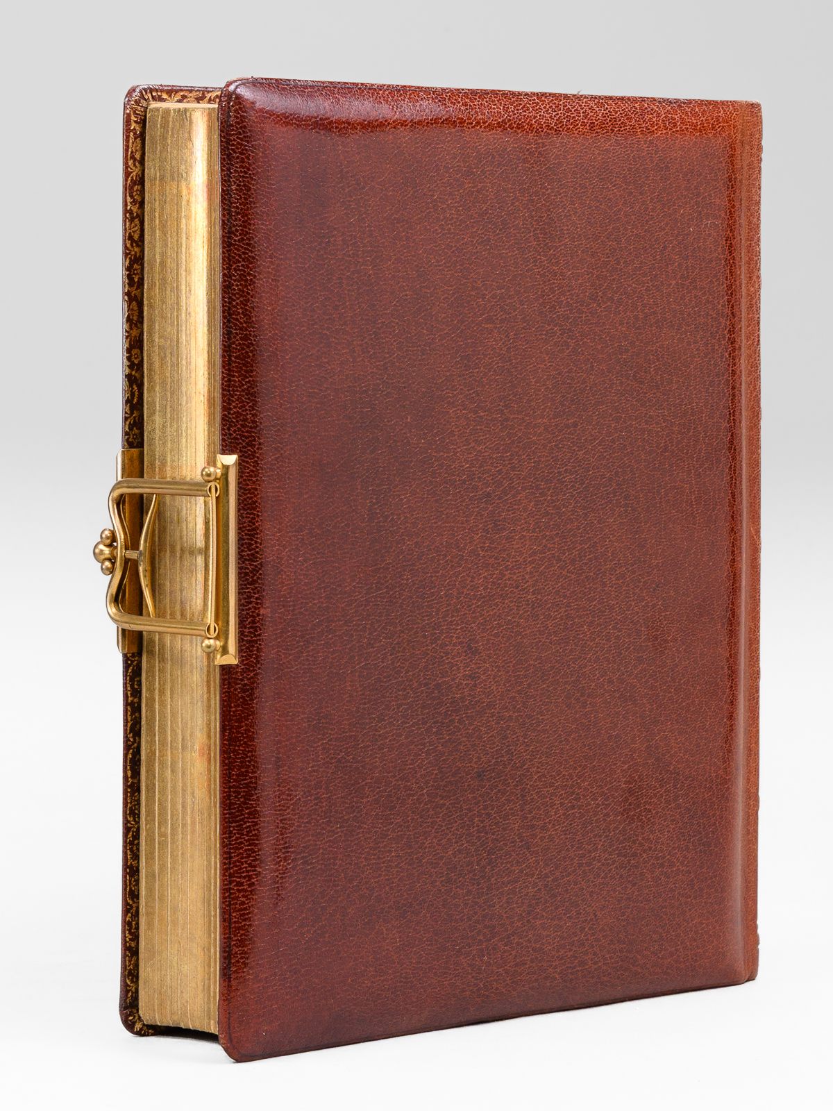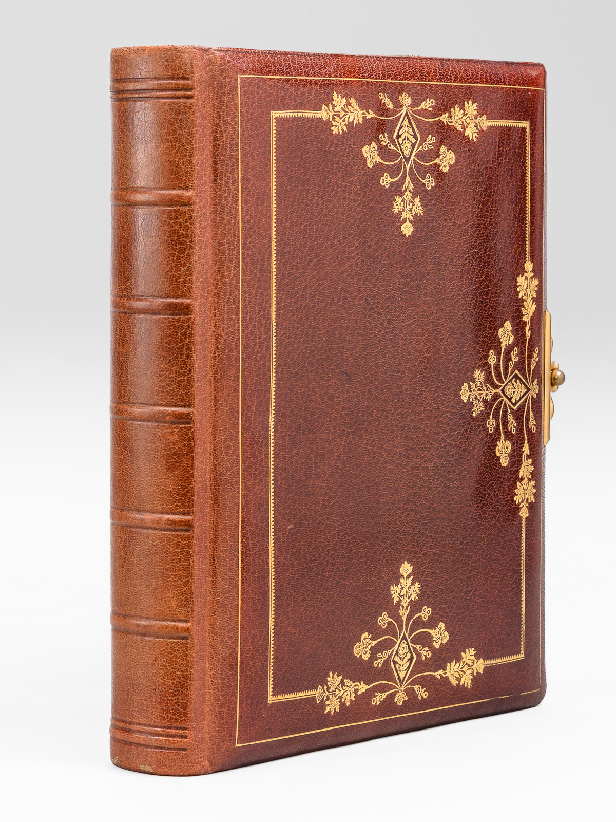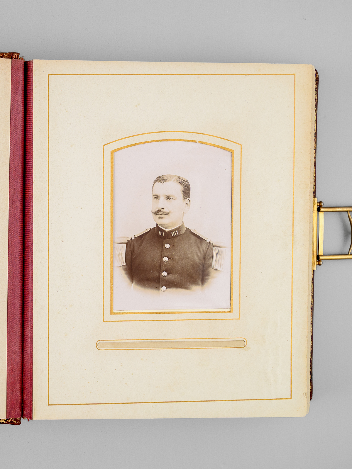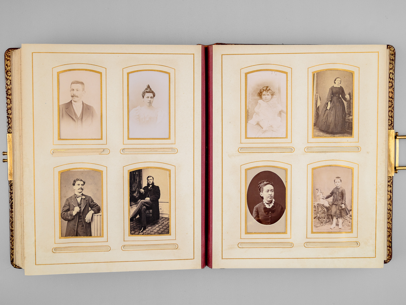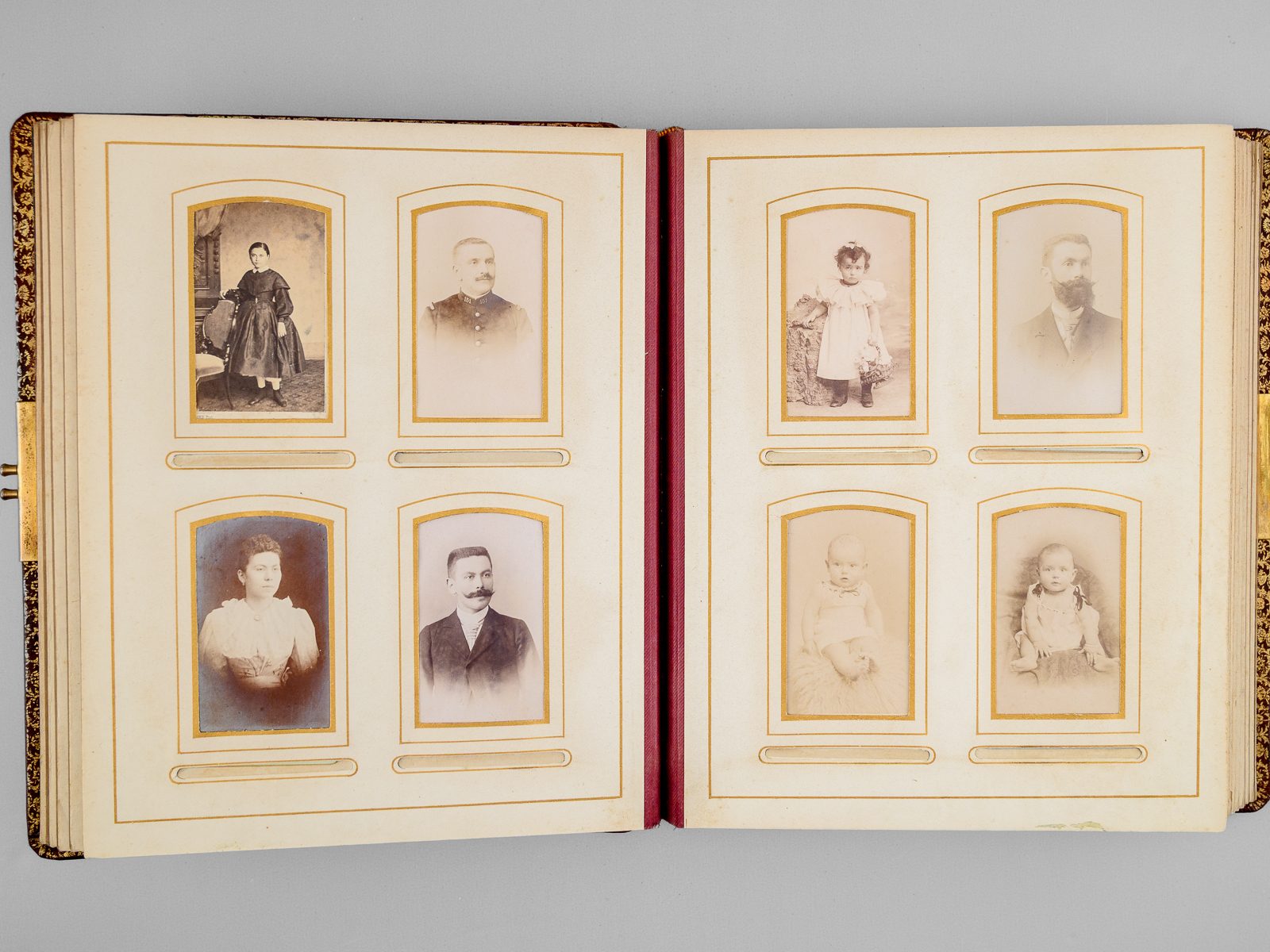 Album photos plein maroquin bordeaux, format 23,5 x 30 x 6,5 cm avec fermoir à ressort, premier plat orné, toutes tranches dorées, sans date (vers 1910), 13 planches pour insérer (5 x 2 grand format 15 x 10 cm et 8 x 8 petits formats 5 x 9 cm)