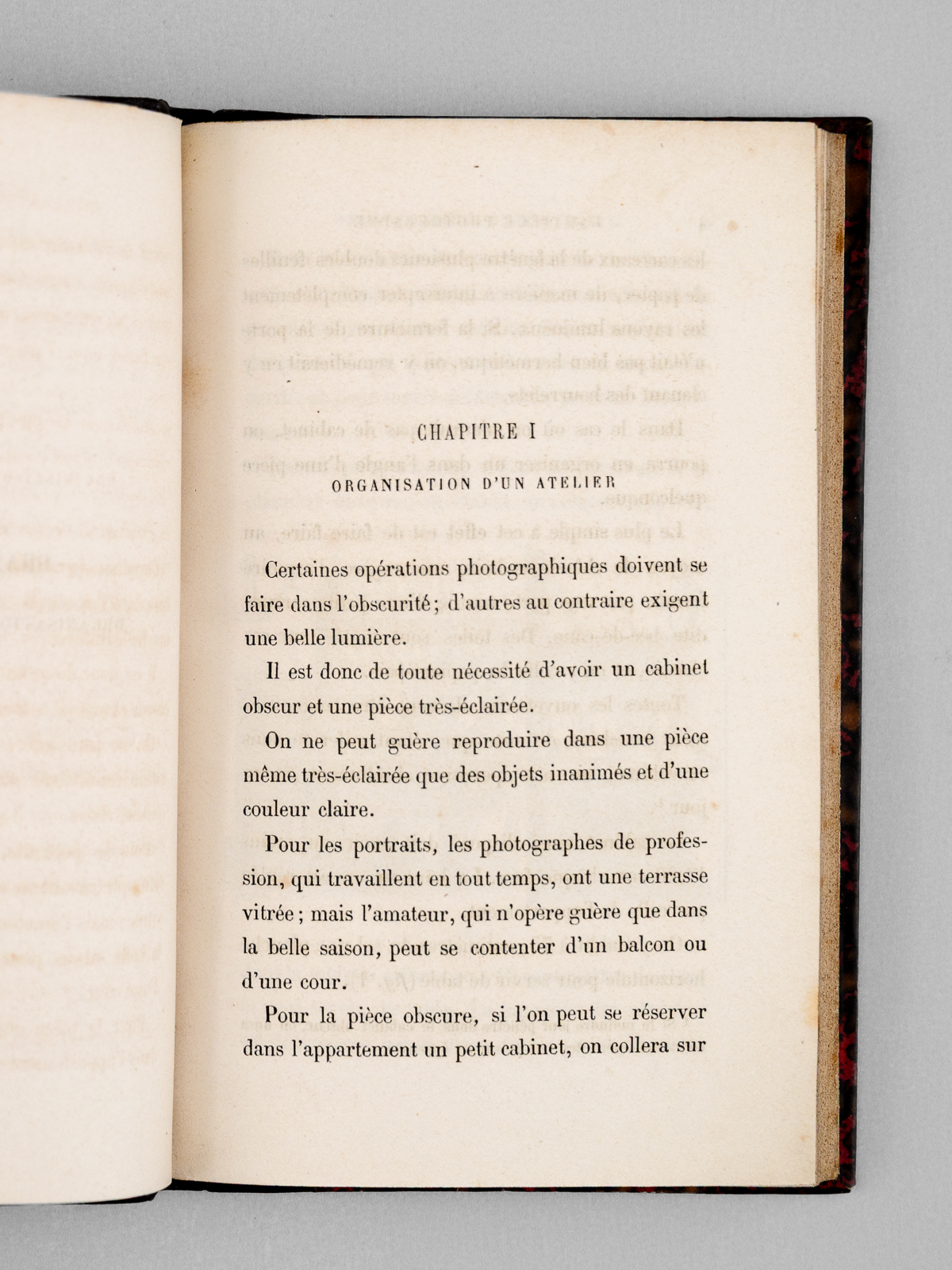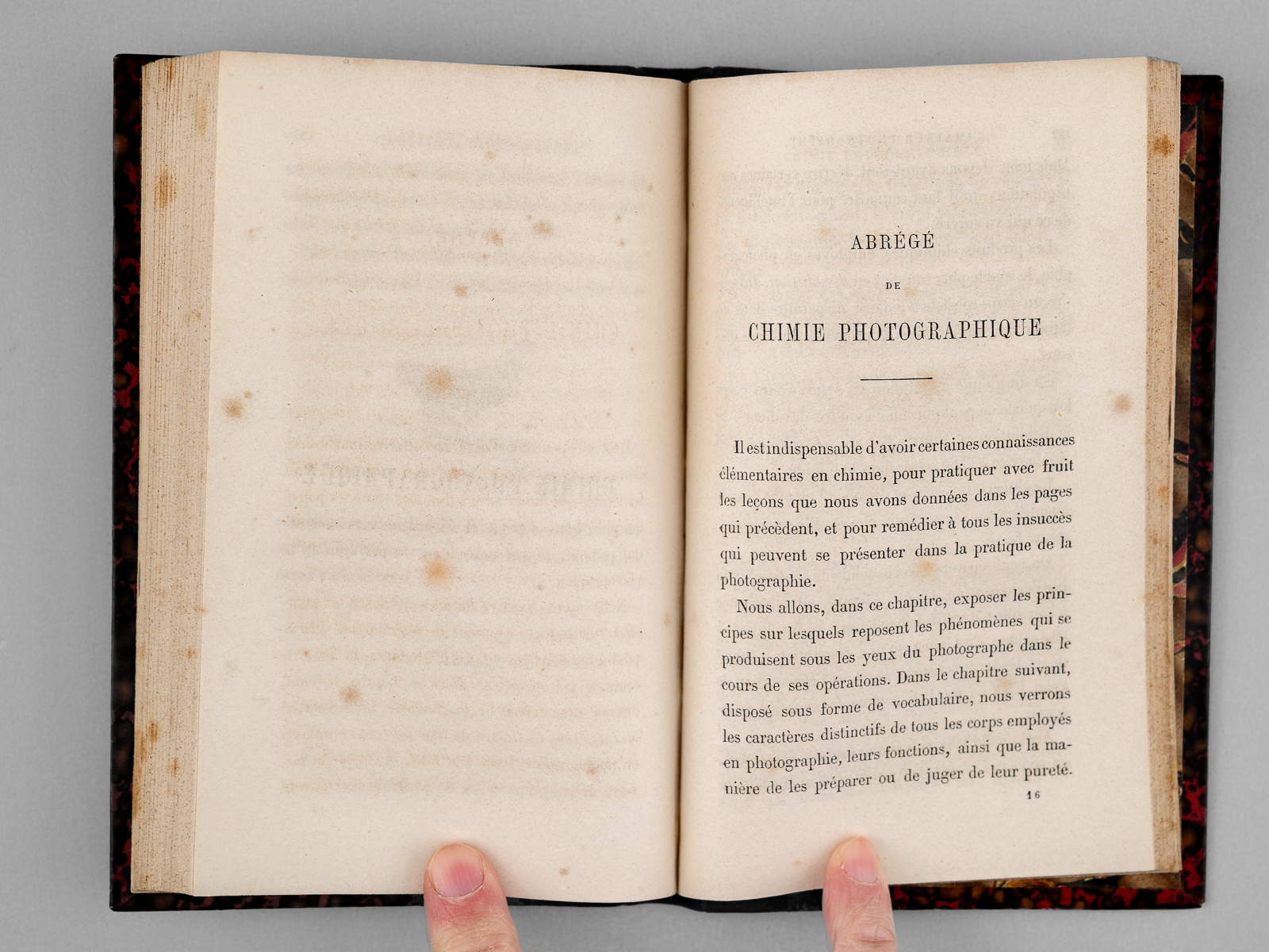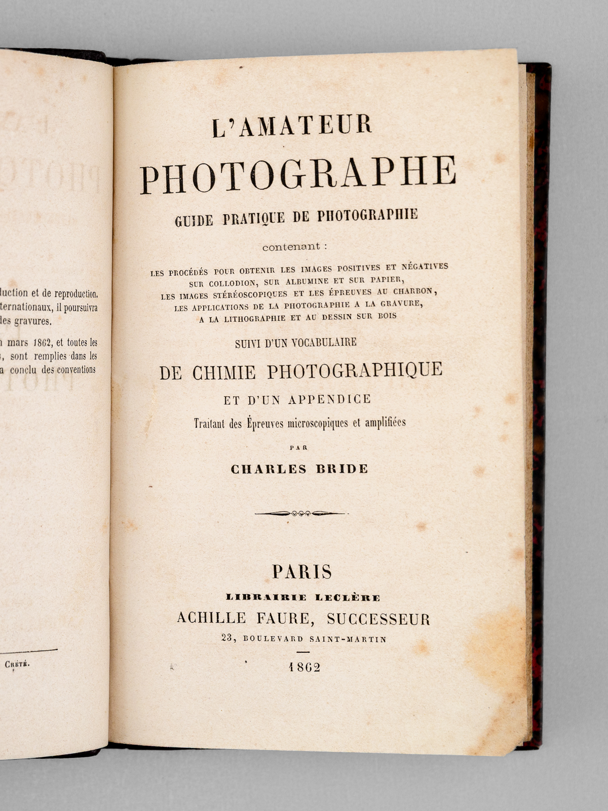 Suivi d'un vocabulaire de chimie photographique et d'un appendice traitant des épreuves microscopiques et amplifiées, 1 vol. in-12 reliure de l'époque demi-chagrin brun, dos à 5 nerfs orné, Librairie Leclère, Achille Faure, Successeur, Paris, 1862, XI-238 pp. Rappel du titre complet : L'Amateur Photographe. Guide pratique de photographie contenant : Les procédés pour obtenir les images positives et négatives sur collodion, sur albumine et sur papier, les images stéréoscopiques et les épreuves au charbon, les applications de la photographie à la gravure, à la lithographie et au dessin sur bois.