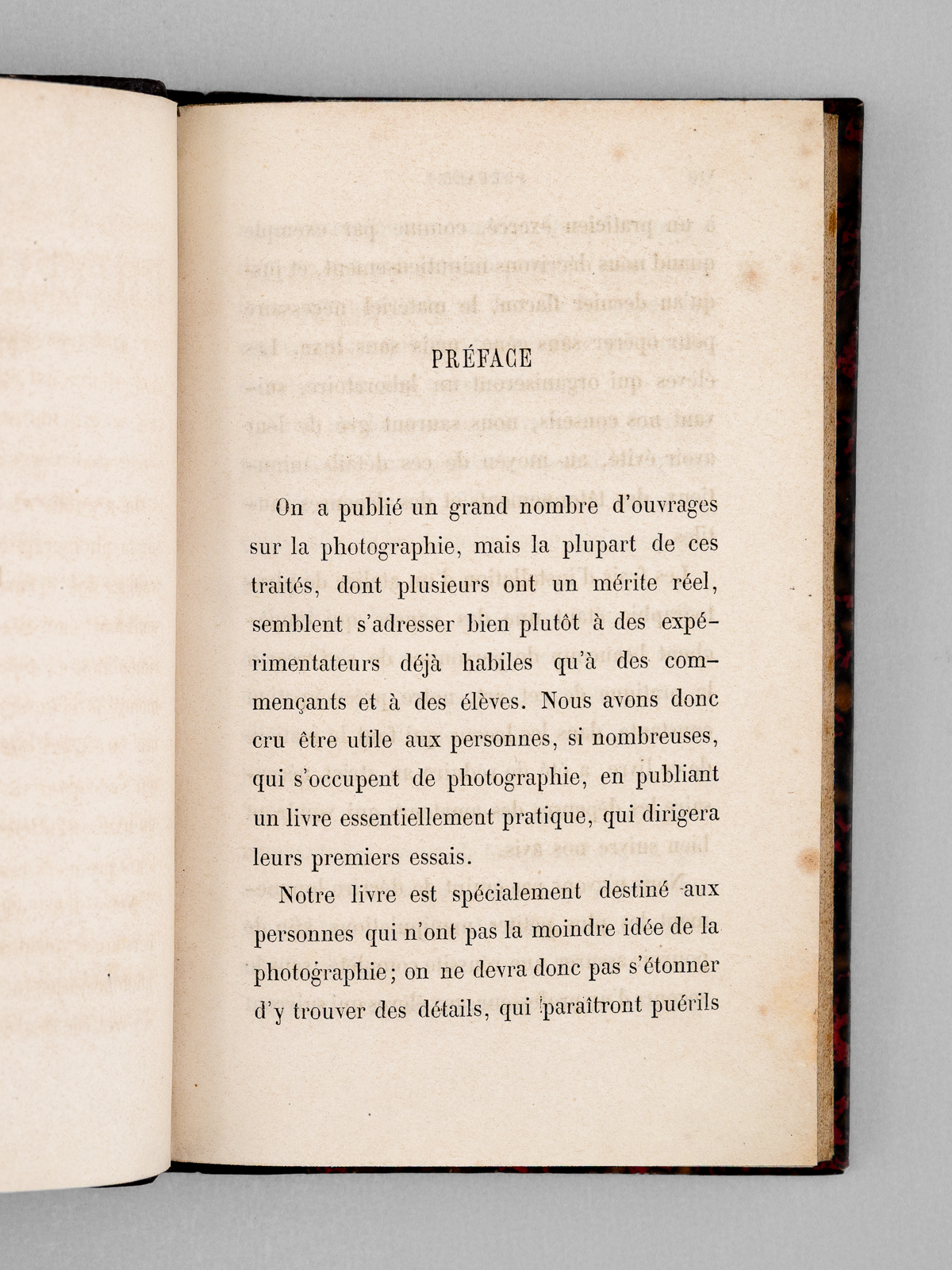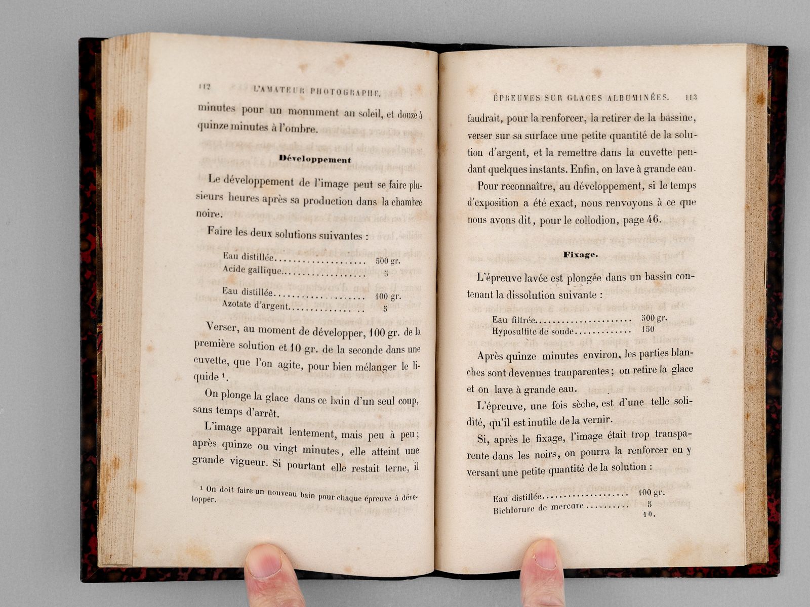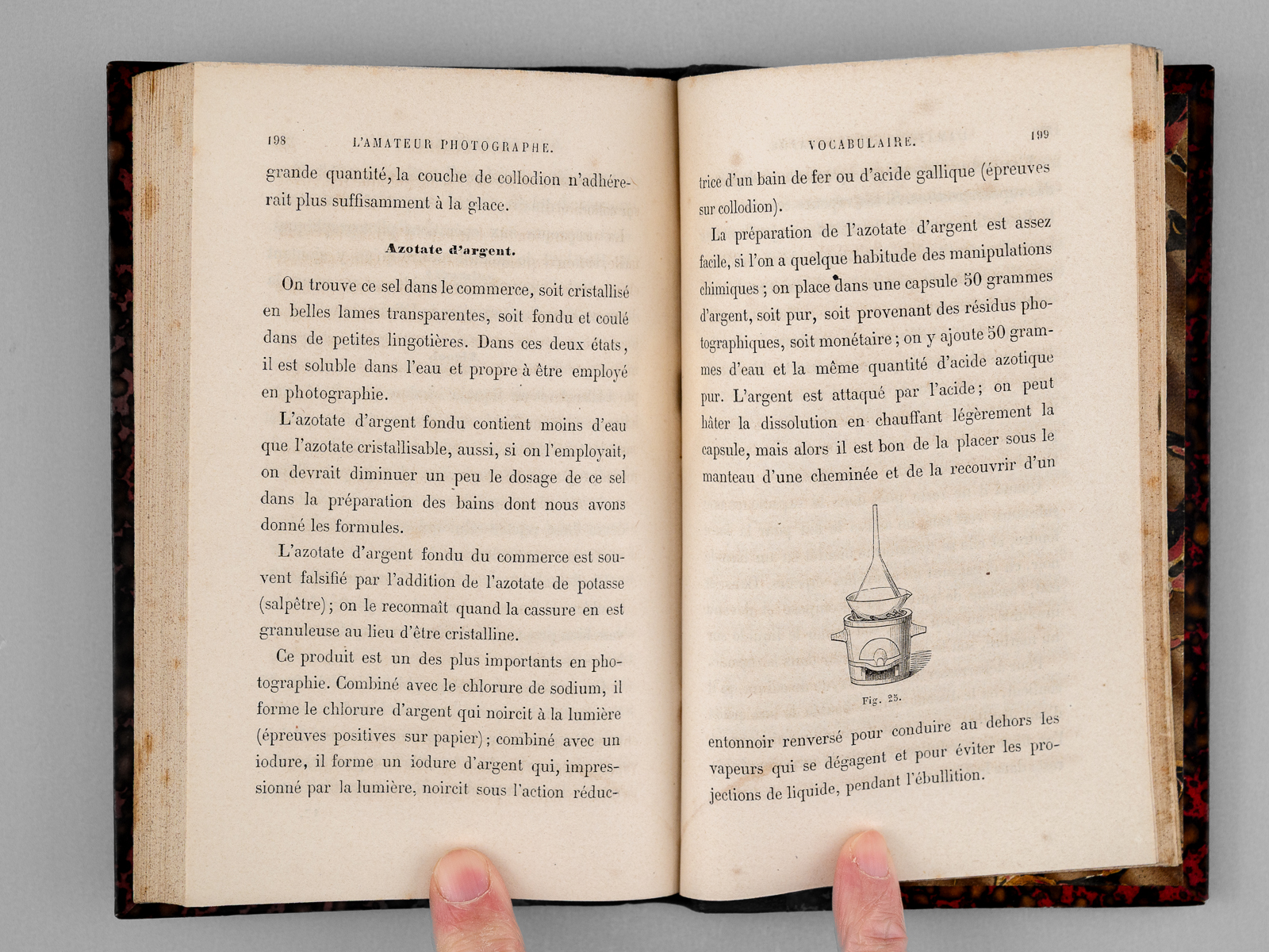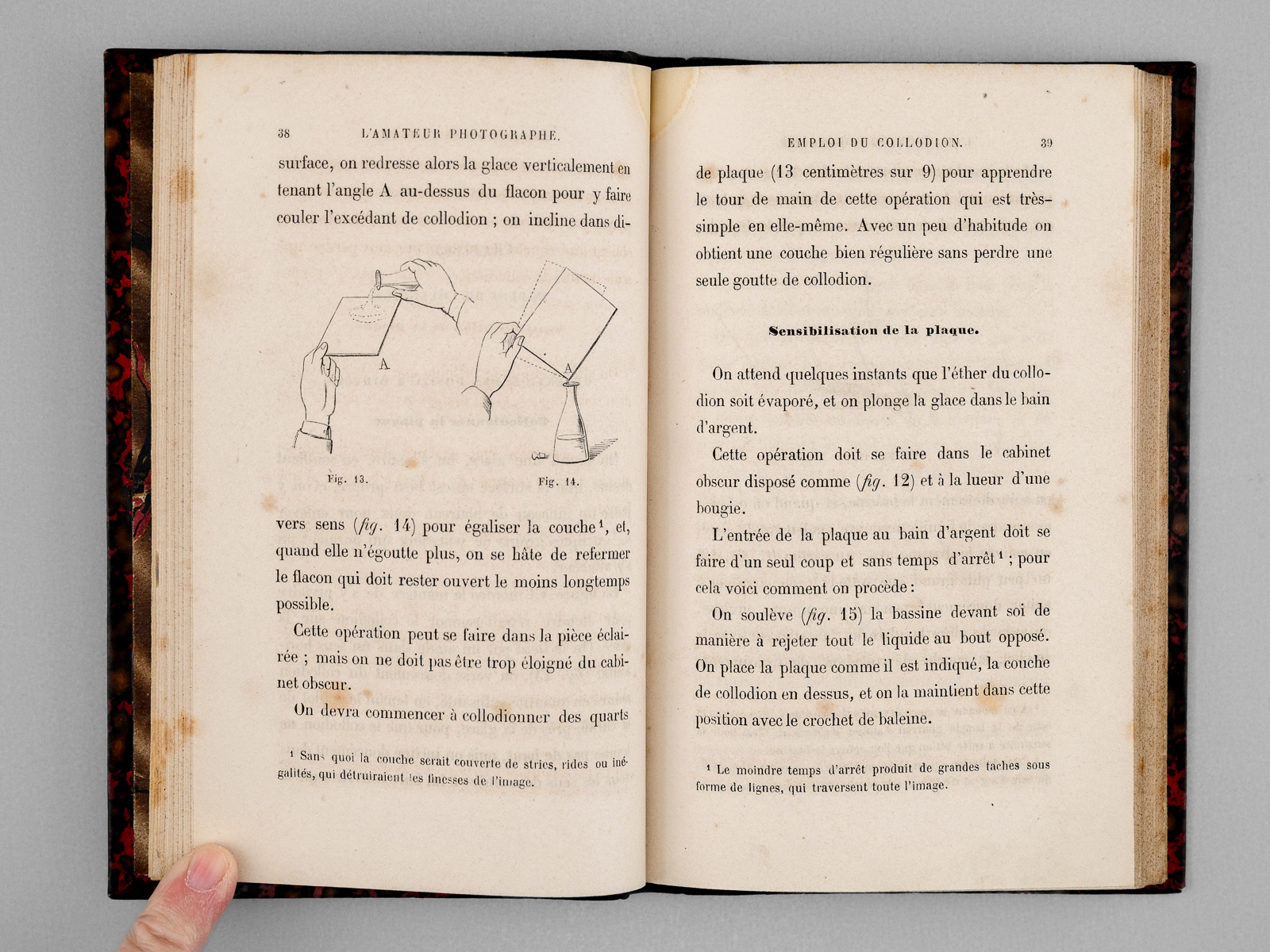 Suivi d'un vocabulaire de chimie photographique et d'un appendice traitant des épreuves microscopiques et amplifiées, 1 vol. in-12 reliure de l'époque demi-chagrin brun, dos à 5 nerfs orné, Librairie Leclère, Achille Faure, Successeur, Paris, 1862, XI-238 pp. Rappel du titre complet : L'Amateur Photographe. Guide pratique de photographie contenant : Les procédés pour obtenir les images positives et négatives sur collodion, sur albumine et sur papier, les images stéréoscopiques et les épreuves au charbon, les applications de la photographie à la gravure, à la lithographie et au dessin sur bois.