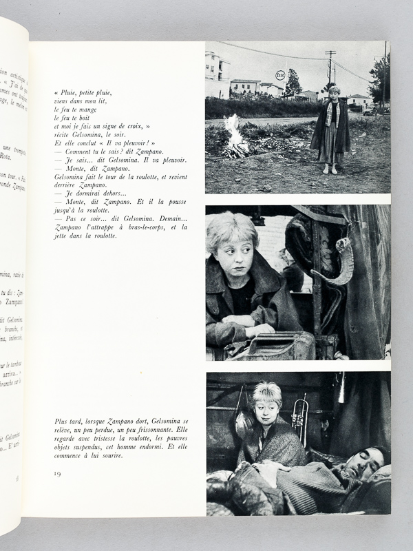 Commentaire : Bon état (petit mq. à la jaquette, bon exemplaire par ailleurs, auquel plusieurs documents et coupures de journaux relatives à Fellini on été joints). Un bel ouvrage qui propose une longue description illustré du film (dans son intégralité), des interviews avec le réalisateur, avec Giuletta Masina, etc.