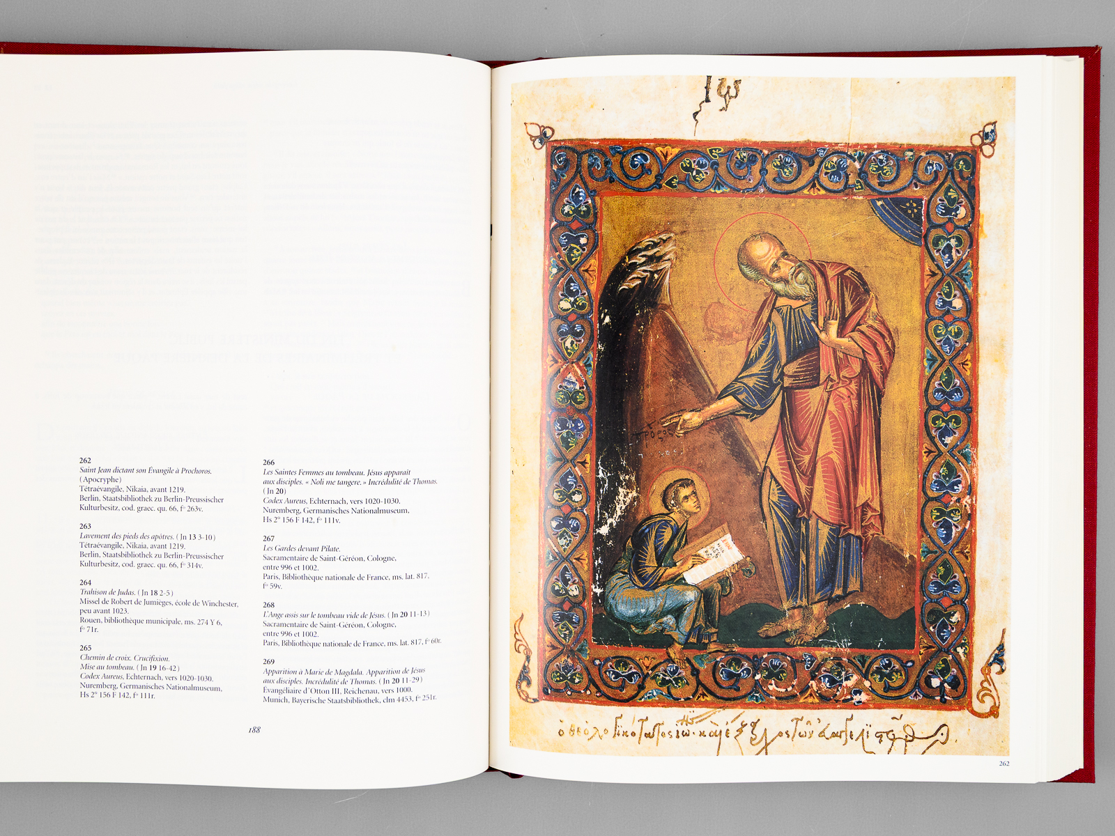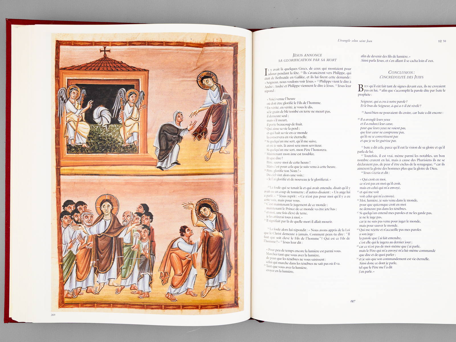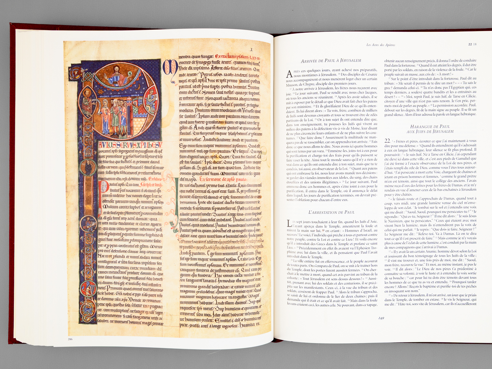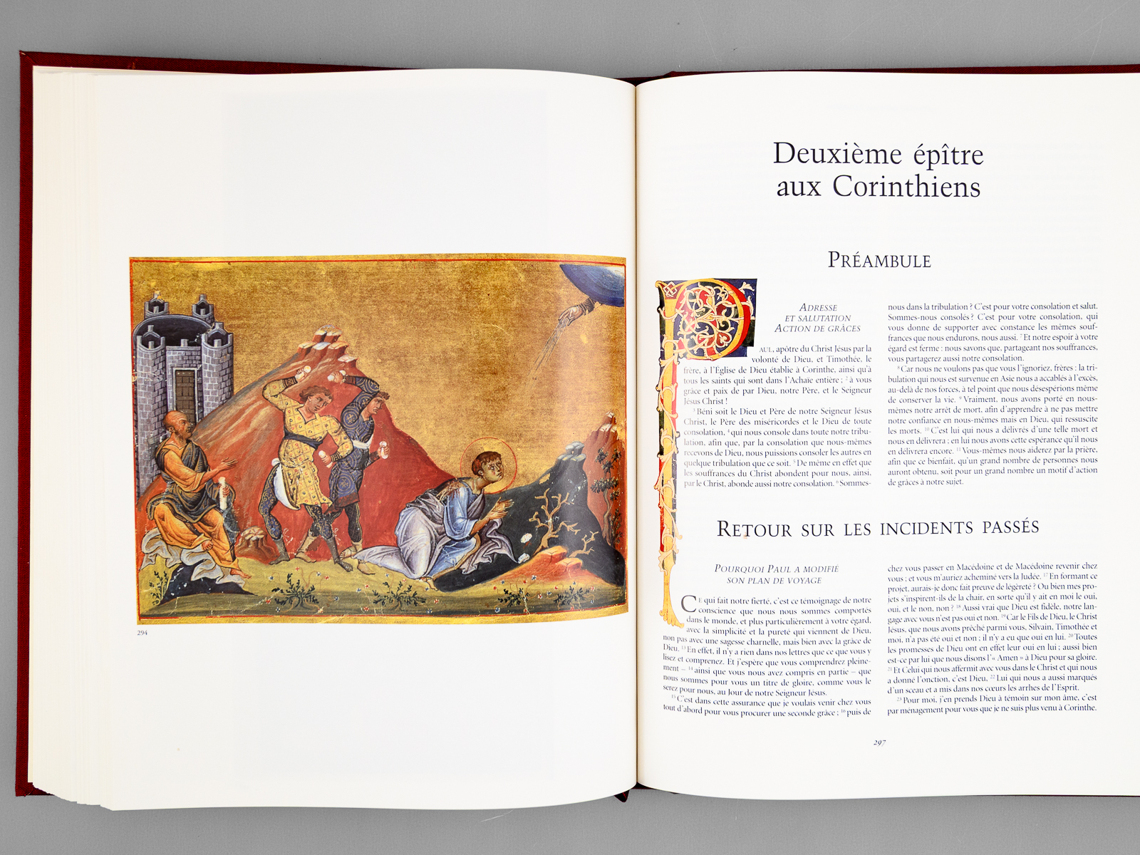 Commentaire : Le texte est celui de l'Ecole biblique de Jérusalem, les illustrations de cette magnifique édition réunissent les plus belles enluminures inspirées des Ecritures, du VIe au XIIe siècle. Bon état (qq. très petits frott. en dos, très bon état par ailleurs)