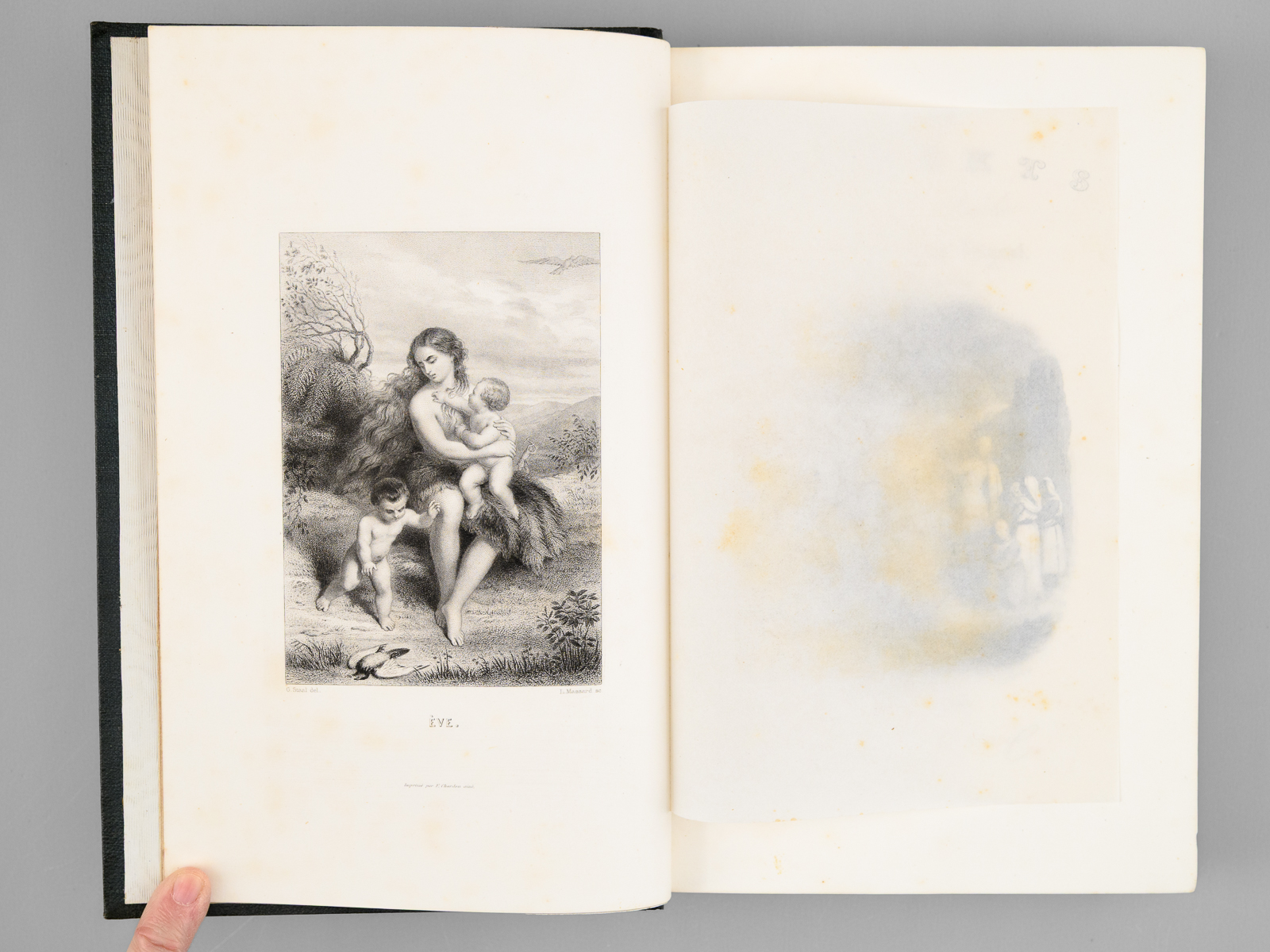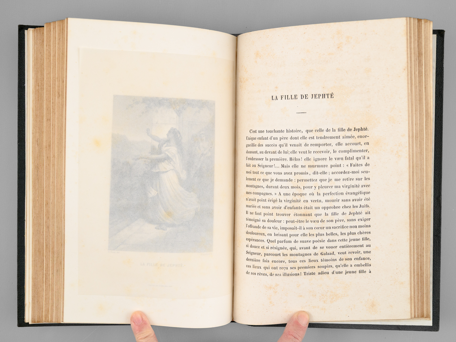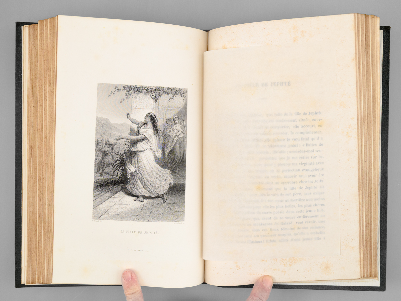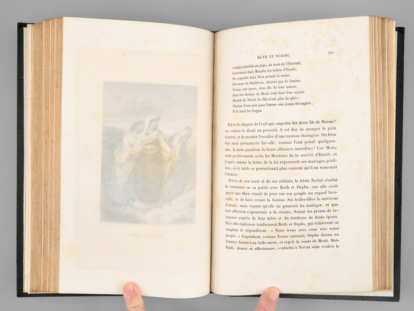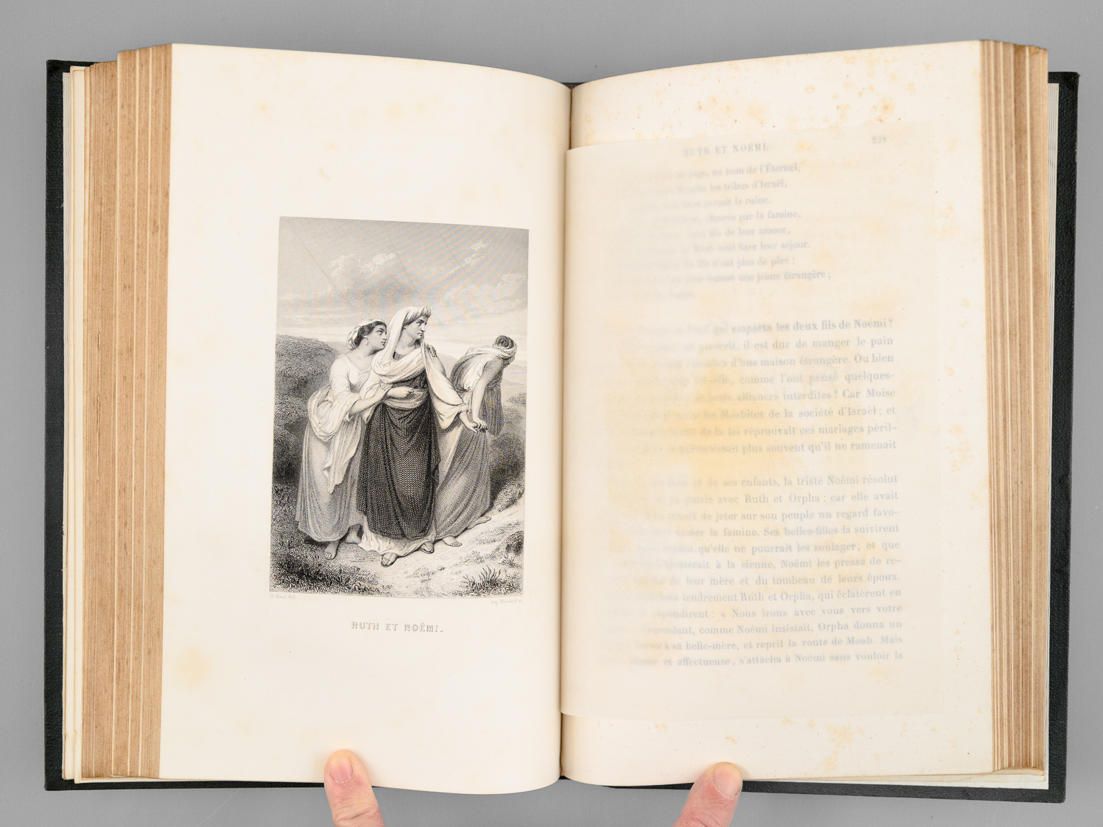 Commentaire : Belle reliure de l'époque pour cet ouvrage évoquant les figures de Caïn et Abel, Agar et Ismaël, Joseph, Moïse, Ruth et Noémi, la fille de Jephté, le fils de la Sunamite, le jeune Tobie, Esther, et les Machabées. Bon exemplaire (qq. rouss., très bel état par ailleurs).