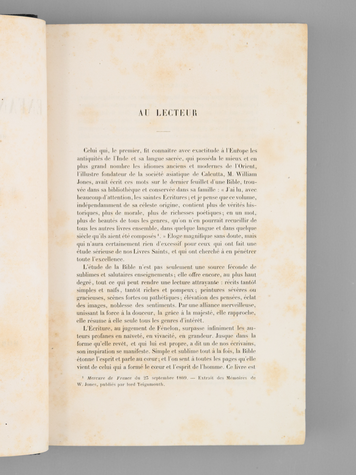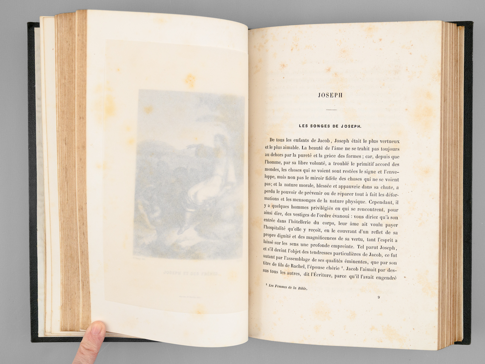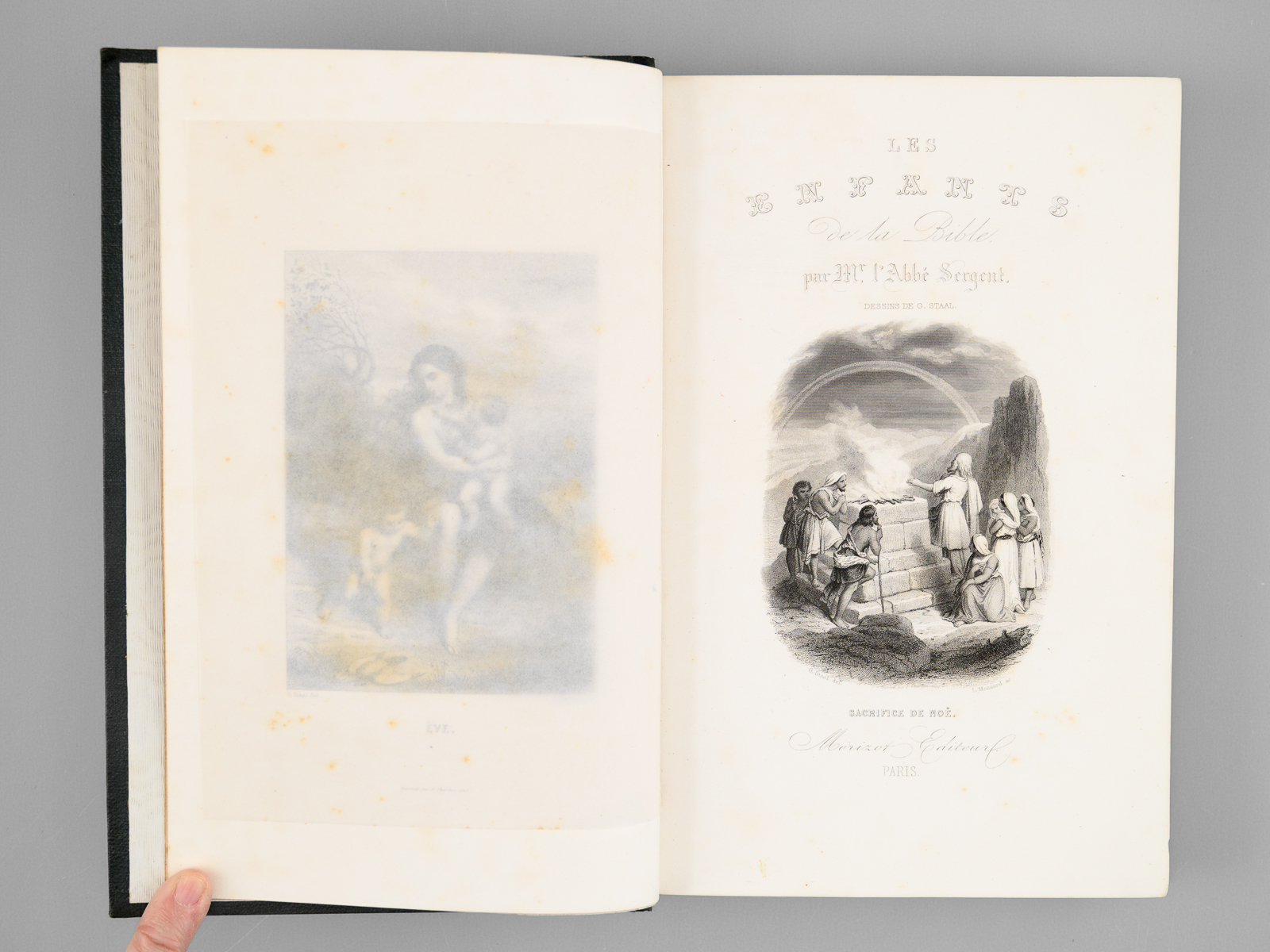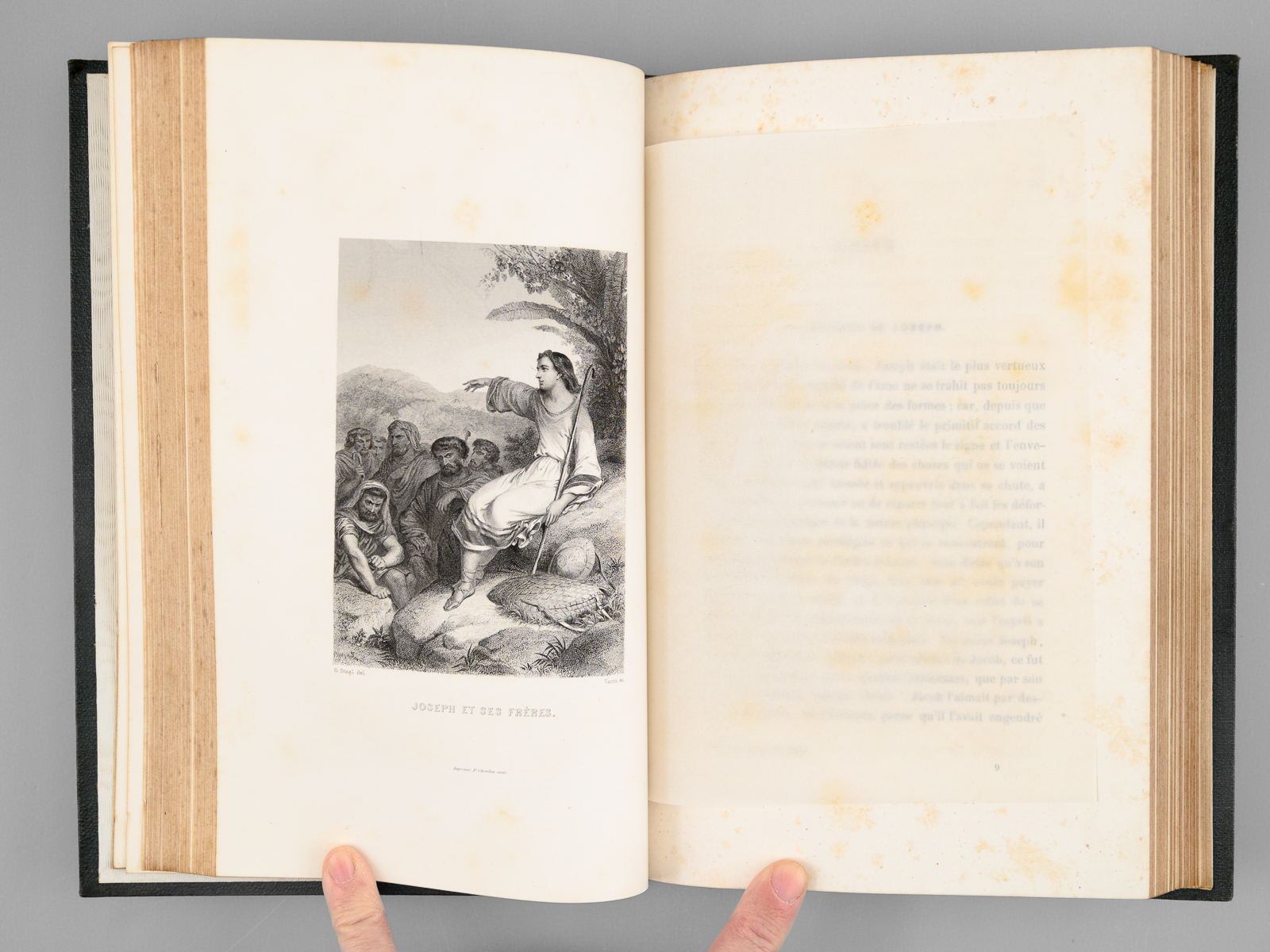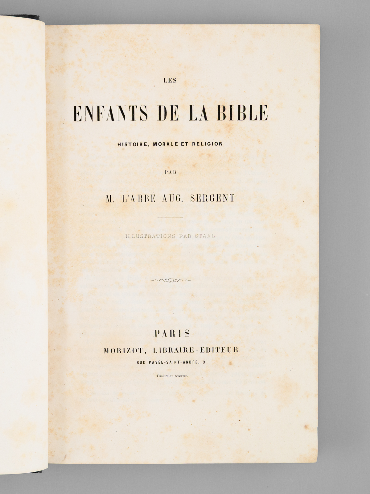 Commentaire : Belle reliure de l'époque pour cet ouvrage évoquant les figures de Caïn et Abel, Agar et Ismaël, Joseph, Moïse, Ruth et Noémi, la fille de Jephté, le fils de la Sunamite, le jeune Tobie, Esther, et les Machabées. Bon exemplaire (qq. rouss., très bel état par ailleurs).