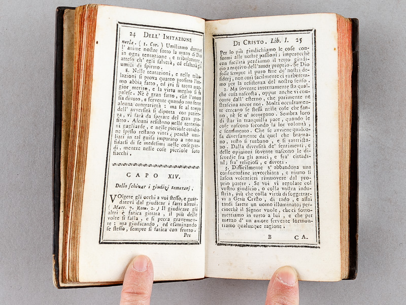Nuova Esatta traduzione, dall'abate Chiari da Pisa, 1 vol. in-12 reliure de l'poque pleine basane marron, Nella Stamperia Remondini, Venezia, 1761, frontispice, XXIV-300 pp. avec 10 planches hors texte Commentaire : Ex-libris de Giovanni Battista Zanella, sacerdote (1840). Bon état (petite piq. de vers à un mors, rel. lég. frotté, bon état par ailleurs). Backer, Imitatione, 1615