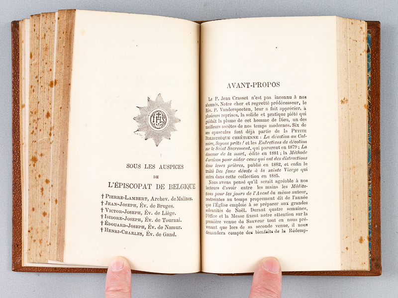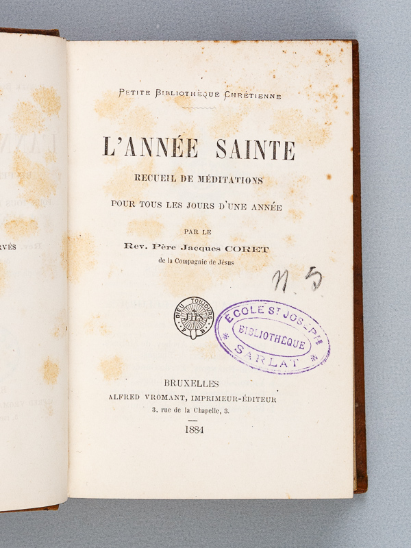 1 vol. in-12 reliure demi-basane marron, coll. Petite Bibliothèque Chrétienne, Alfred Vromant, Bruxelles, s.d. (circa 1884), 262-143-95-117 pp. Contient : L'Année Sainte. Recueil de Méditations pour tous les Jours d'une Année (Coret) [ Suivi de : ] Pensées chrétiennes pour tous les Jours du mois [ Suivi de : ] Un mois de Réflexions [ Suivi de : ] Méditations pour les Jours de l'Avent [ Suivi de : ] Méditations sur le Salve Regina (Coster)