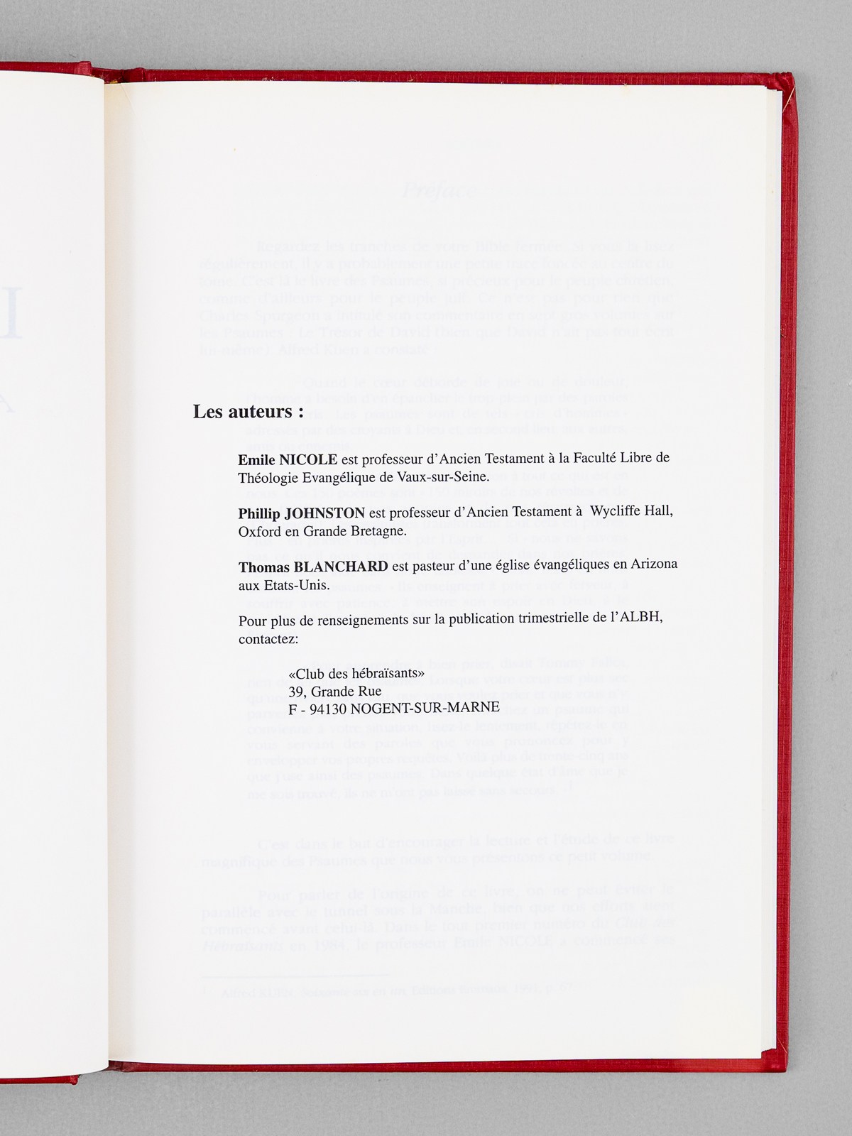 Par Emile Nicole, Philip Johnston, Thomas Blanchard, membre de l'association pour la lecture de la Bible hébraïque, 1 vol. in-8 cartonnage éditeur, Editions CLE, Lyon, 2003, 175 pp. Commentaire : Bon exemplaire