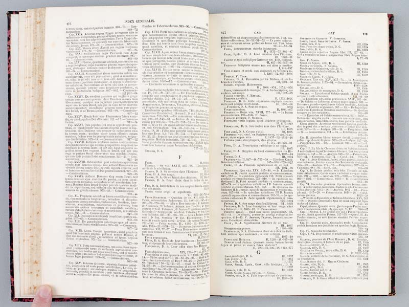 Ex. commentariis omnium perfectissimis ubique habitis, et a magna parte episcoporum necnon theologorum europe catholicae, universim ad hoc interrogatorum, designatis, unicè conflatus, plurimis annotantibus presbyteris ad docendo levitas pascendove populos altè positis. Annotavit vero simul et edidit J.P. Migne, 1 vol. in-4 reliure demi-basane bordeaux, Apud Editores, 1845, 668 pp. Contient : Tome 28 : Editores : Nomenclature des ouvrages édités dans le cours d'Ecriture Sainte - Liste alphabétique des auteurs et titres des ouvrages contenus dans le même cours - Table statistique concernant les 238 auteurs dont les écrits composent les deux cours d'Ecriture Sainte et de théologie - Exposition sommaire de l'Ecriture Sainte - Conspectus totius cursus Scripturae Sacrae - Index generalis alphabeticus, analyticus et syntheticus auctorum, operum et materiarum qui in cursu completo Scripturae Sacrae continentur ; Biblia Haraei, Index biblicus ; Biblia Vitraei, Hebraicorum, Chaldaicorum, Graecorumque nominum interpretatio ; De La Haye : Explicatio idtiotismorum - Index Scripturae verborum ; Luca Brugensis : Romanae correctiones - Lectiones in latinis Bibliis ; De La Haye : De discrimine eorum quae de dictis Domini pertulerunt evangelistae ; Biblia Vitraei, Index epistolarum et evangeliorum quae in Ecclesia leguntur ; Editores, Synopticum compendium totius eruditionis sacrae ; Biblia Vitraei, Breviarium totius chronologiae sacrae Commentaire : Tome 28 seul. Agréable exemplaire de bibliothèque (anciens cachets d'institution religieuse et étiquette de cote en garde, bon exemplaire par ailleurs).