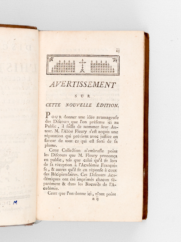Nouvelle Edition, augmentée des Discours sur le Passé des Hébreux, Sur l'Ecriture Sainte, Sur la Prédication, Sur les Libertés de l'Eglise Gallicane, On y a joint Le Discours sur le Renouvellement des Etudes Ecclésiastiques, depuis le XIV siècle, par M. l'Abbé Goujet, Chanoine de S. Jacques de l'Hôpital, 1 vol. in-12 reliure pleine basane mouchetée marron, Chez Jean-Thomas Hérissant, Paris, 1763, xix-529 pp. et 1 f. n. ch. Commentaire : Etat très satisfaisant ( coins frottés, mq. de cuir au second plat, bon état par ailleurs).