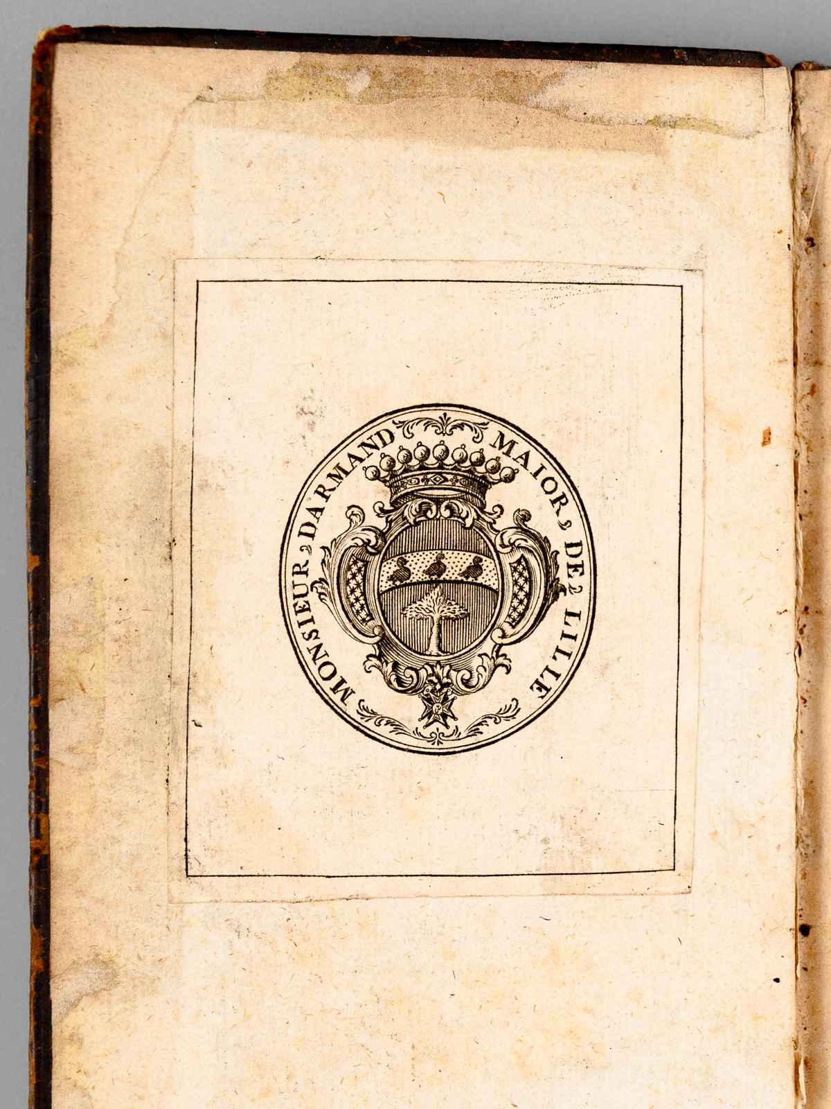 1 vol. in-12 reliure de l'époque pleine basane marron, dos à 5 nerf orné, Chez Jean Neaulme, A La Haye, 1737, 2 ff., 244 pp. et 2 ff. n. ch. Commentaire : Belle provenance, avec le bel ex-libris de 'Monsieur d'Armand Maior de Lille'. Le Mayeur, chef de la justice, présidait les assemblées des échevins. Etat très satisfaisant (reliure frottée avec mq. en coiffes et coins, sans la première garde volante, bon état par ailleurs).