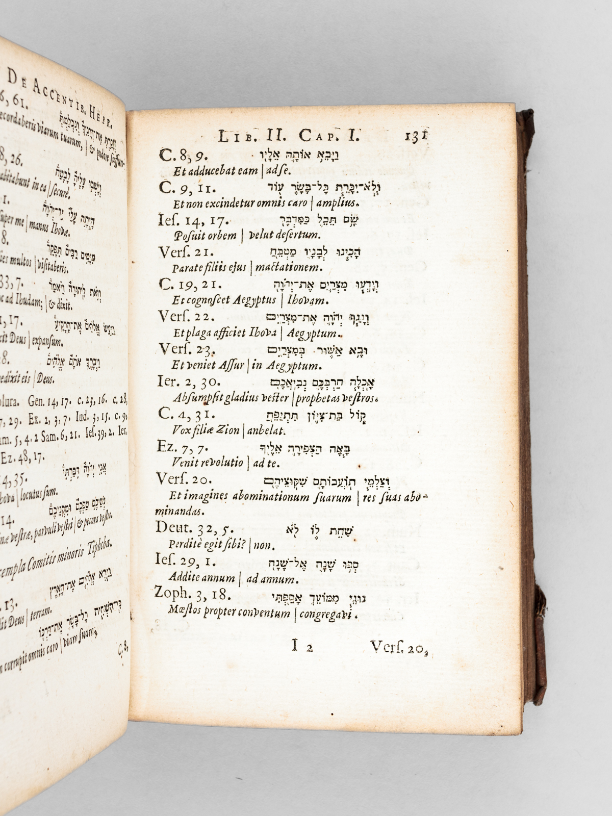 Nunc primum inventa Iuculenta methodo accuratissimè exponitur. Opus ad interpretationem divinarum litterarum inprimis necessarium, Autore M. Caspare Ledebuhrio, Coslino Pomerano, 1 vol. in-12 reliure de 'lépoque plein vélin blanc, Ex Officina Ioannis Maire, Lugduni Batavorum [ Leyde ], 1647, 12 ff., 1 tableau dépliant et 543 pp. Commentaire : Rare traité de vocalisation de l'hébreu. Etat très satisfaisant (manque au vélin en coupes, discrète mouill. marginale, bon état par ailleurs). 'Caspar Ledeburh took a great stride forward with his book. [... ] This is a systematic and well designed book comprising abundant material. He discusses the prose accents as well as the poetical accents, not separarely but in juxtaposition. He is the first scholar to have given thought not only to the interpretation of the sequence of accents actually found in the Biblical text, but also to the theoretical aspects : the different possibilities of accentuating a sentence, any sentence, according to the final disjunctive accent applied ; the different syntactical possibilities of the order of words in a sentence, and how a sentence should be accentuated in each case [...] Exhaustive and original a study as it is, this book does not cease being what it intended to be - a textbook' (Wickes, Two treatises on the accentuation of the old Testament, p. X),